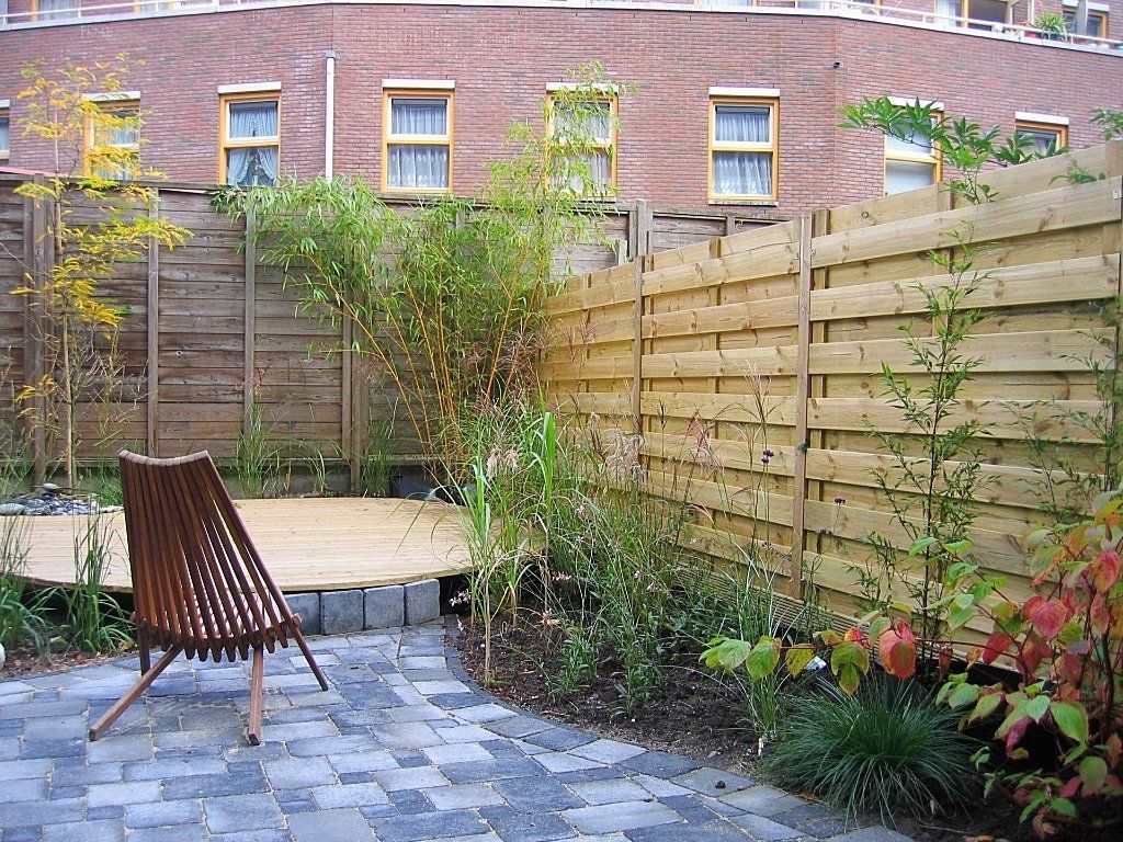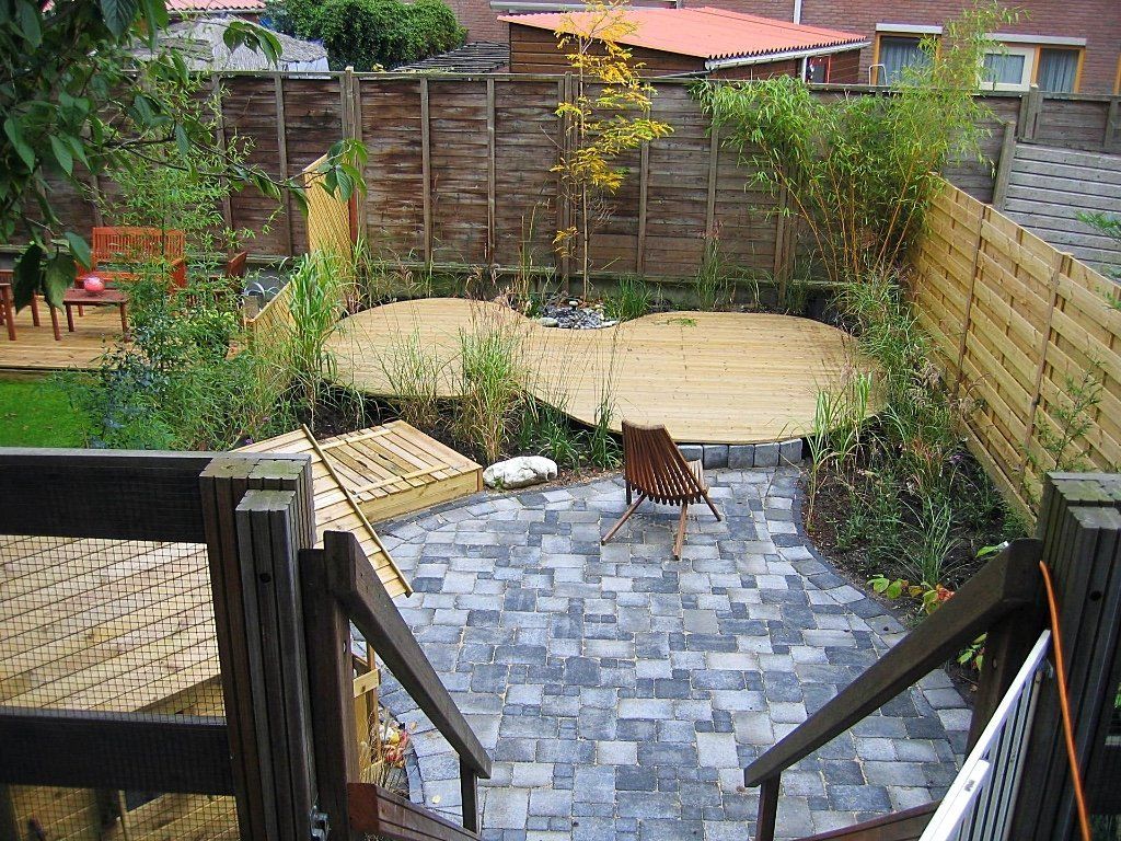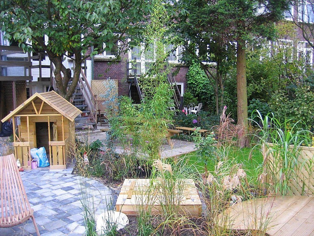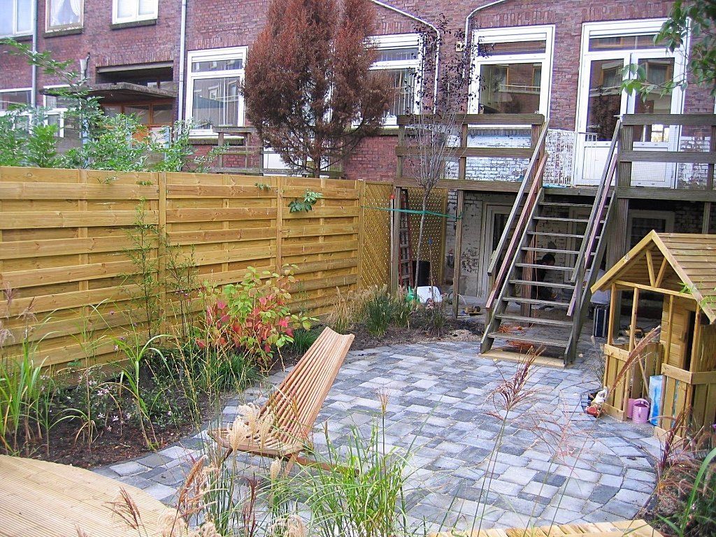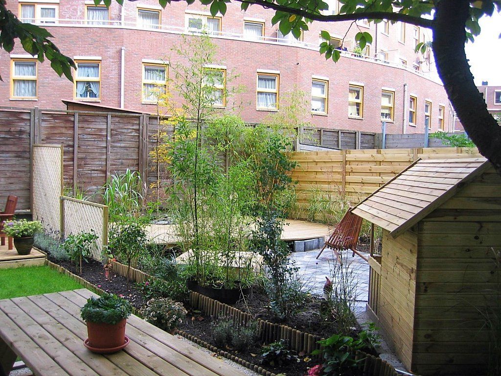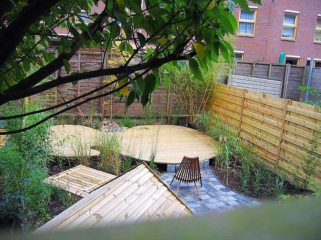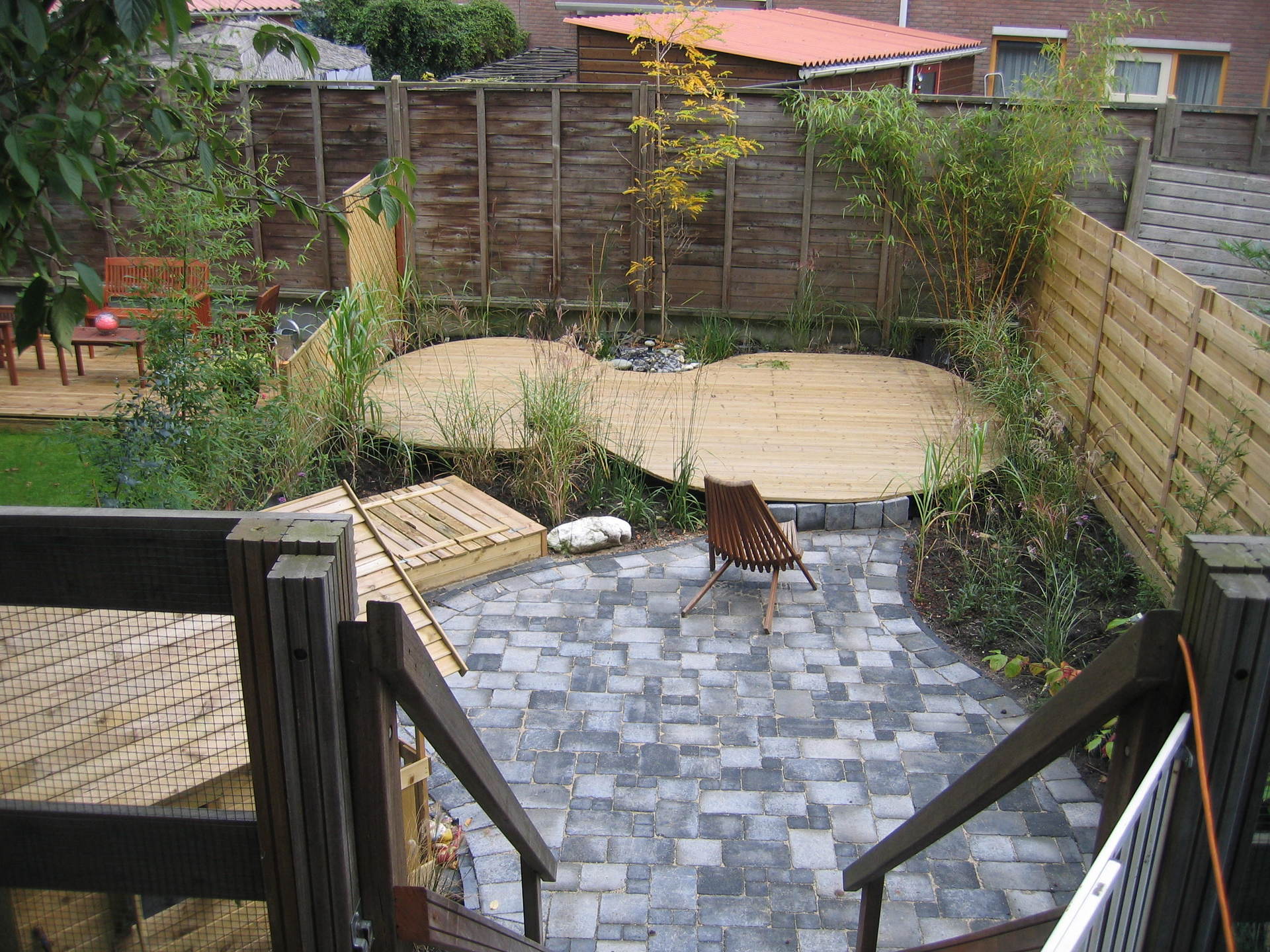De basis van dit speels ontwerp was bamboe en grassen. Dat vlonders niet altijd recht hoeven te zijn bewijst deze fantasievolle vlonder wel. Van rechte planken uitgezaagde ronde vormen, alles is realiseerbaar! De bestrating is van wildverband en heeft ook allerlei ronde vormen. Beplanting, schuttingen en speelhuis en zandbak voor de kinderen maakt dat deze tuin in z'n geheel uitnodigt tot nieuwsgierig zijn!