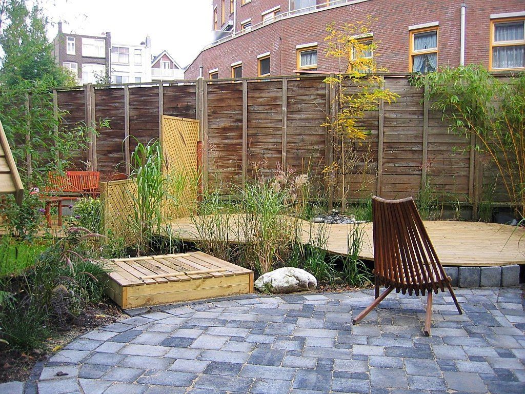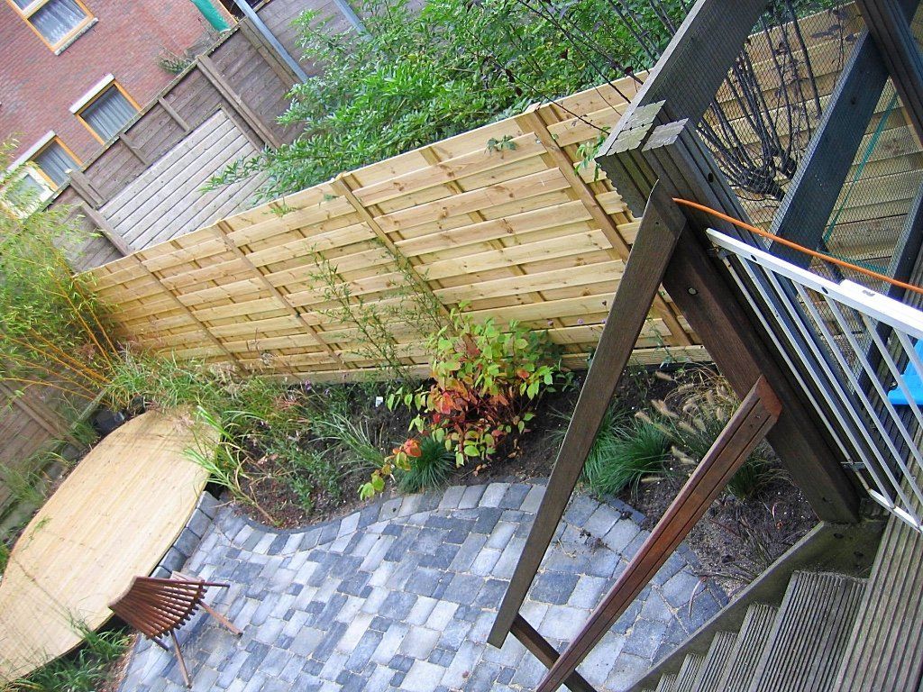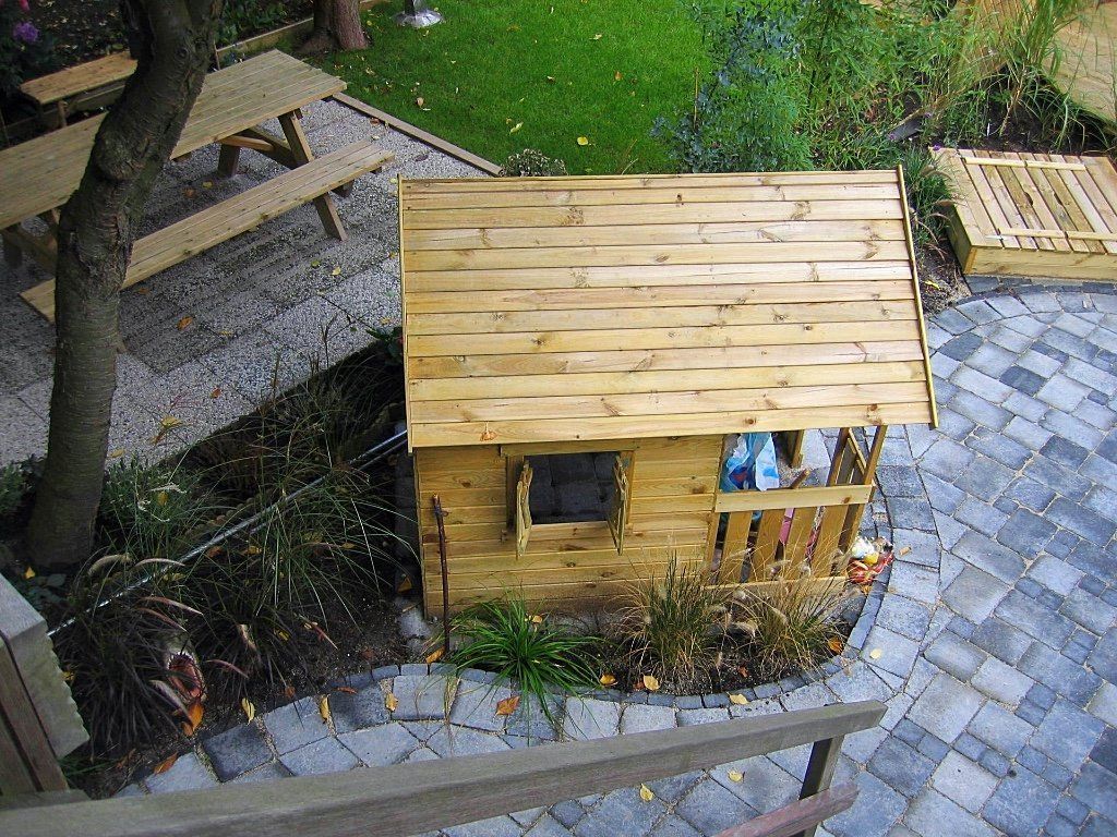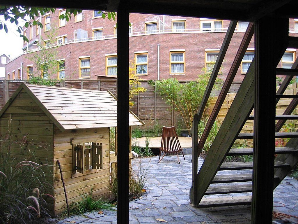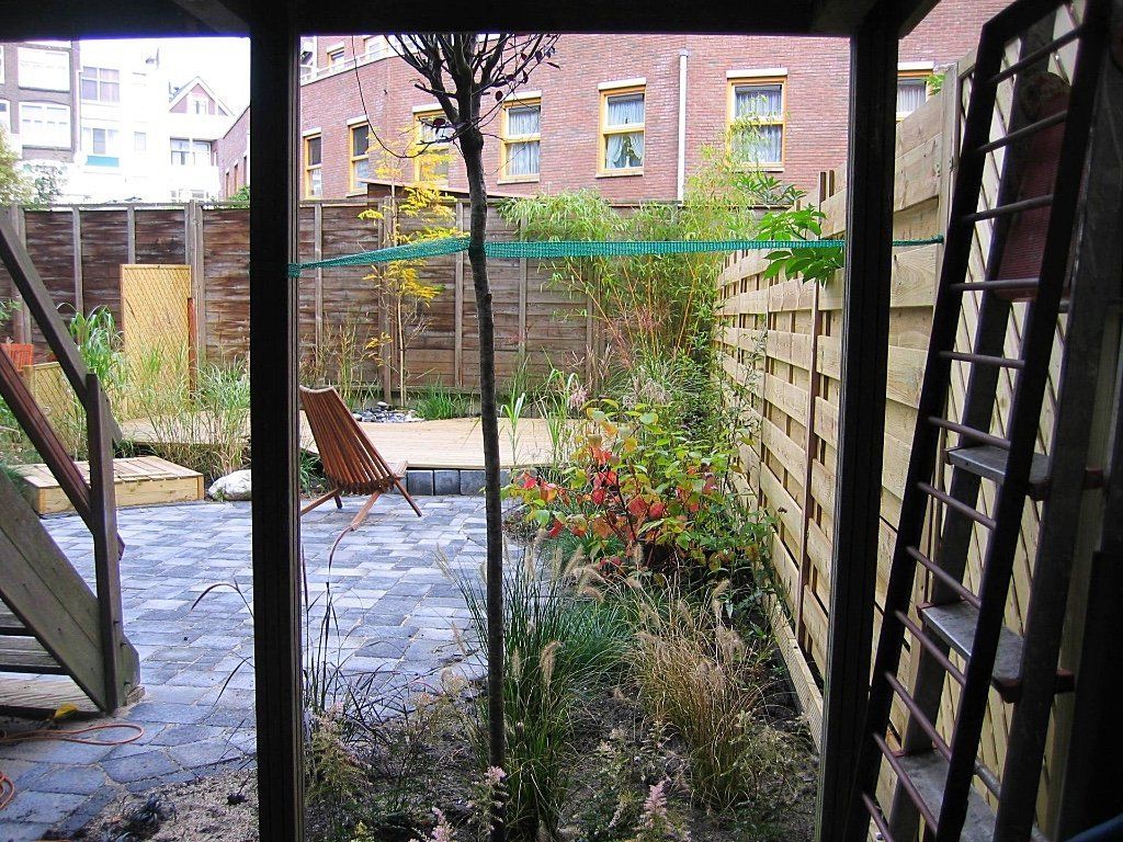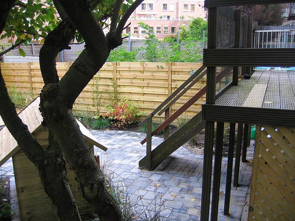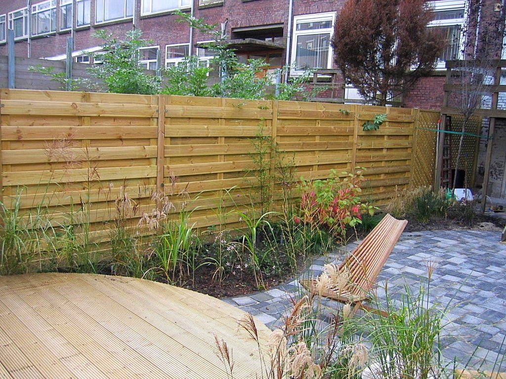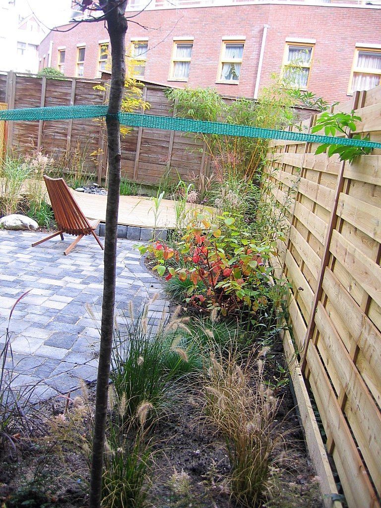 De basis van dit speels ontwerp was bamboe en grassen. Dat vlonders niet altijd recht hoeven te zijn bewijst deze fantasievolle vlonder wel. Van rechte planken uitgezaagde ronde vormen, alles is realiseerbaar! De bestrating is van wildverband en heeft ook allerlei ronde vormen. Beplanting, schuttingen en speelhuis en zandbak voor de kinderen maakt dat deze tuin in z'n geheel uitnodigt tot nieuwsgierig zijn!