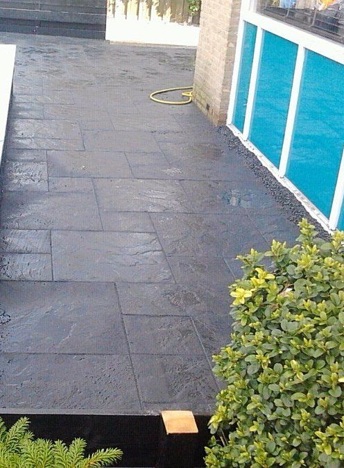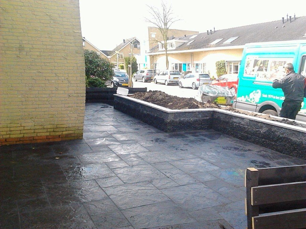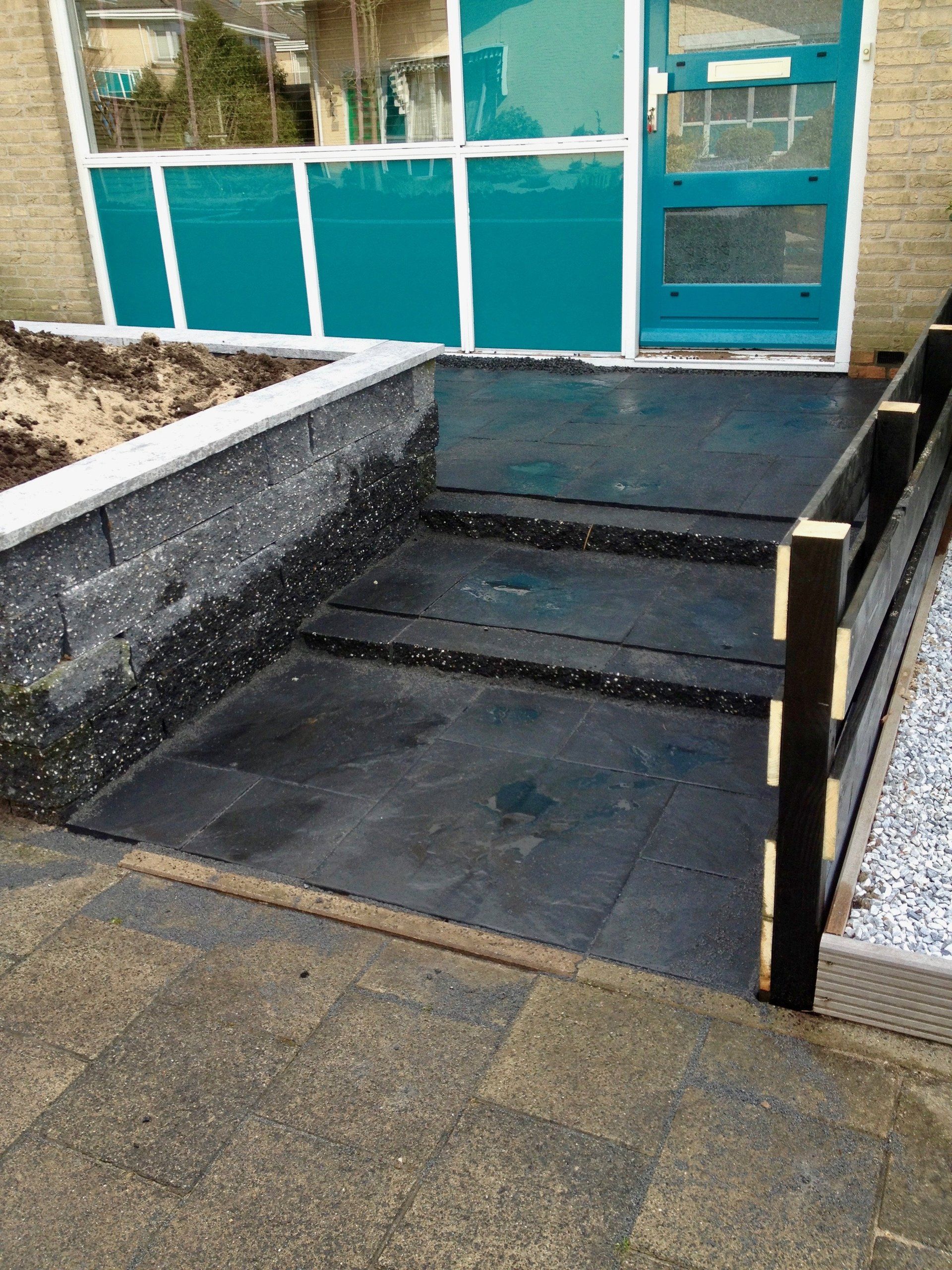Wildverband van betonbestrating en blokken gestapeld voor een verhoogde border en tevens als afscheiding van de voortuin.