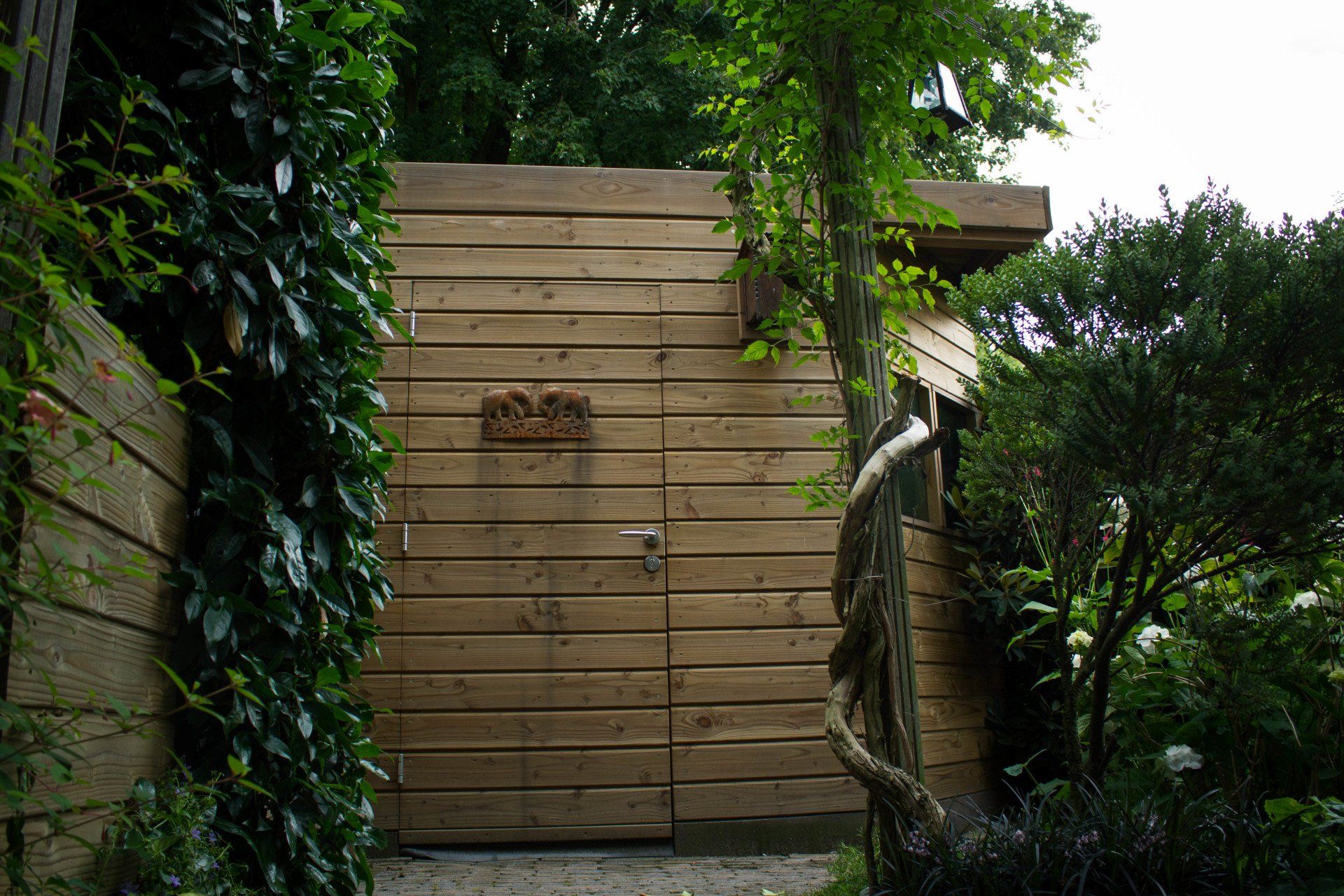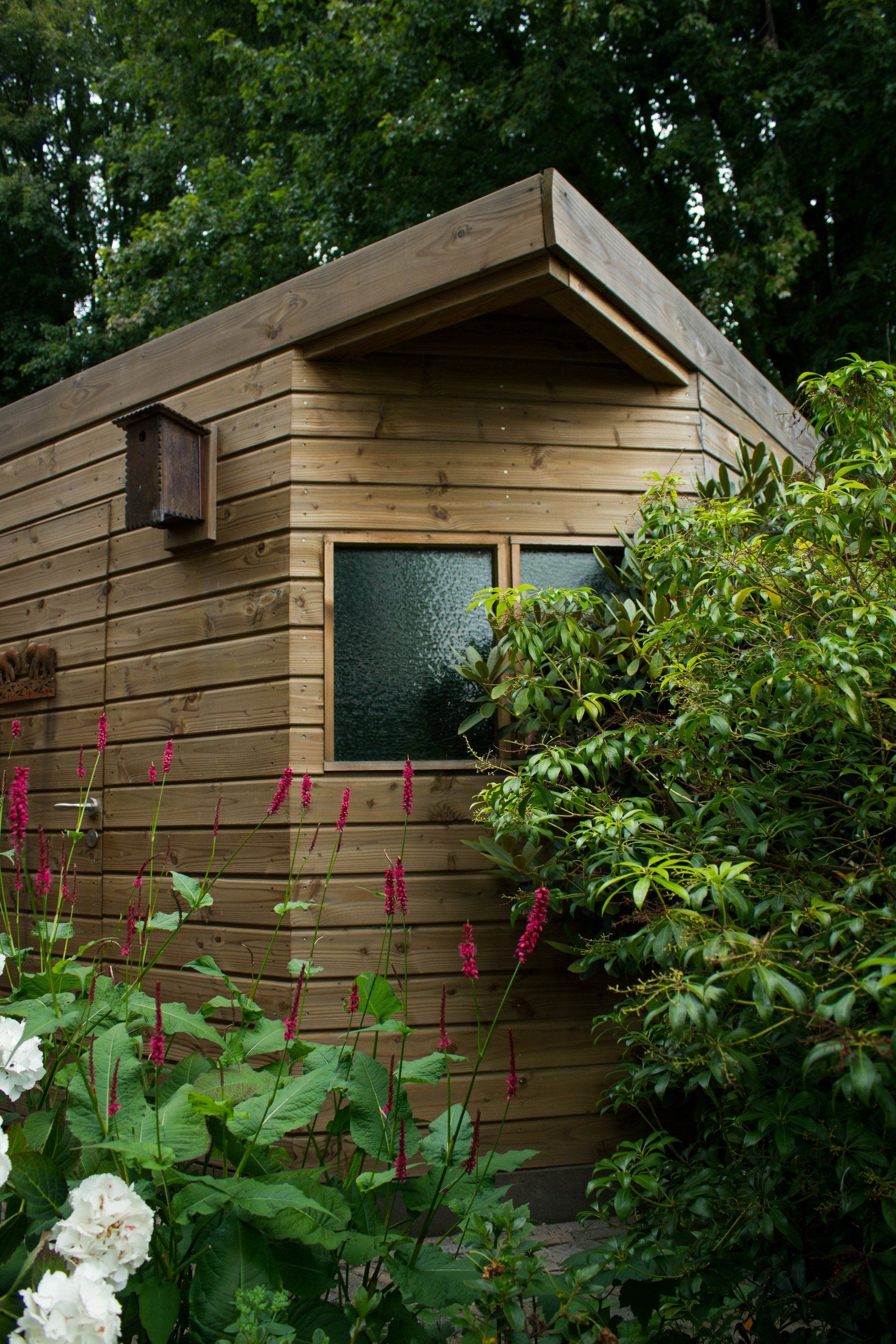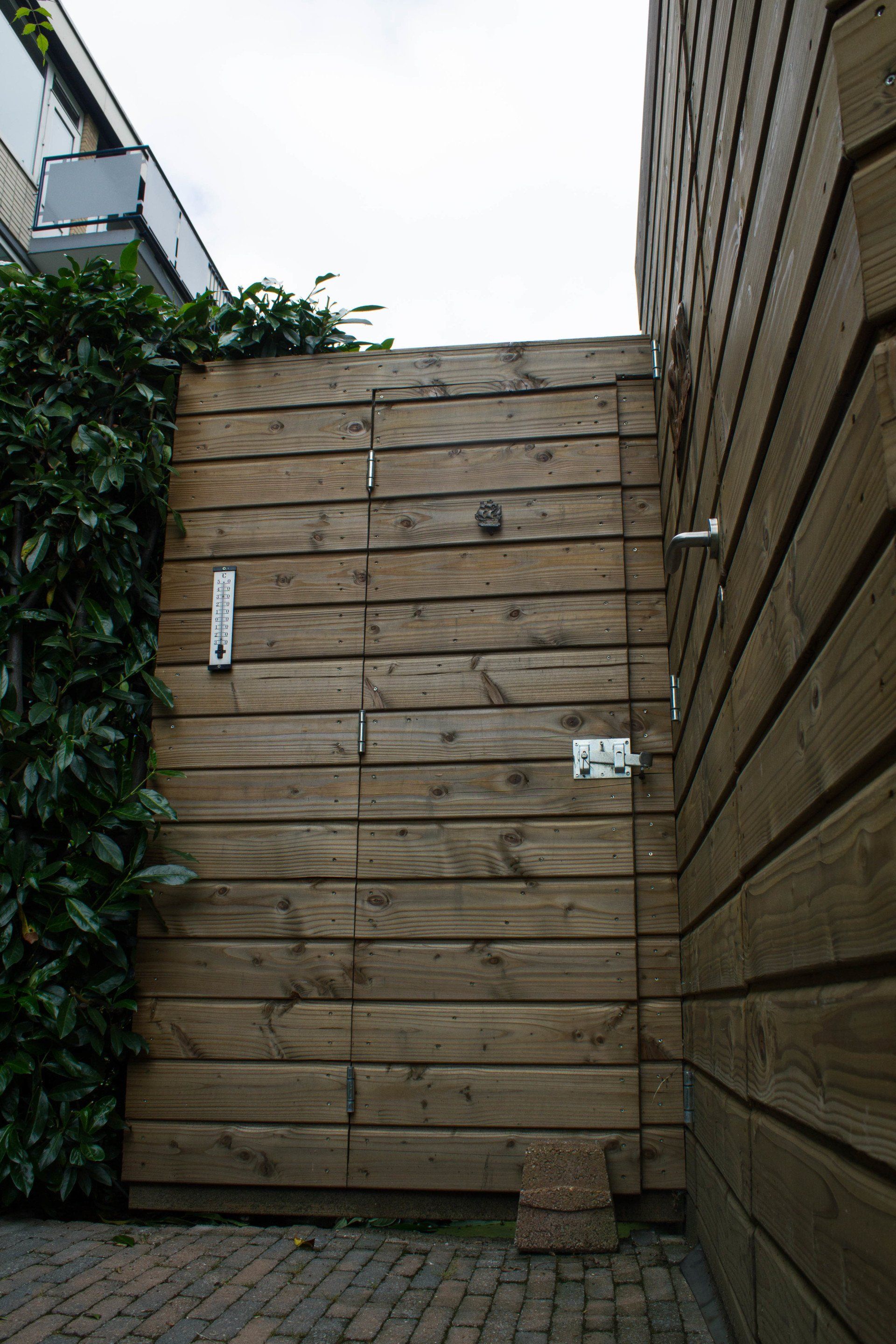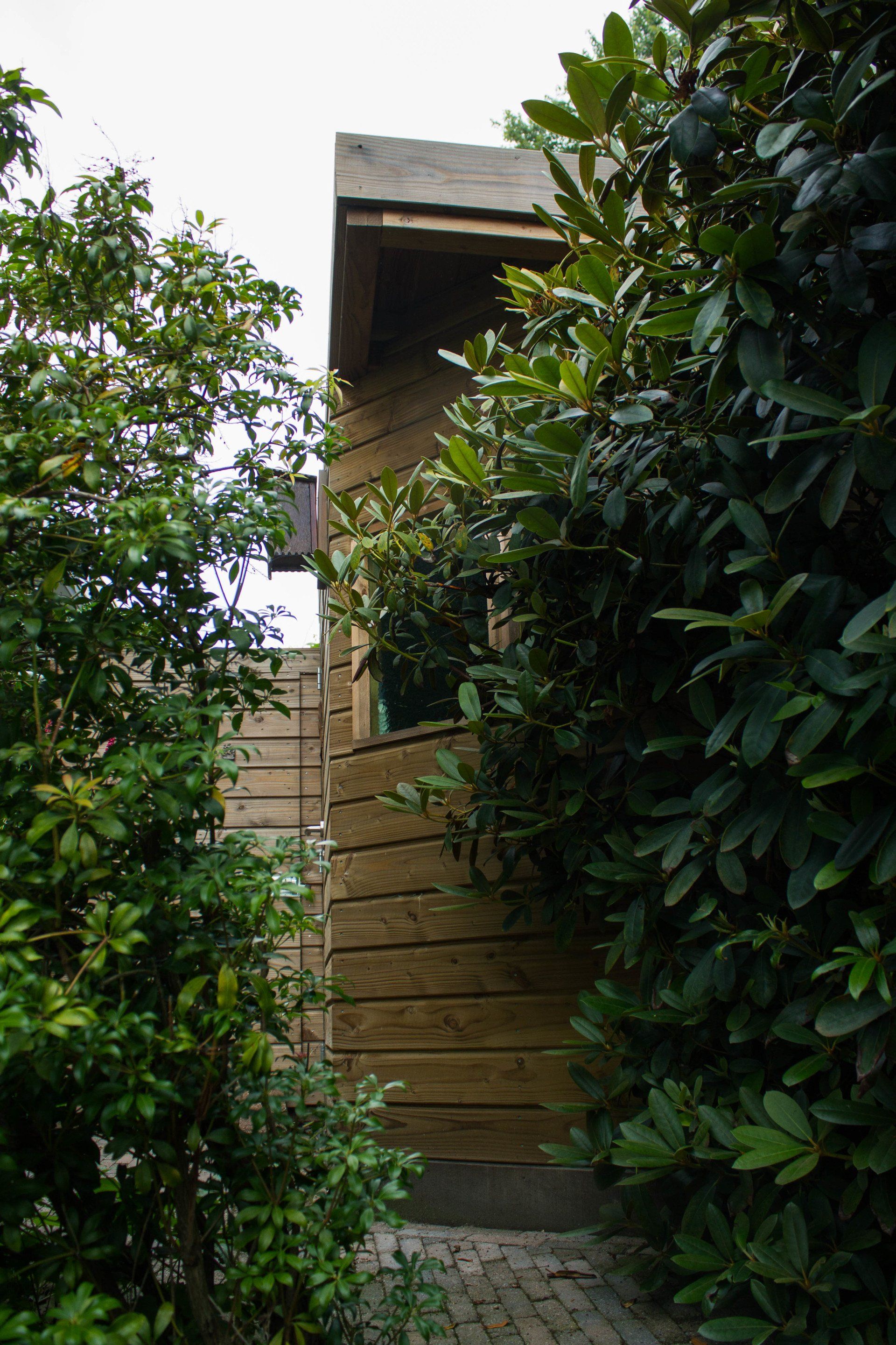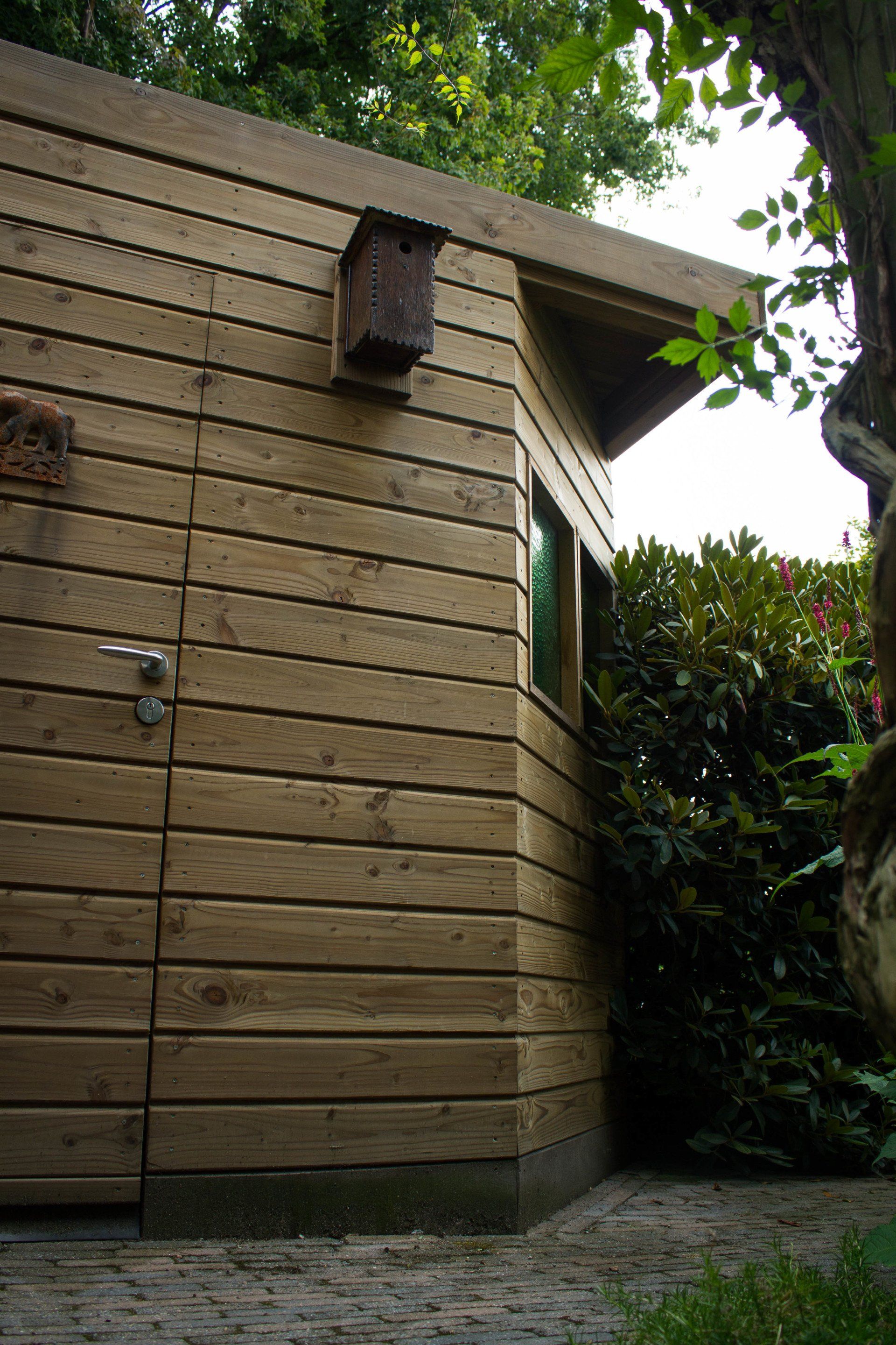 En niet alleen de schuur is bijzonder, ook de schutting heeft ook nog een verassing: een mooie deur die je bijna niet ziet, met achter de deur ruimte voor opslag. Deze bijzondere schuur is geheel verstelbaar in hoogte.