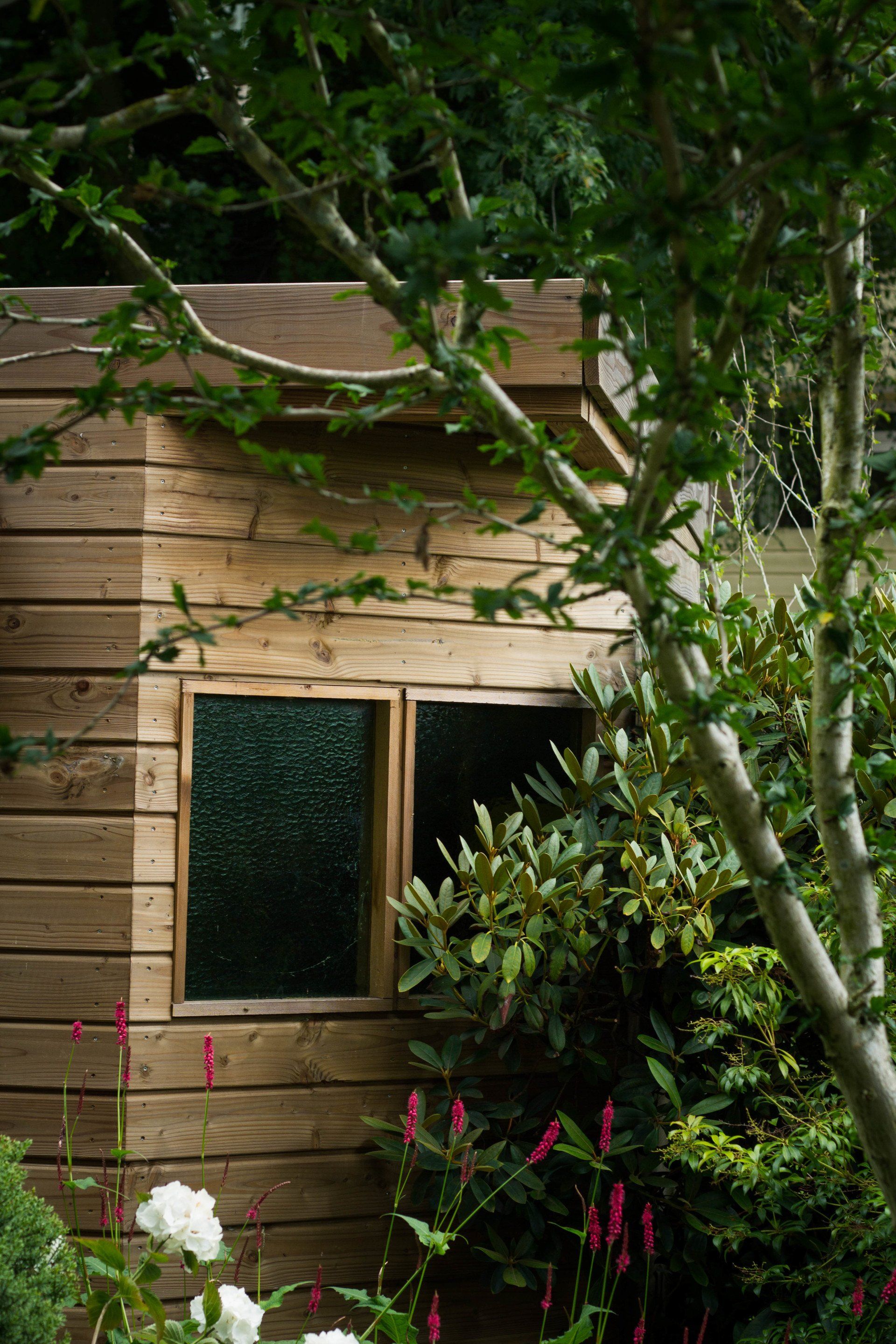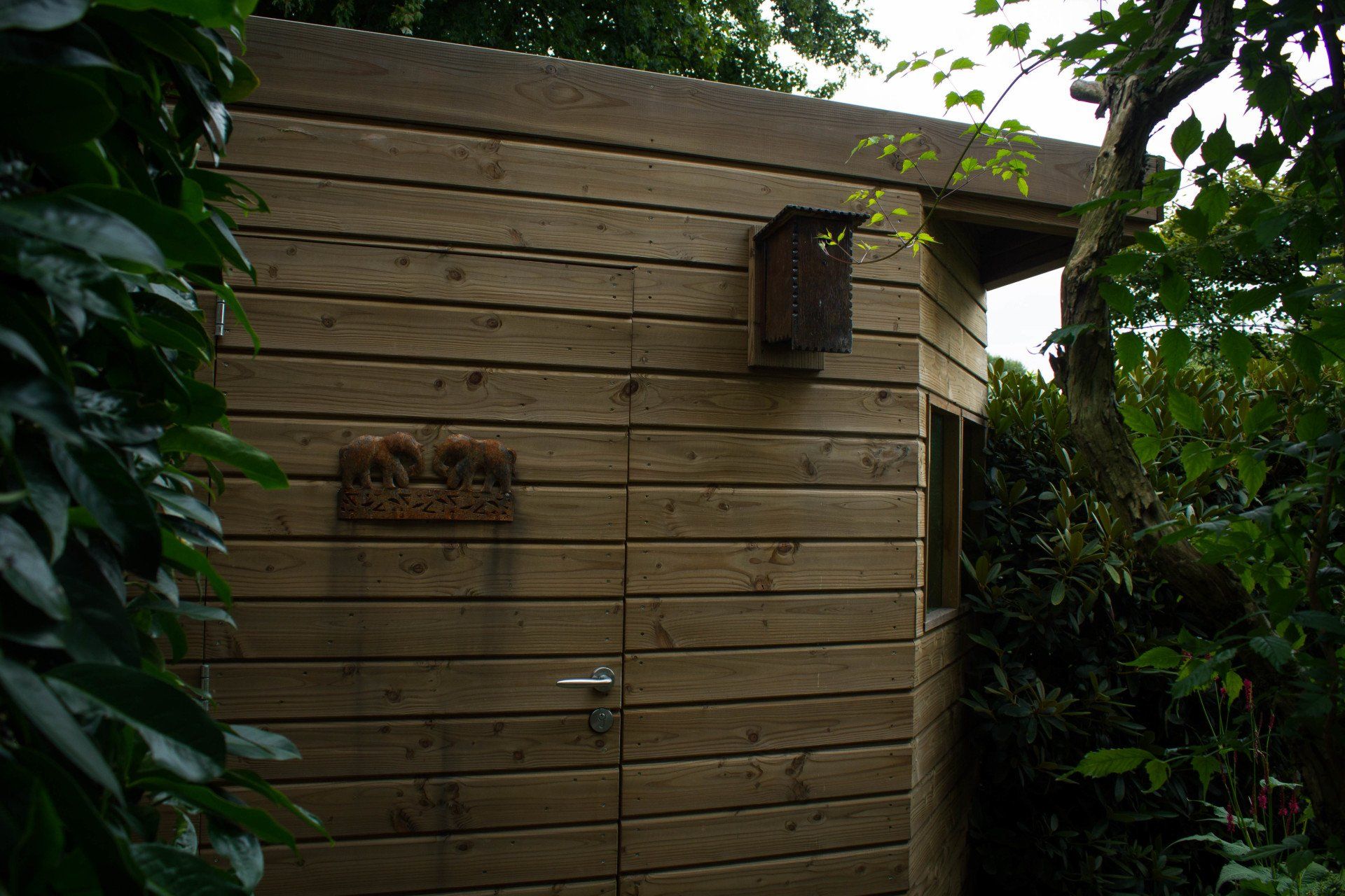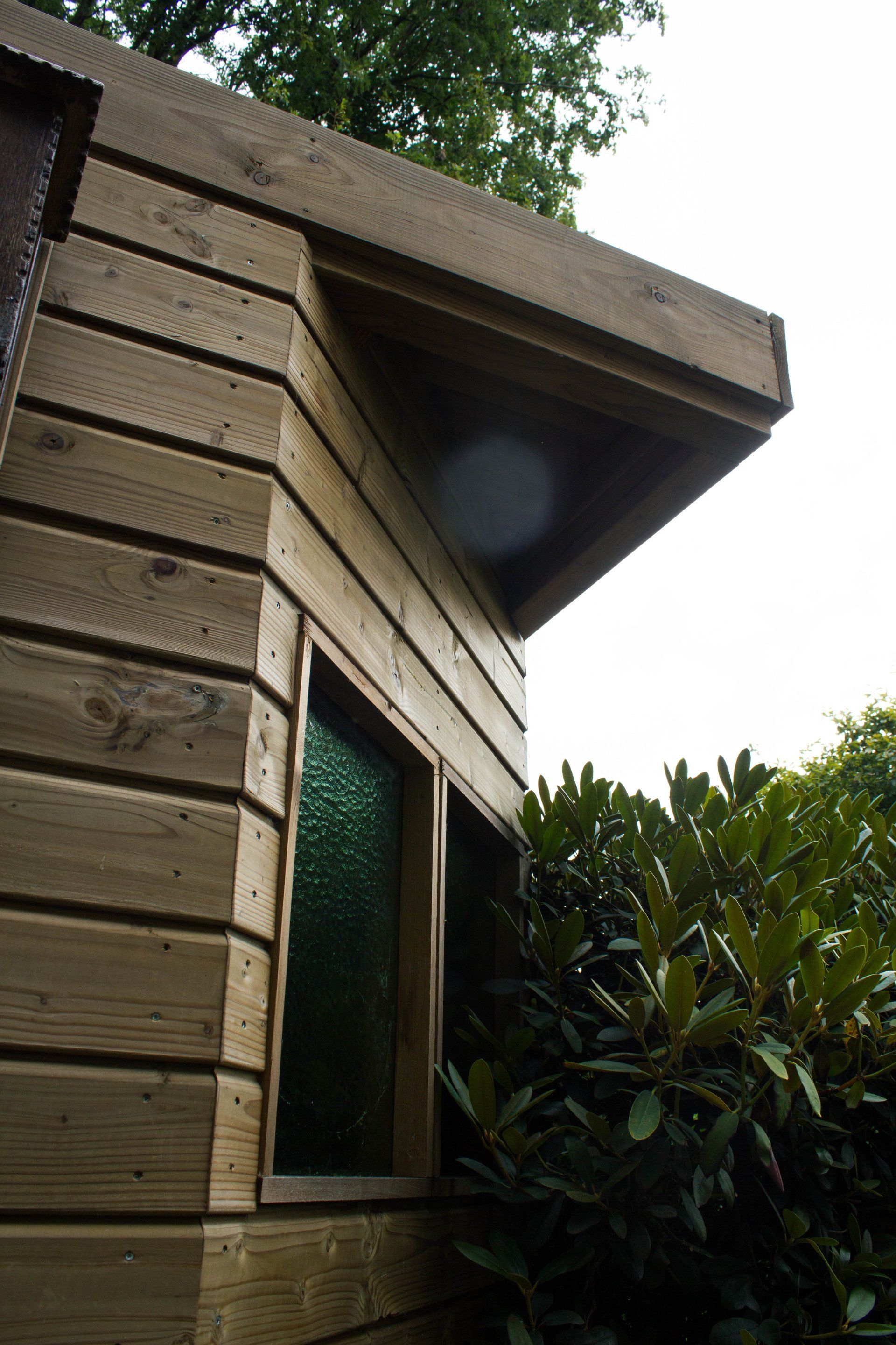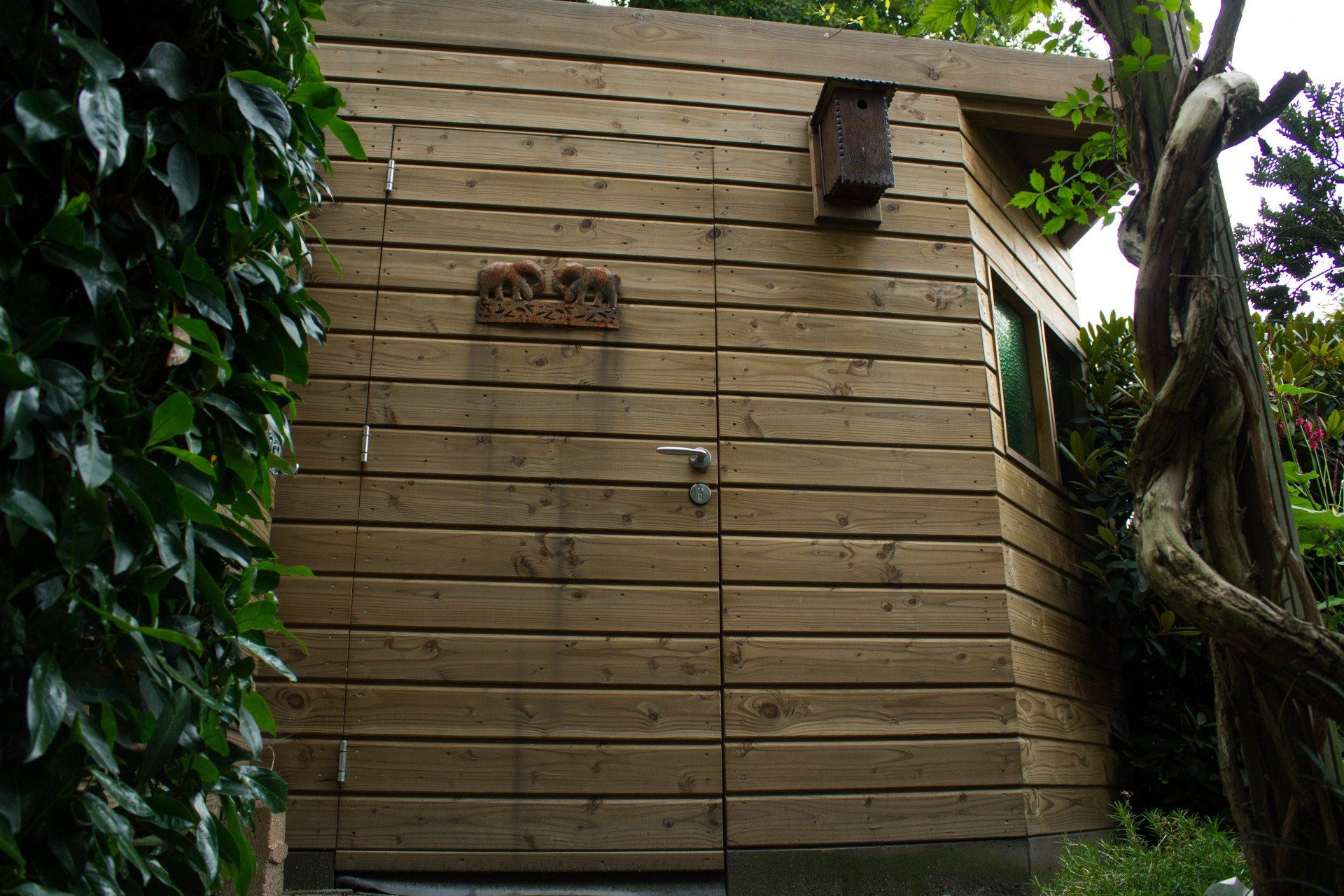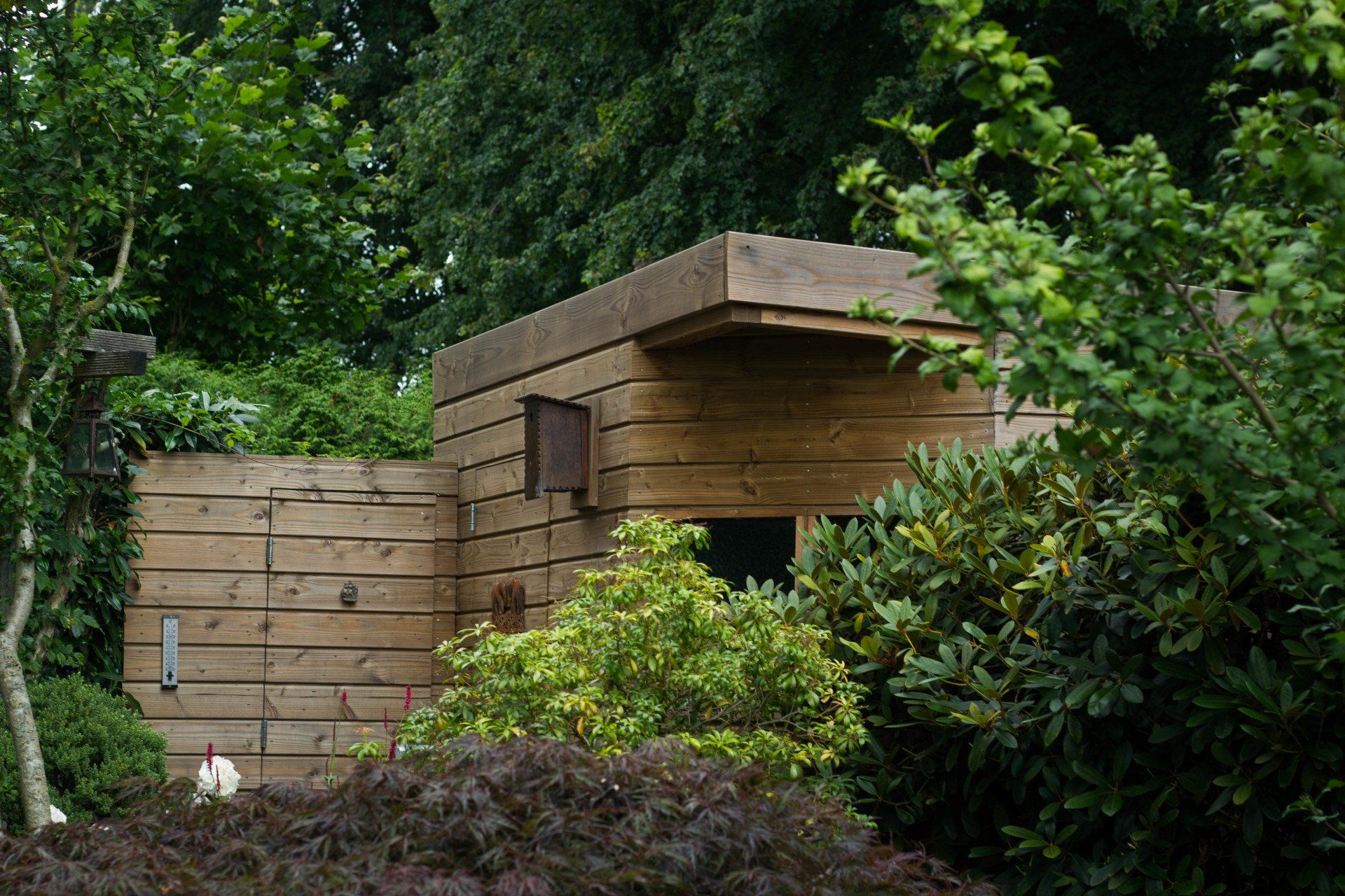 En niet alleen de schuur is bijzonder, ook de schutting heeft ook nog een verassing: een mooie deur die je bijna niet ziet, met achter de deur ruimte voor opslag. Deze bijzondere schuur is geheel verstelbaar in hoogte.
