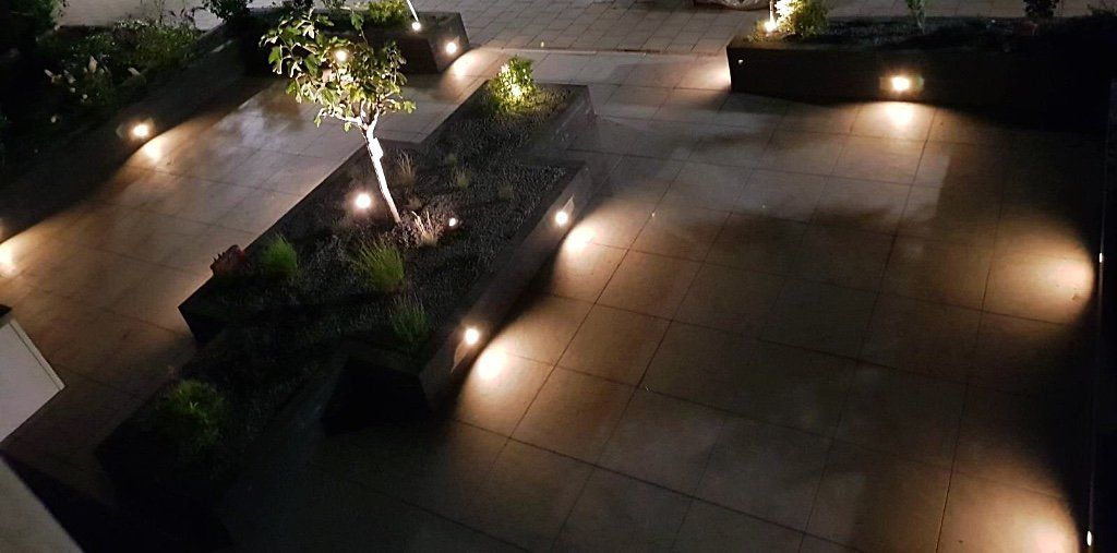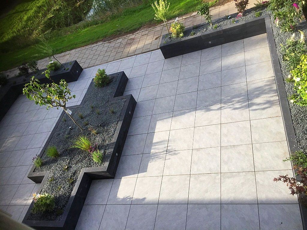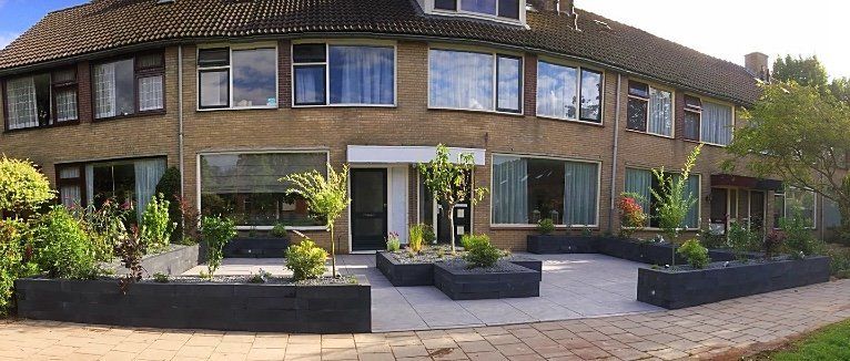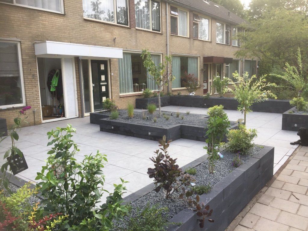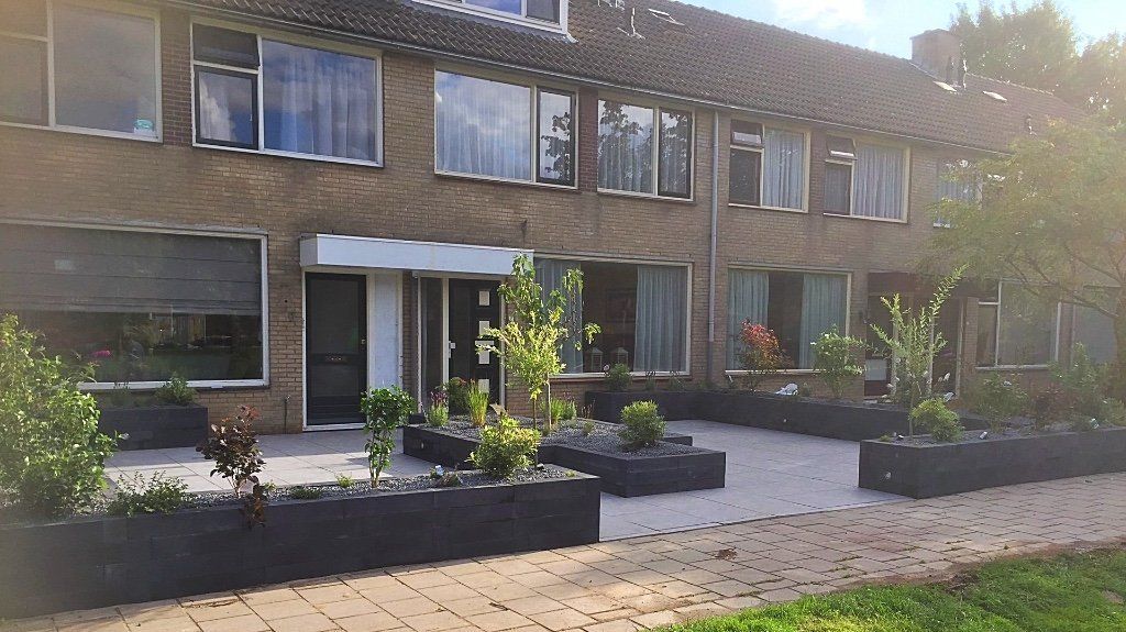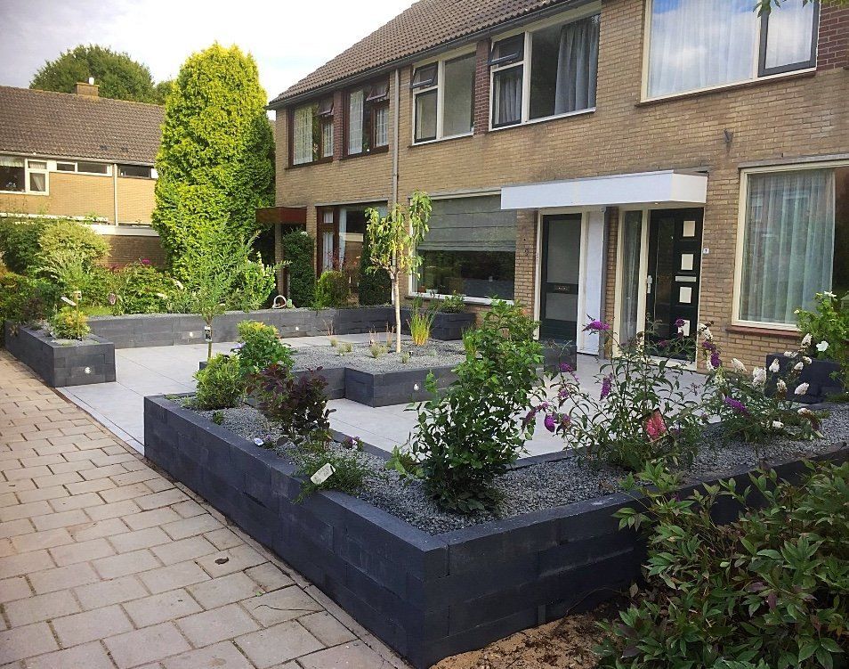 Een gezamenlijke voortuin met je buren! Met keramieke bestrating, gevoegd gelegd dus geen onkruid tussen de tegels. Rondom en in het midden verhoogde bloembakken van Lineablokken. Ingeboorde verlichting en afgewerkt met anti-worteldoek en prachtige sfeervolle beplanting. En spotjes onder mooie beplanting, zodat de tuin ook in de avond er sfeervol bij ligt.