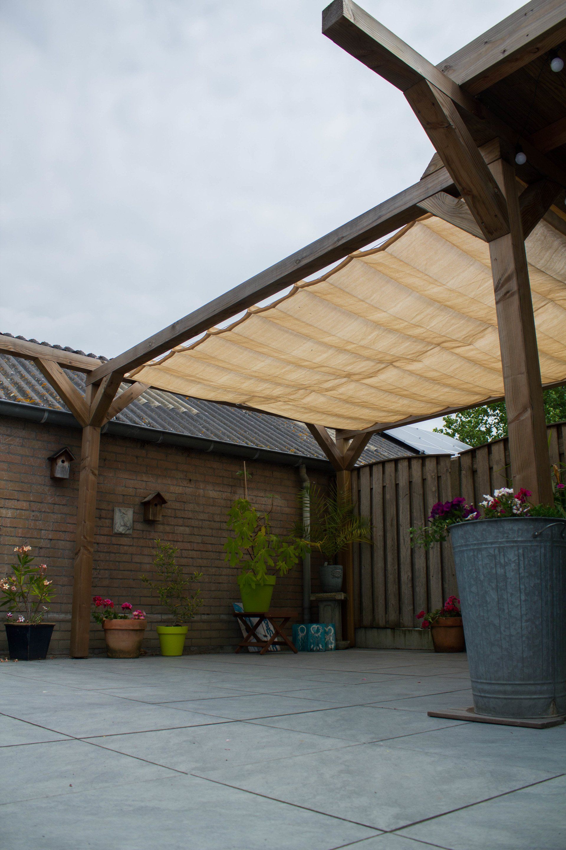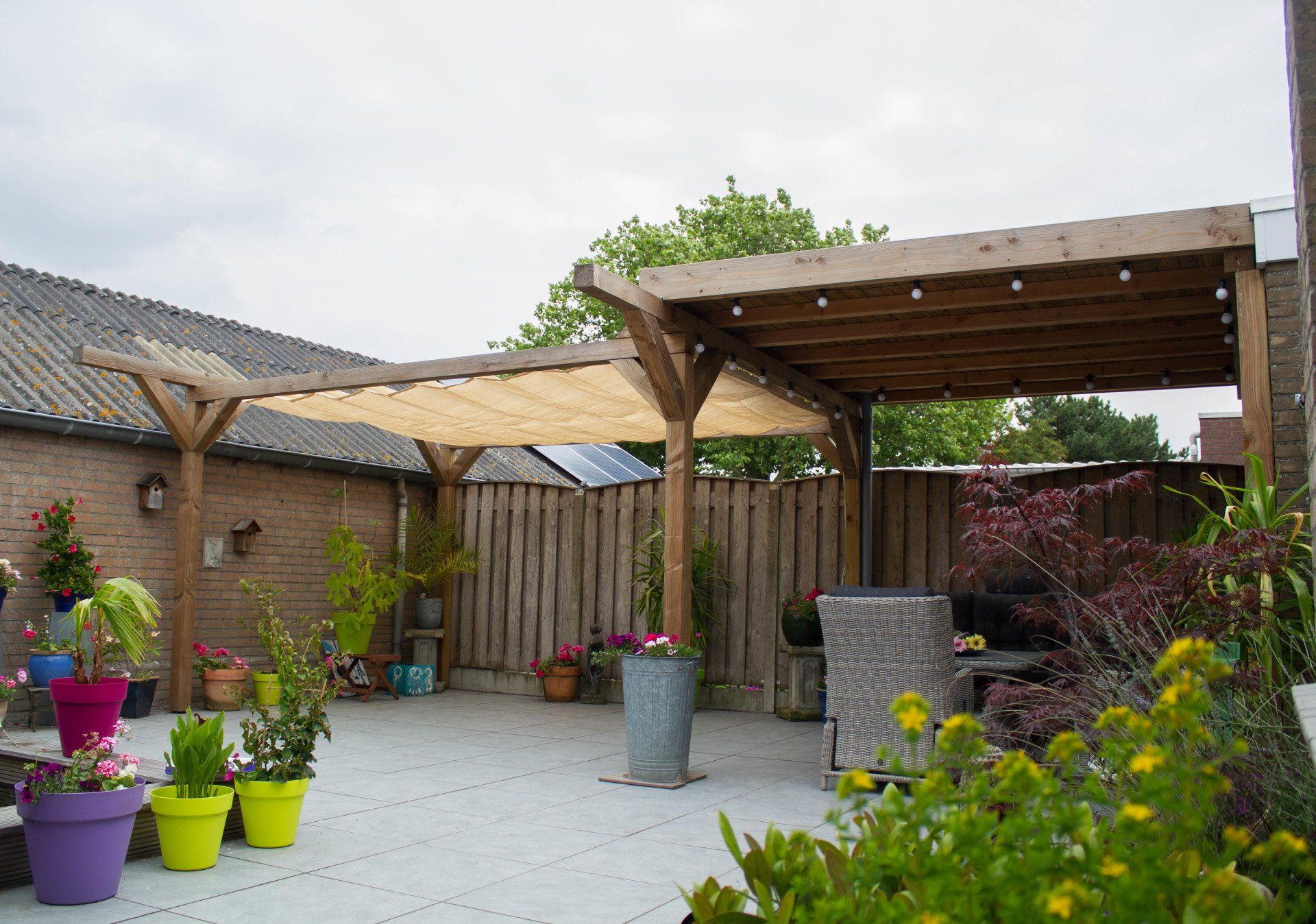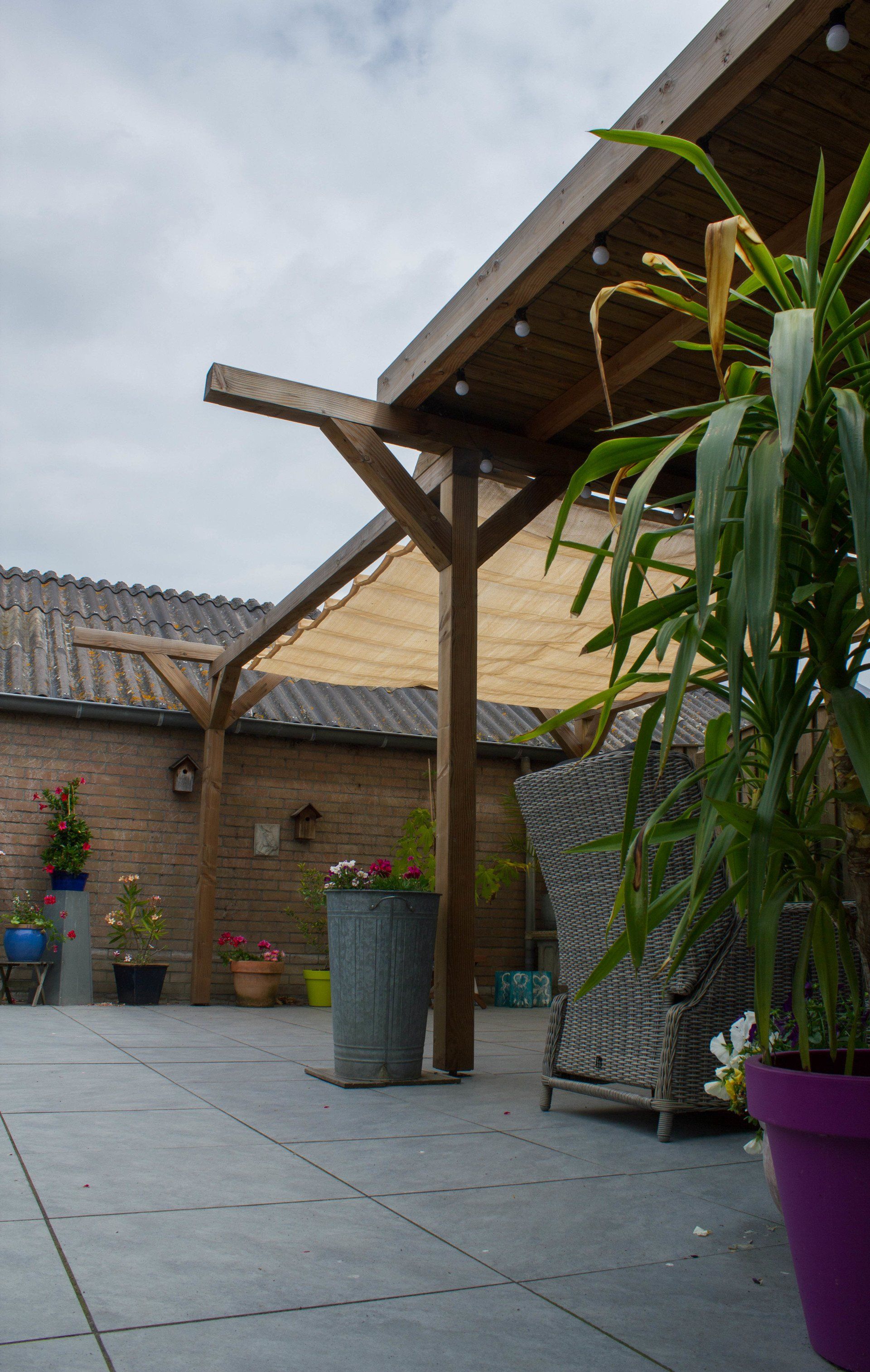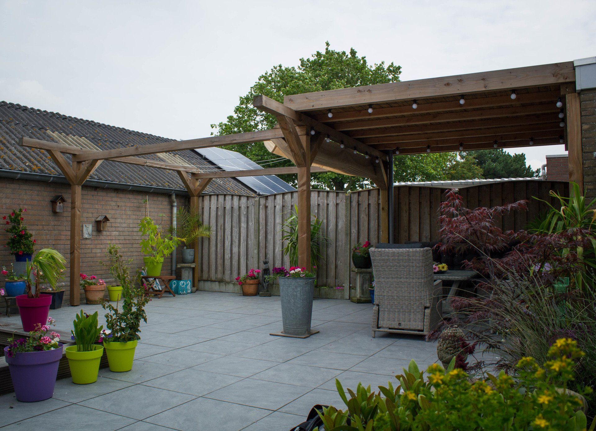 Stoere robuuste tuin met een dichte overkapping en een overkapping met schaduwdoek. Beide gerealiseerd van 12x12 douglas palen. Bestrating van mooie keramiek tegels, gevoegd gelegd, dus geen onkruid! Verhoogde vijver van hardhout. De verhoogde borders zijn gemaakt van hergebruik betonnen bielzen. Mooi ontwerp met diverse mogelijkheden om van de tuin te genieten. Beplanting inbegrepen!
