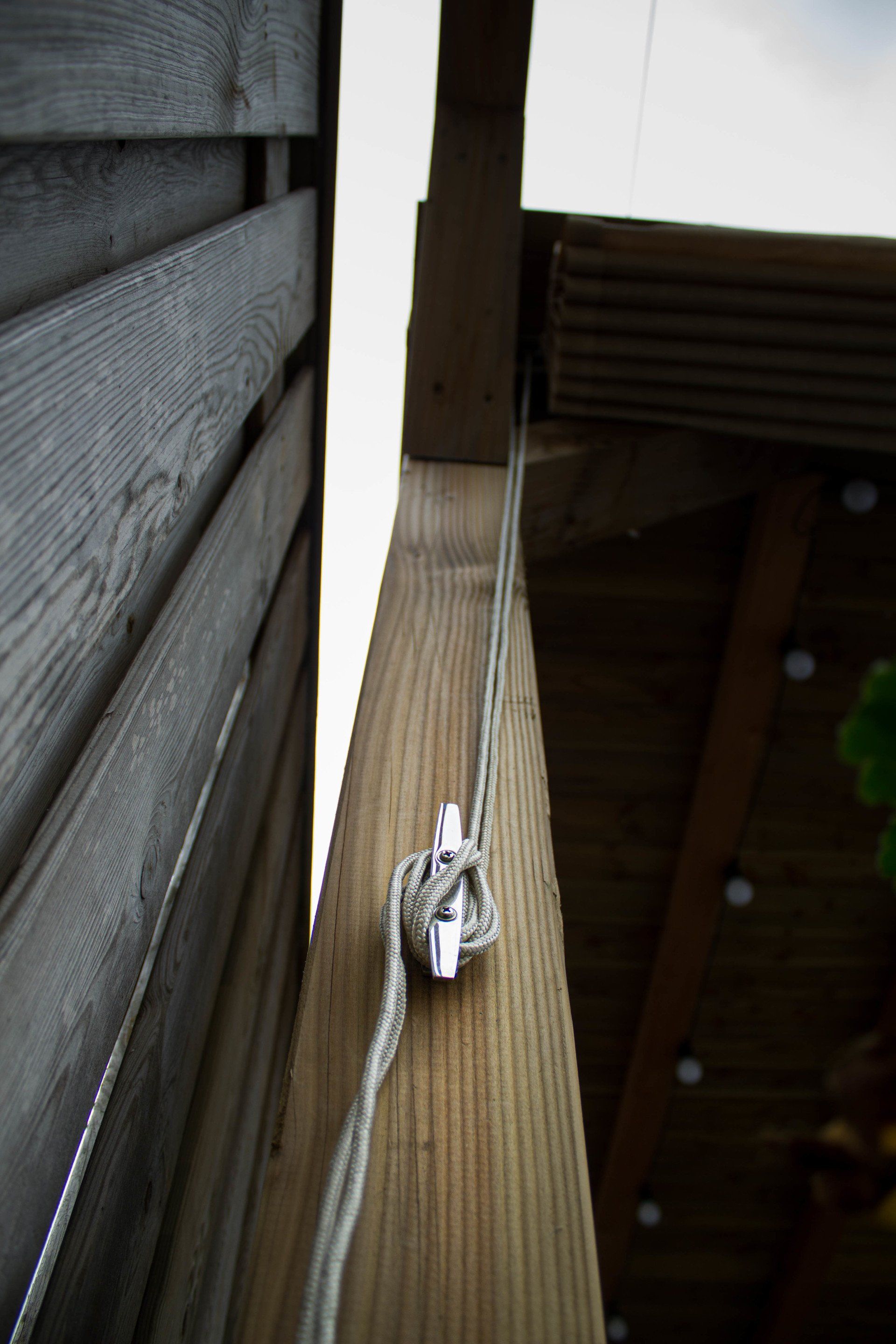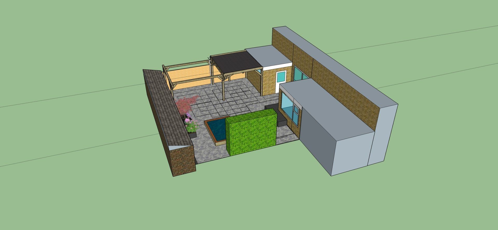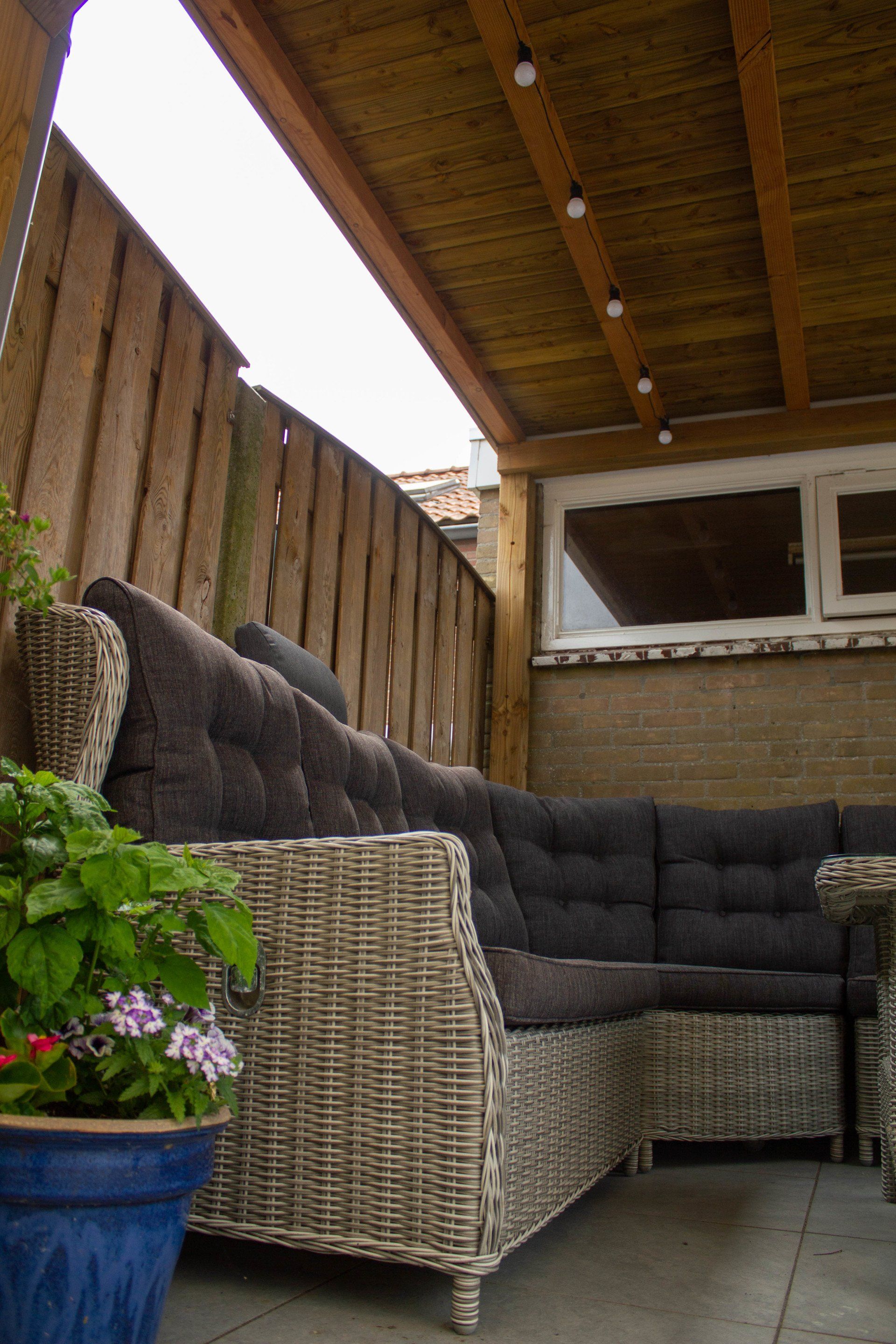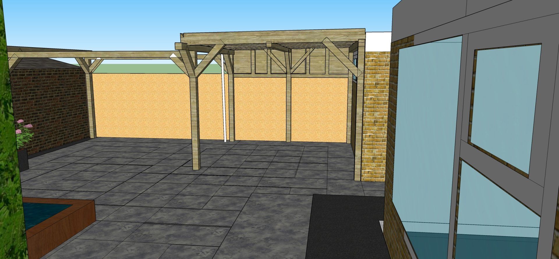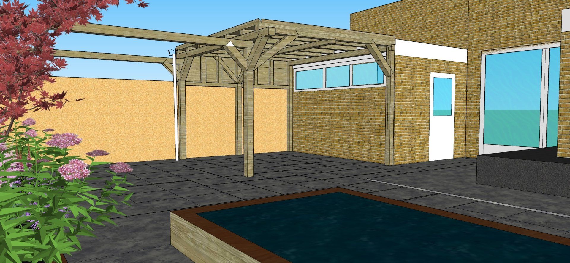 Stoere robuuste tuin met een dichte overkapping en een overkapping met schaduwdoek. Beide gerealiseerd van 12x12 douglas palen. Bestrating van mooie keramiek tegels, gevoegd gelegd, dus geen onkruid! Verhoogde vijver van hardhout. De verhoogde borders zijn gemaakt van hergebruik betonnen bielzen. Mooi ontwerp met diverse mogelijkheden om van de tuin te genieten. Beplanting inbegrepen!