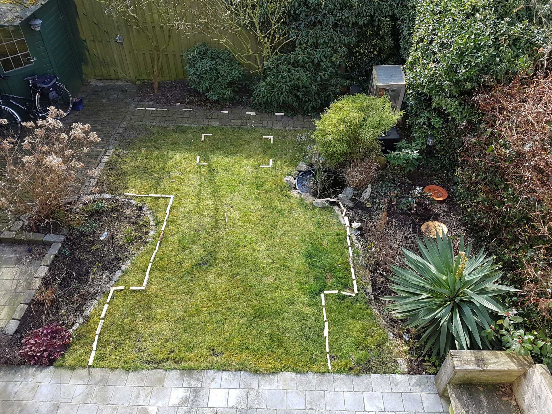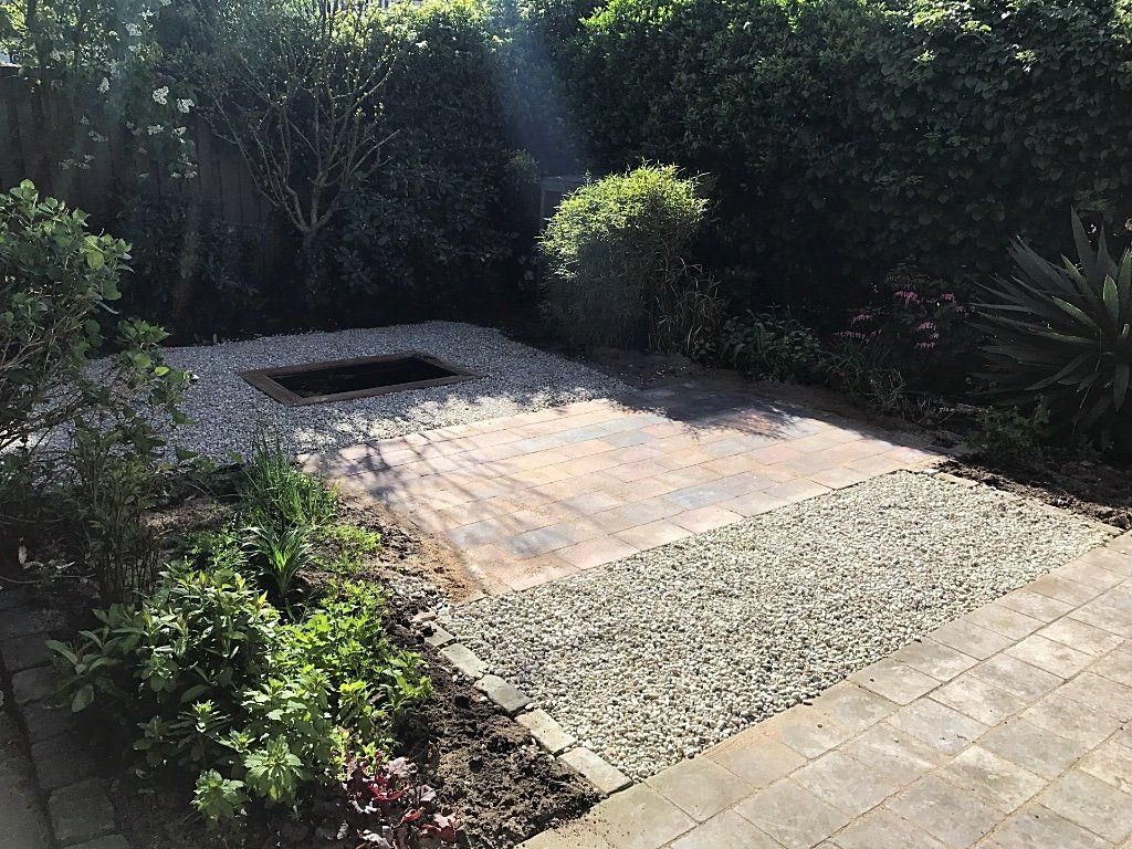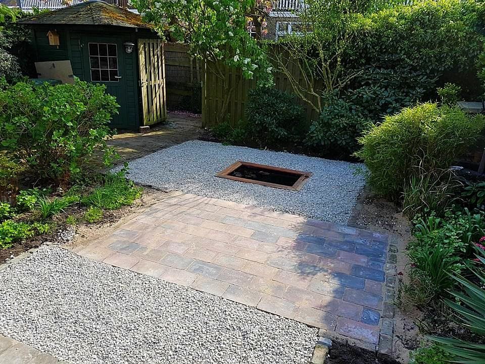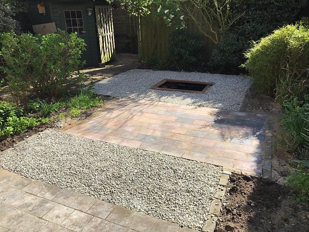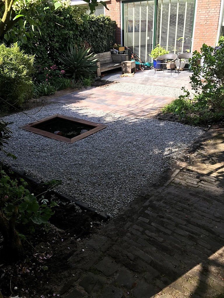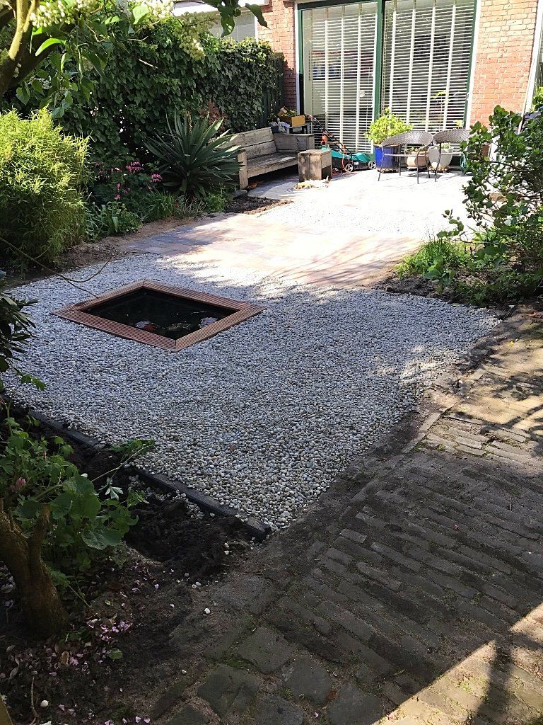 In deze creatieve tuin is de grasmat vervangen voor grind, bestrating en een stuk grind met een kleine vijver.