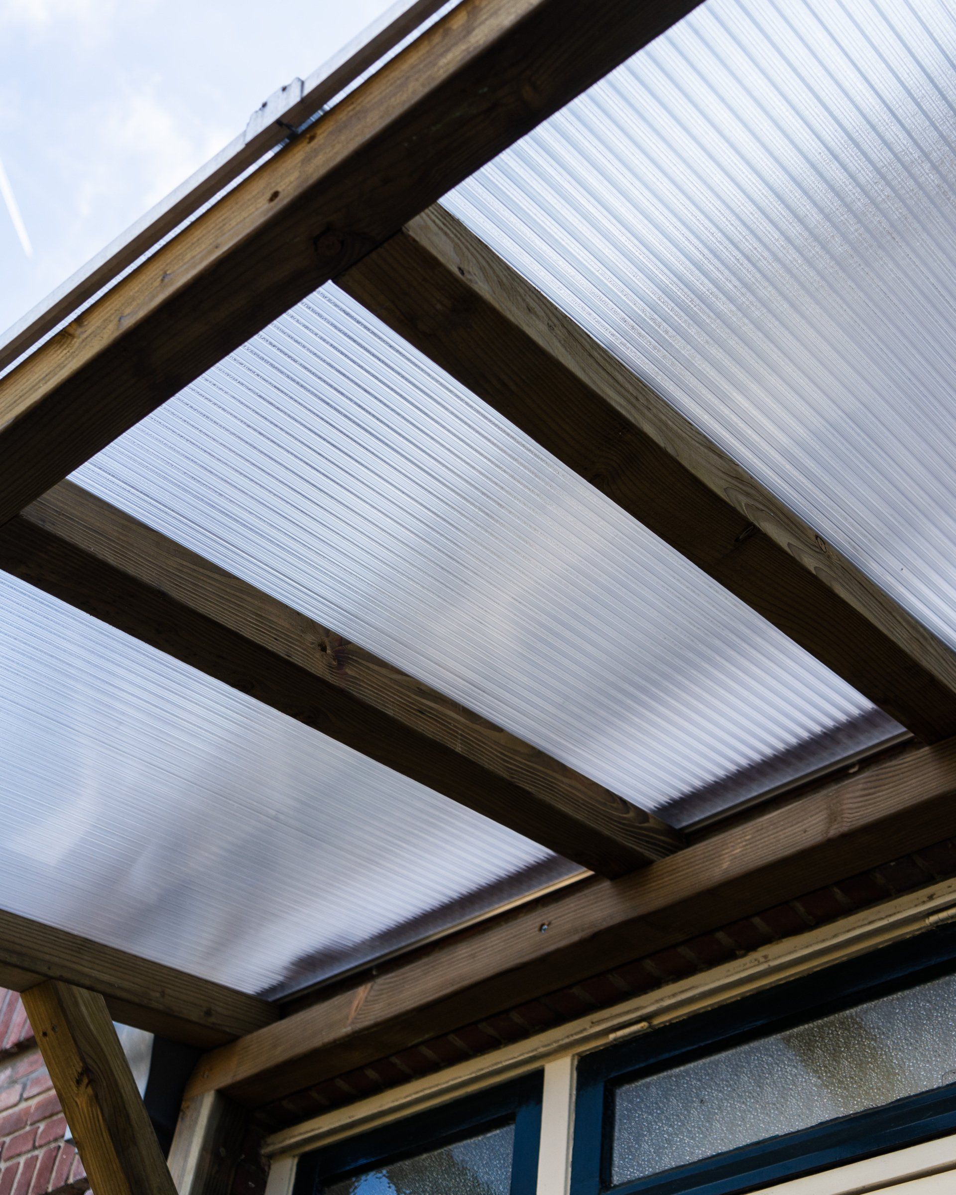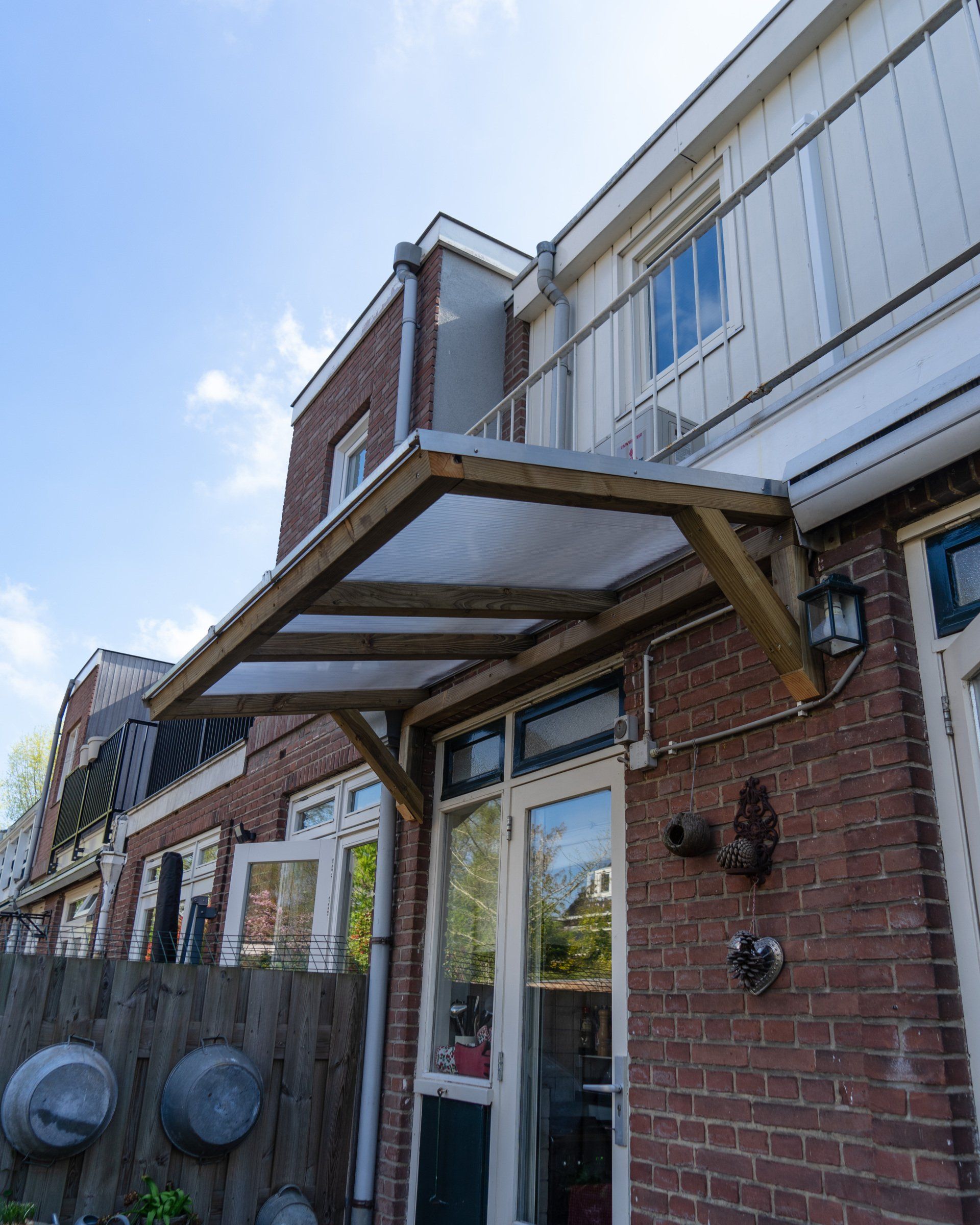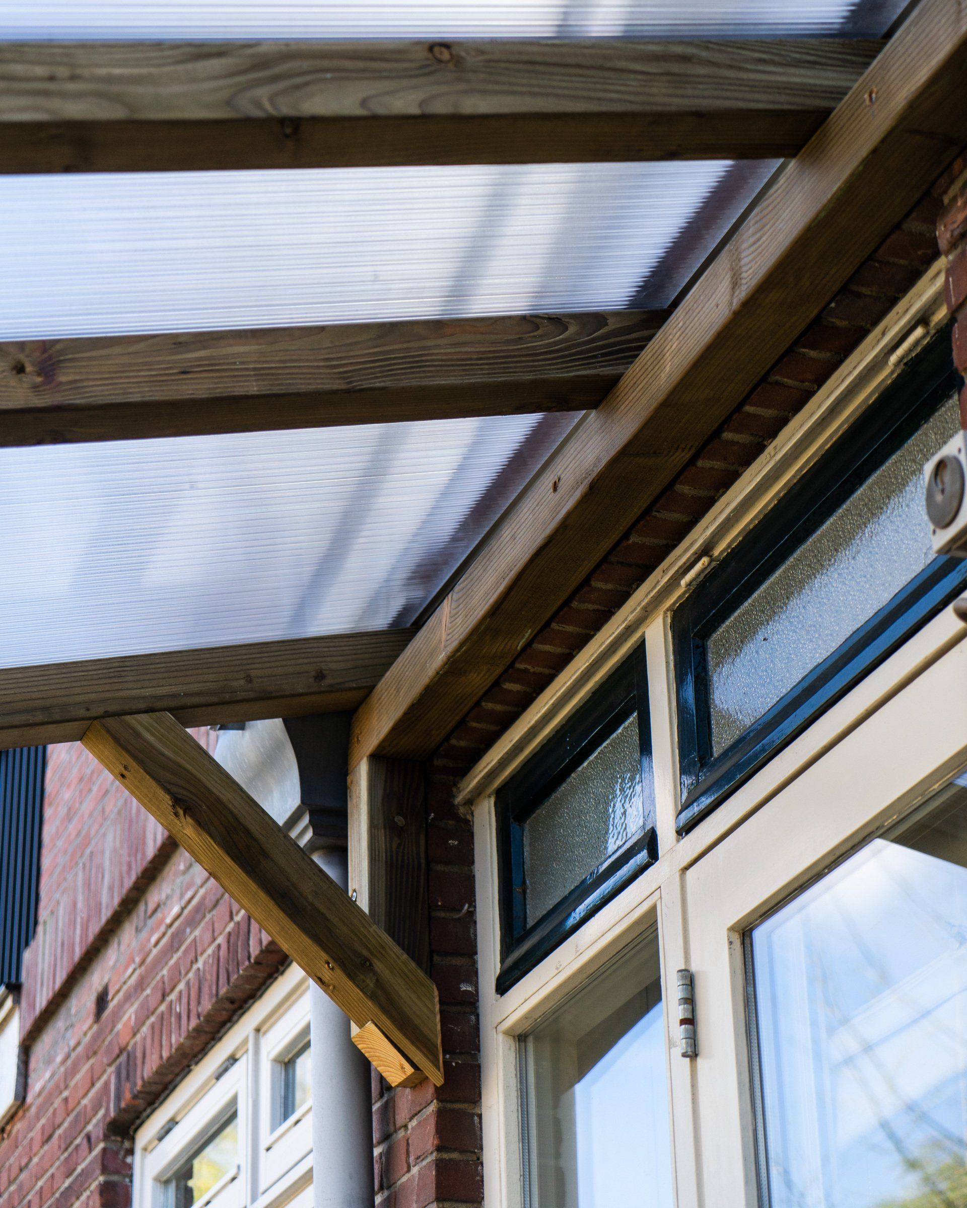 Kleine overkapping boven de deur van Douglas hout en polycarbonaat.