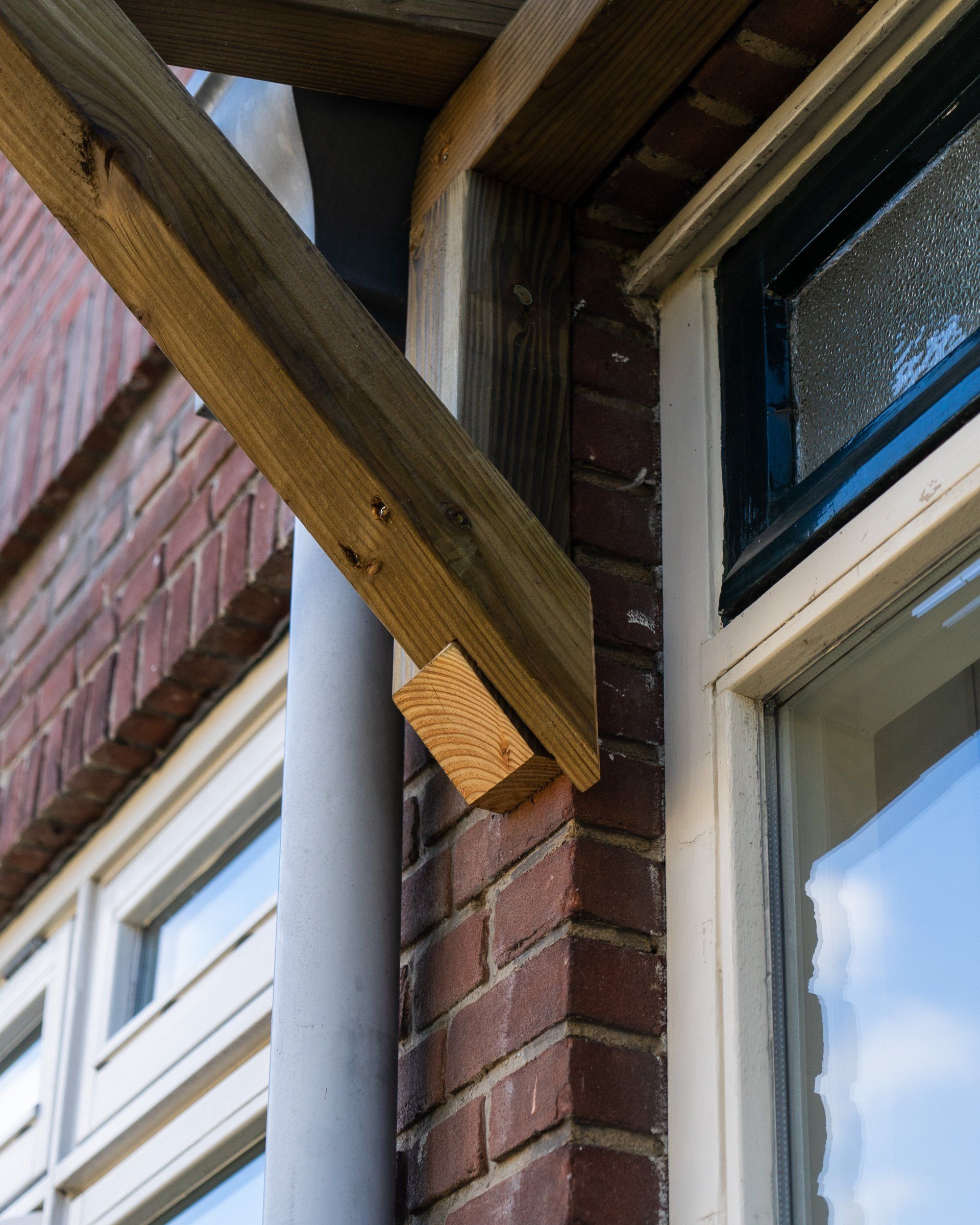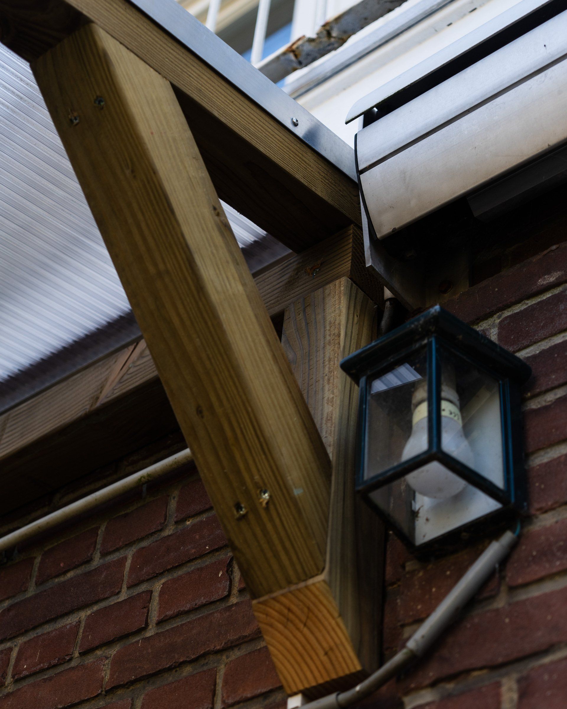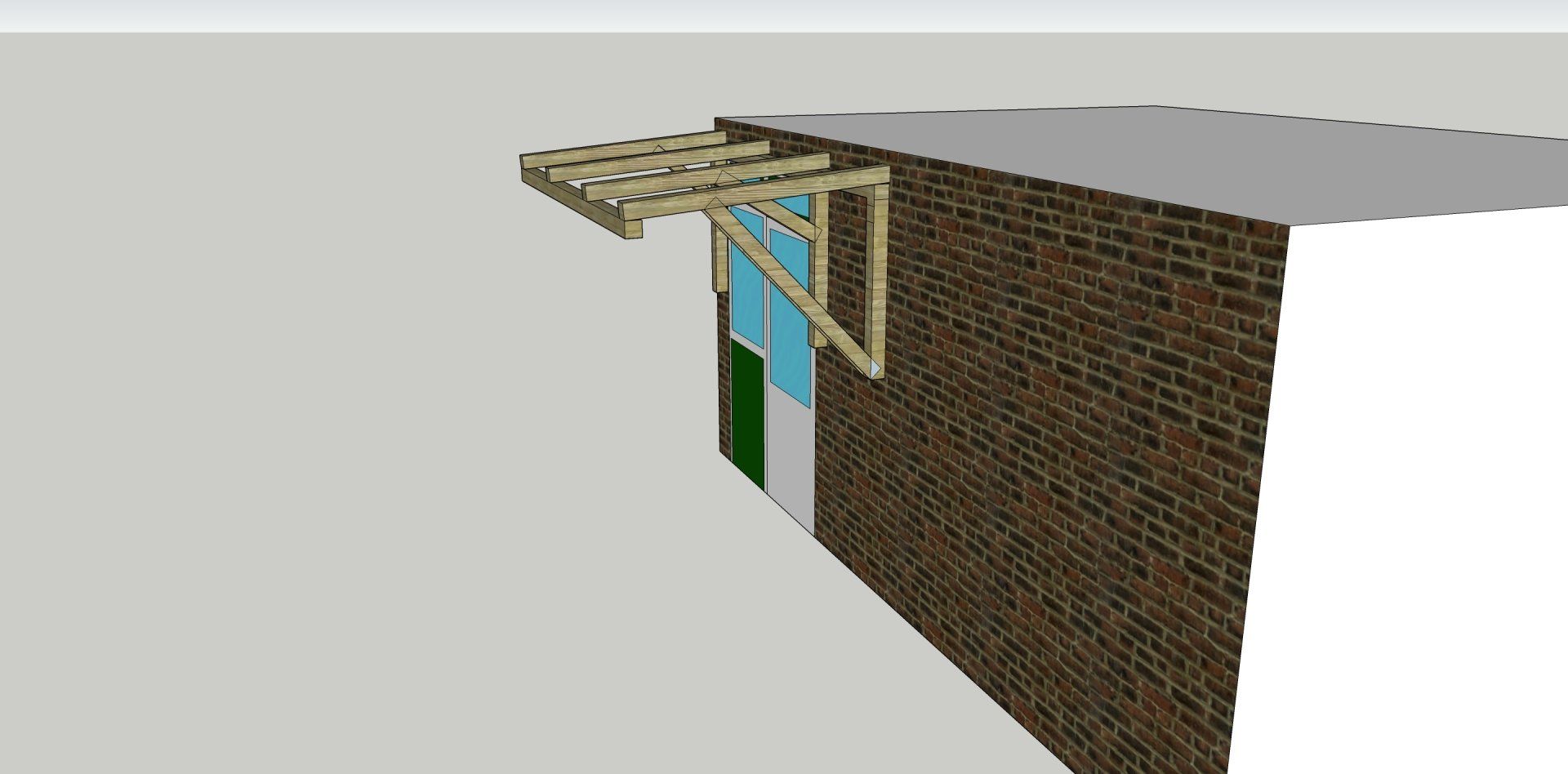 Kleine overkapping boven de deur van Douglas hout en polycarbonaat.