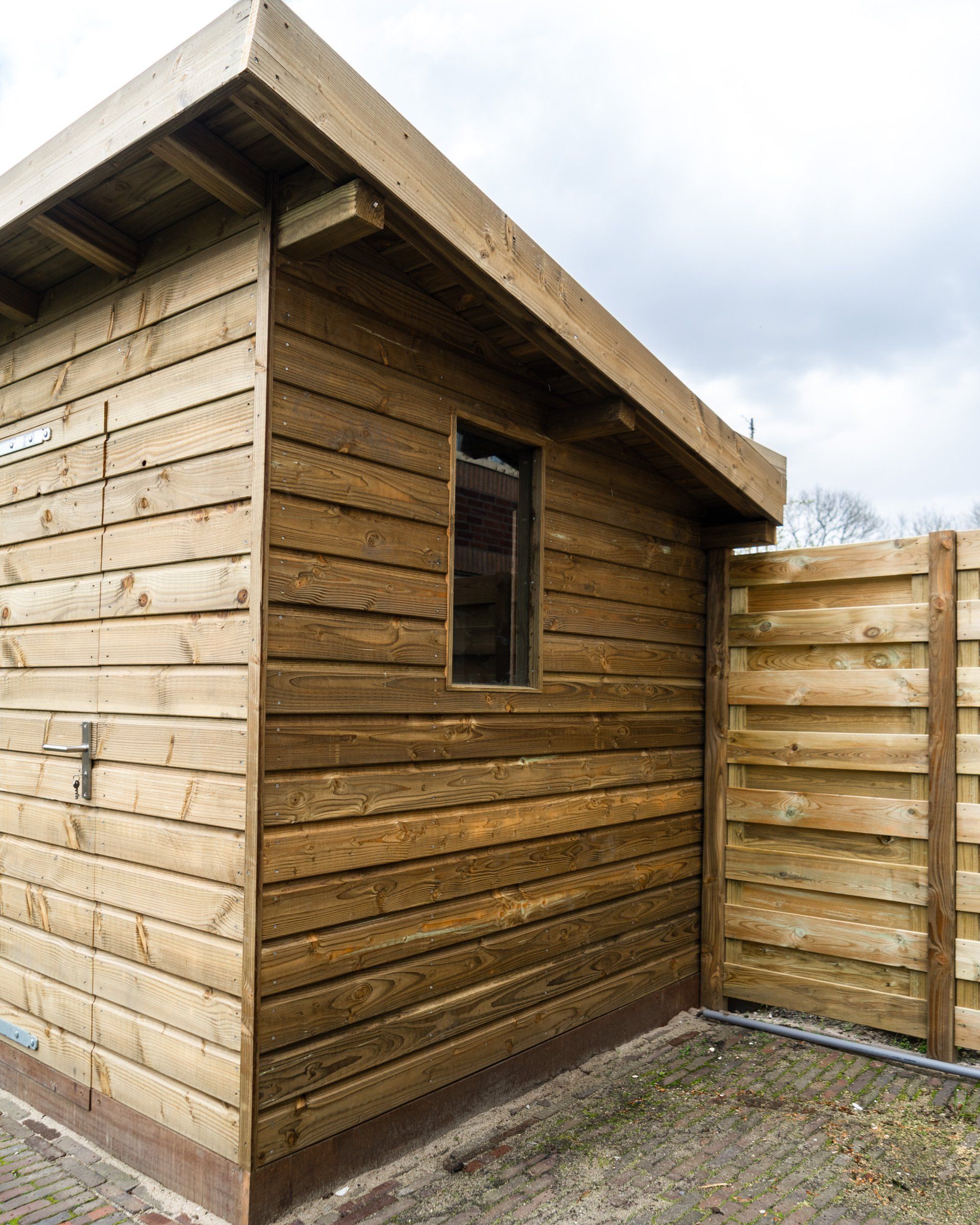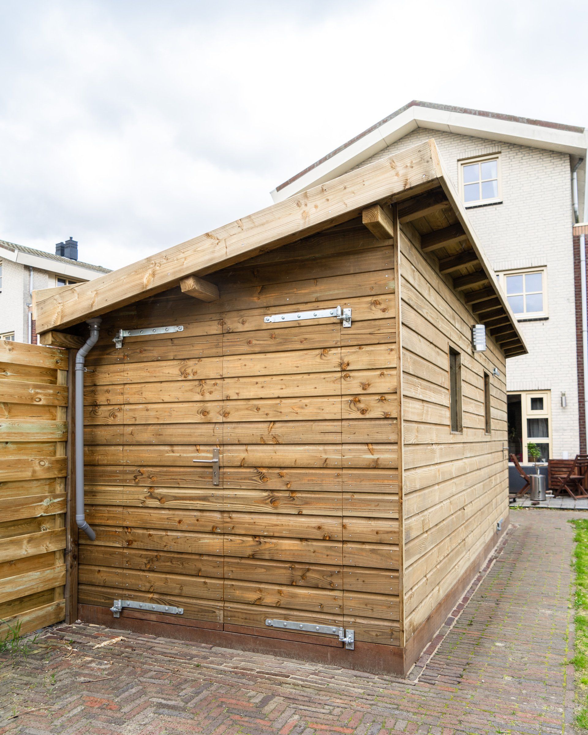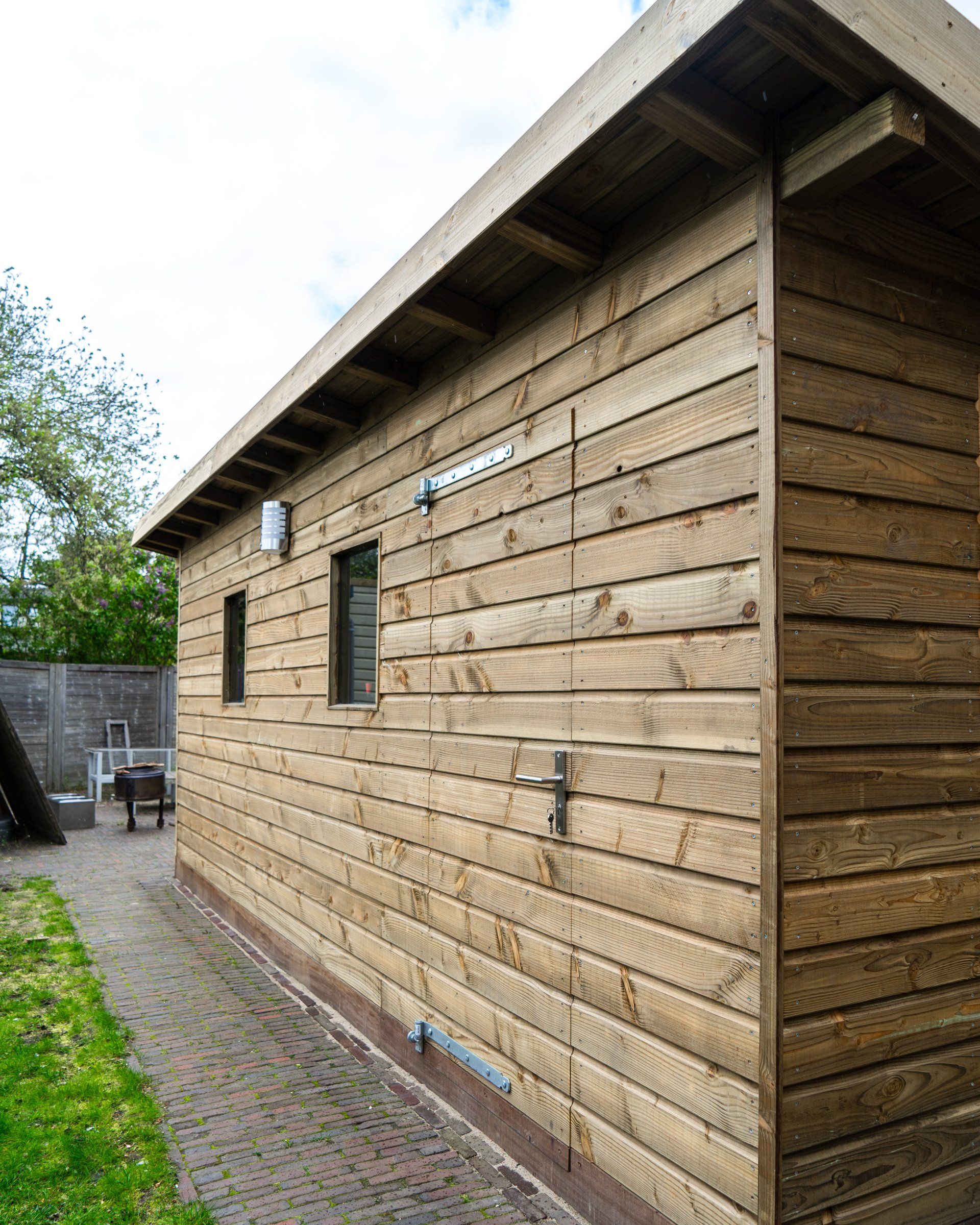 Robuuste schuur van Douglas hout met een schuin dak. Ramen, verlichting, dubbele deuren en een extra deur. Afwatering en voorzien van elektra/verlichting.