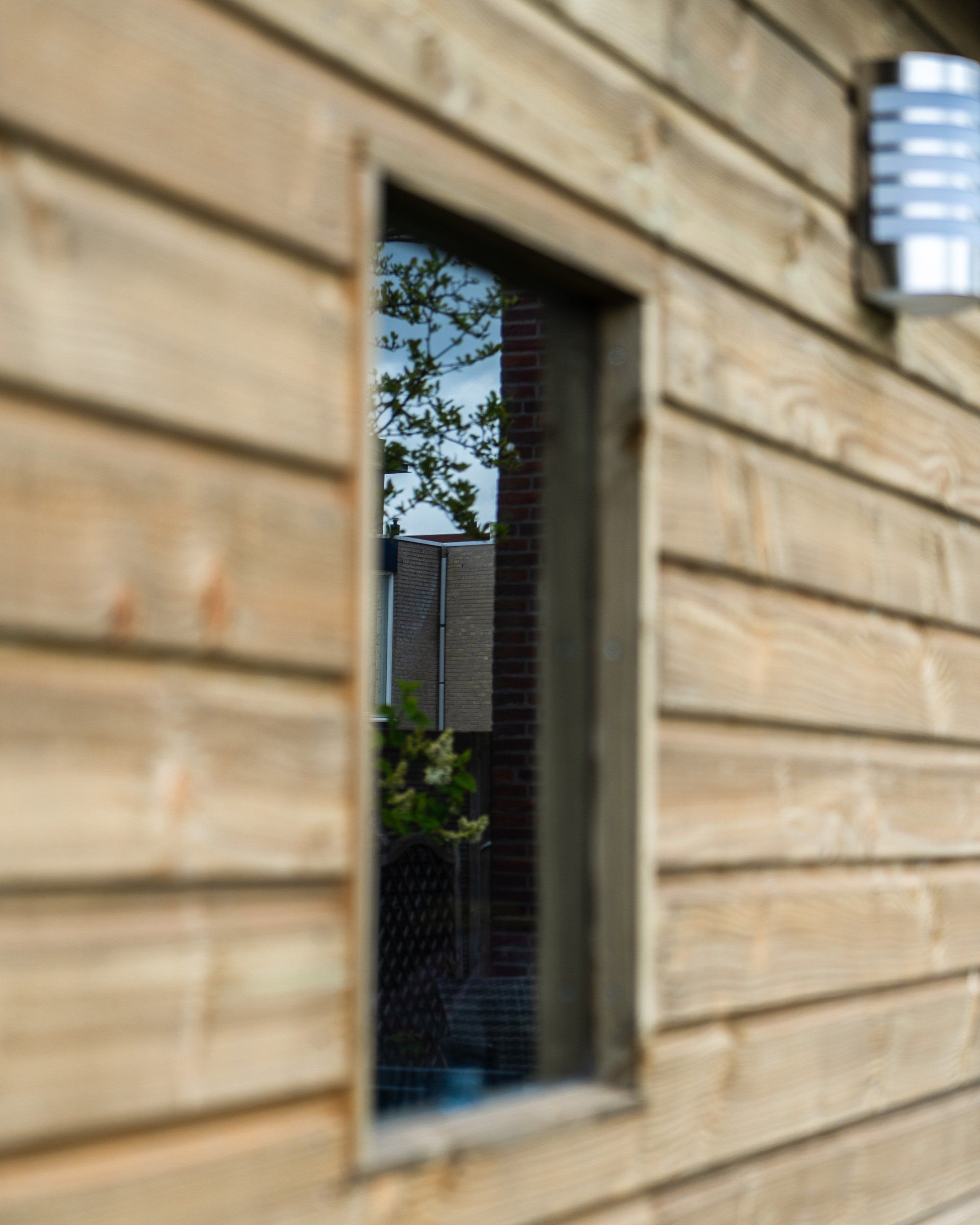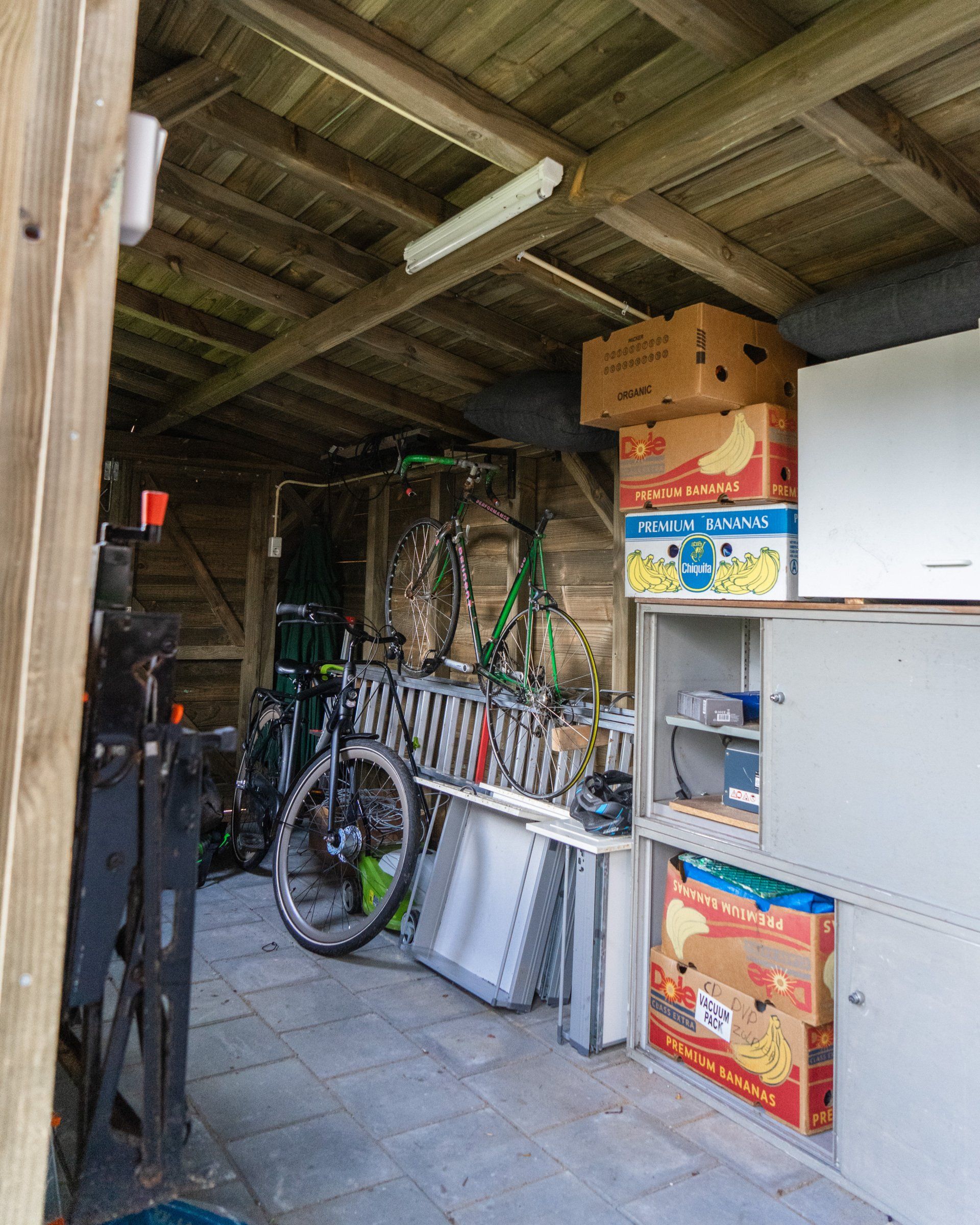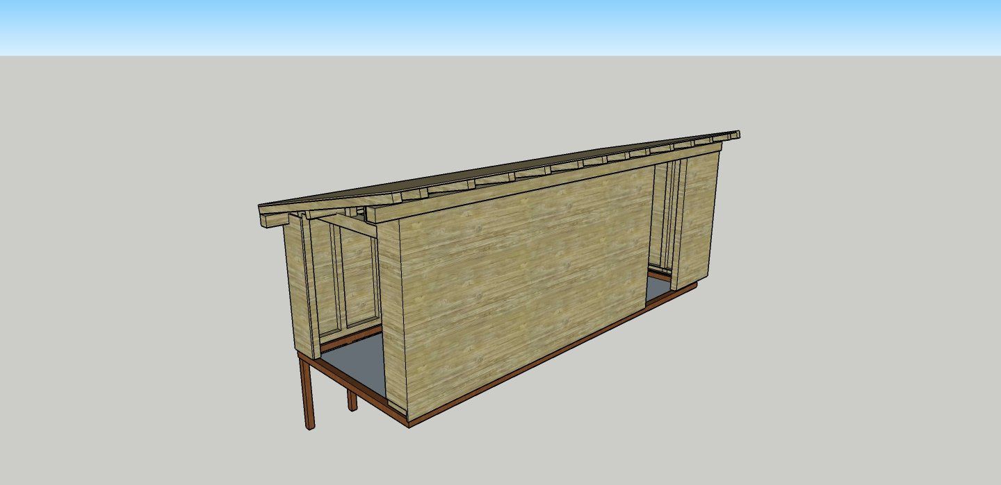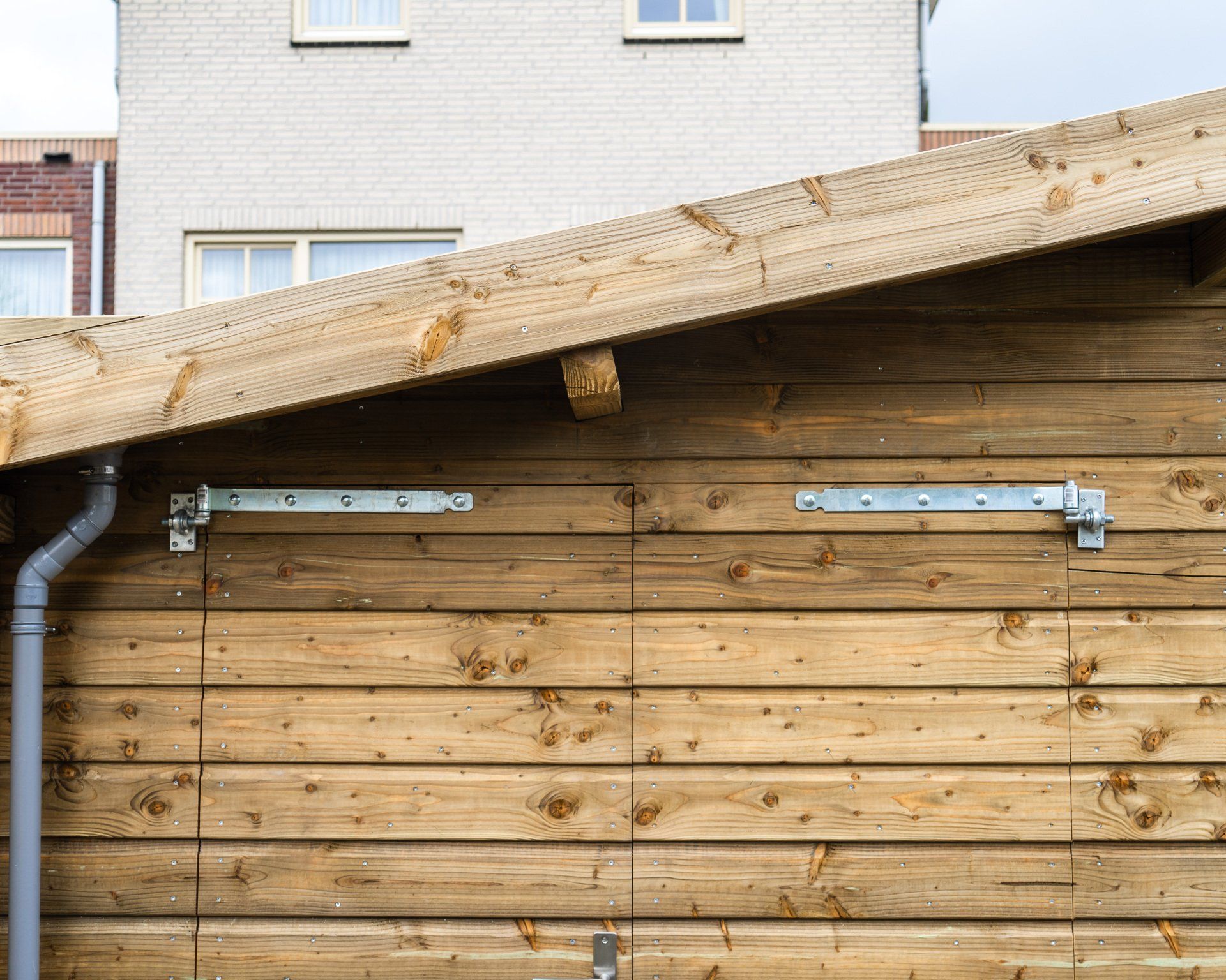 Robuuste schuur van Douglas hout met een schuin dak. Ramen, verlichting, dubbele deuren en een extra deur. Afwatering en voorzien van elektra/verlichting.