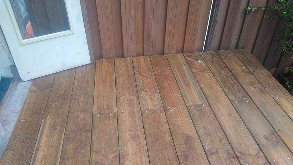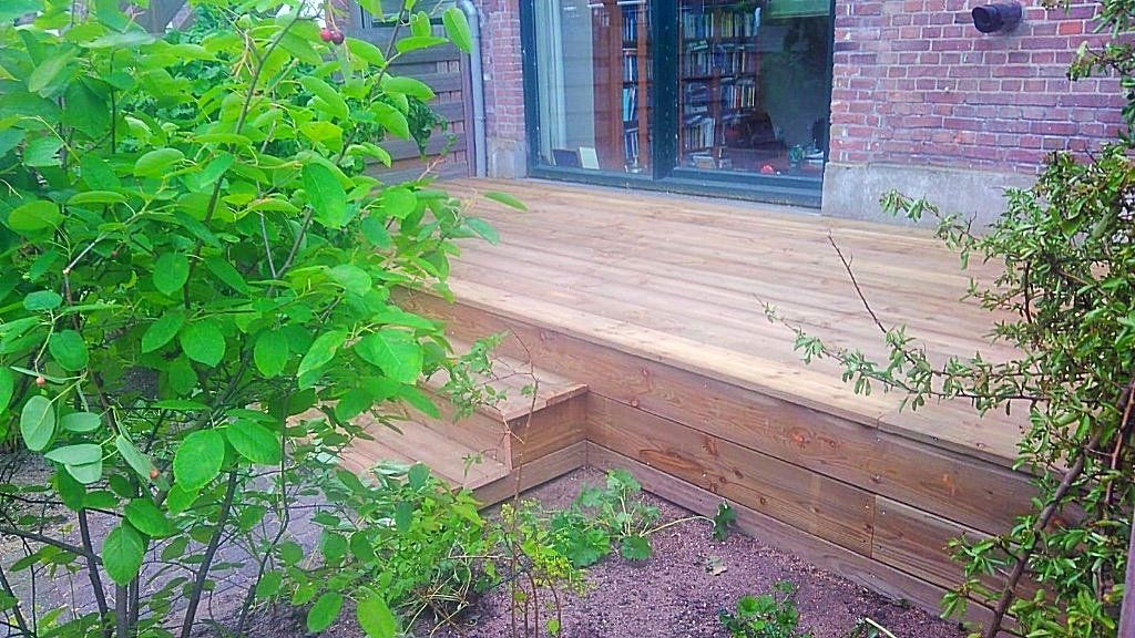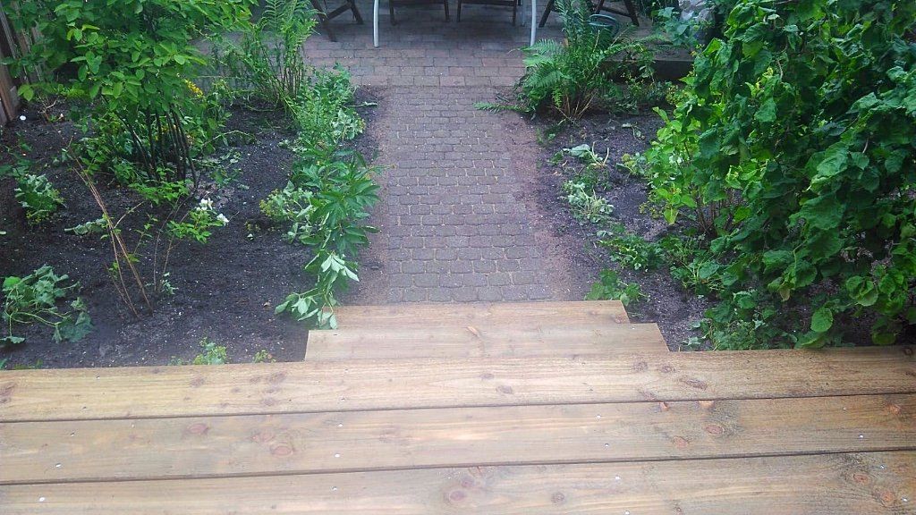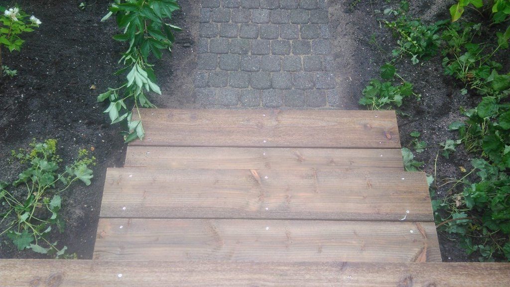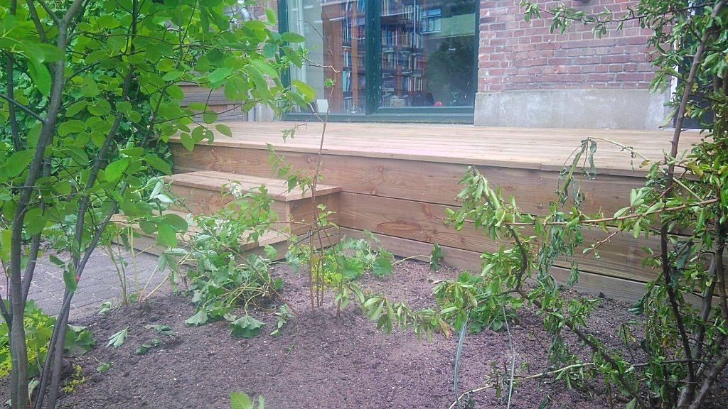 Deze tuin is opgehoogd en herbestraat. De vlonder is verstelbaar in hoogte zodat de vlonder te allen tijde waterpas staat. Het houtsoort is geïmpregneerde douglas hout.