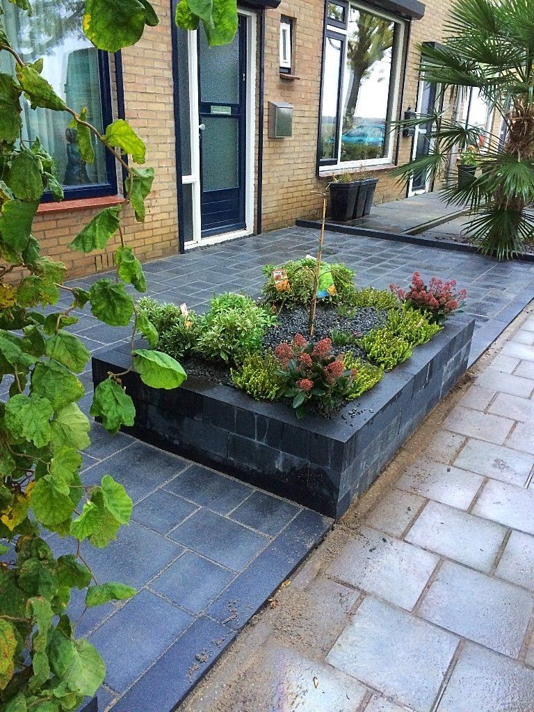 Ook 'gewone' bestrating kan gevoegd worden, waardoor er geen onkruid meer tussen de stenen zal groeien! De verhoogde border van lineablokken met mooie beplanting is een blikvanger in deze voortuin. In de verhoogde border is anti-worteldoek, afgewerkt met split, gebruikt zodat ook hier geen onkruid zal groeien.
