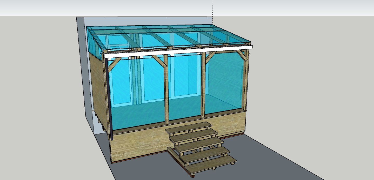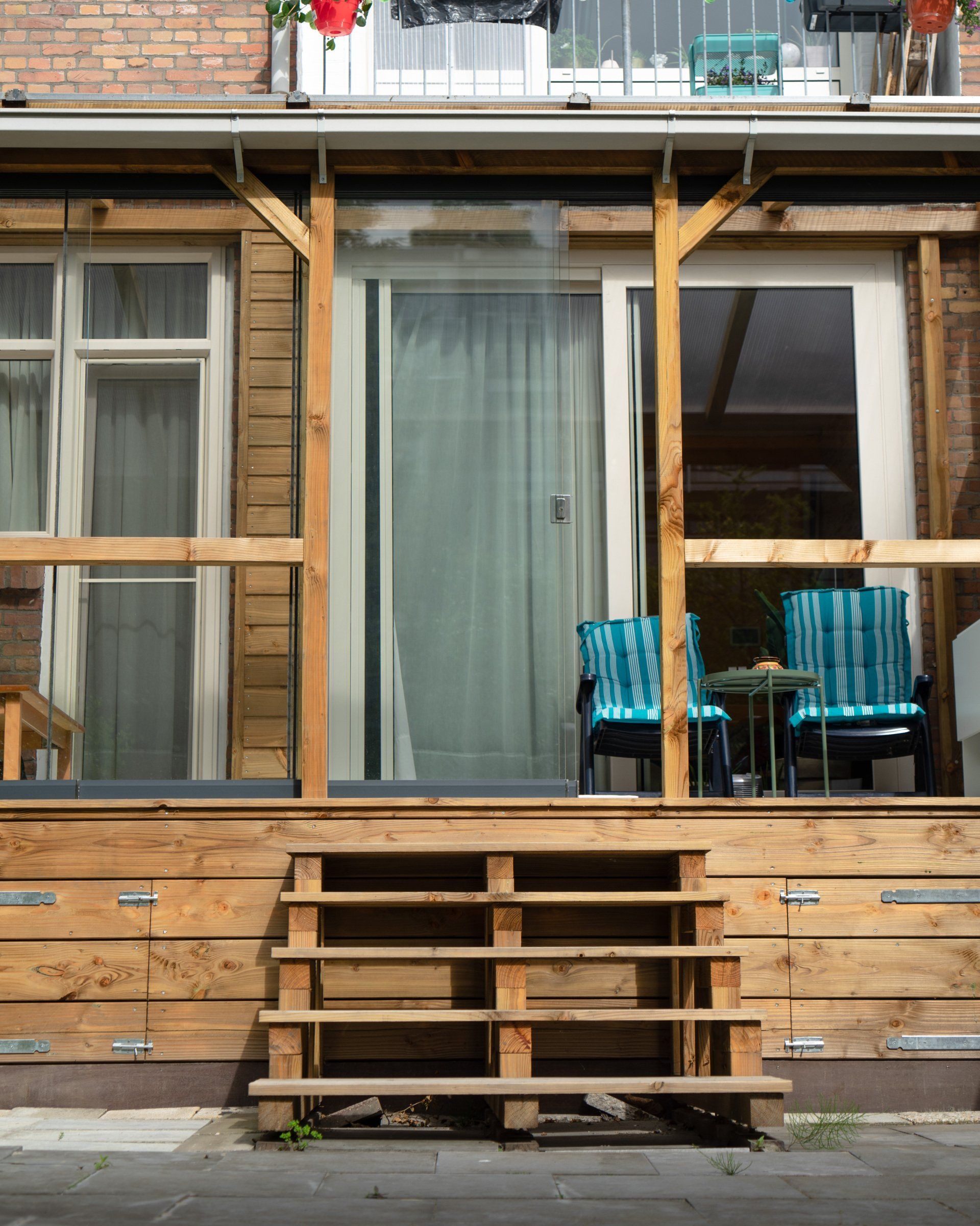 Deze unieke op maat gemaakte overkapping met glazen schuifpui, ramen en polycarbonaat platen, is een staaltje vakwerk! Ook het trapje, schutting en de luiken voor de bereikbaarheid van de ruimte onder de overkapping is vakwerk. Alles van douglashout en hardhout vervaardigd.
