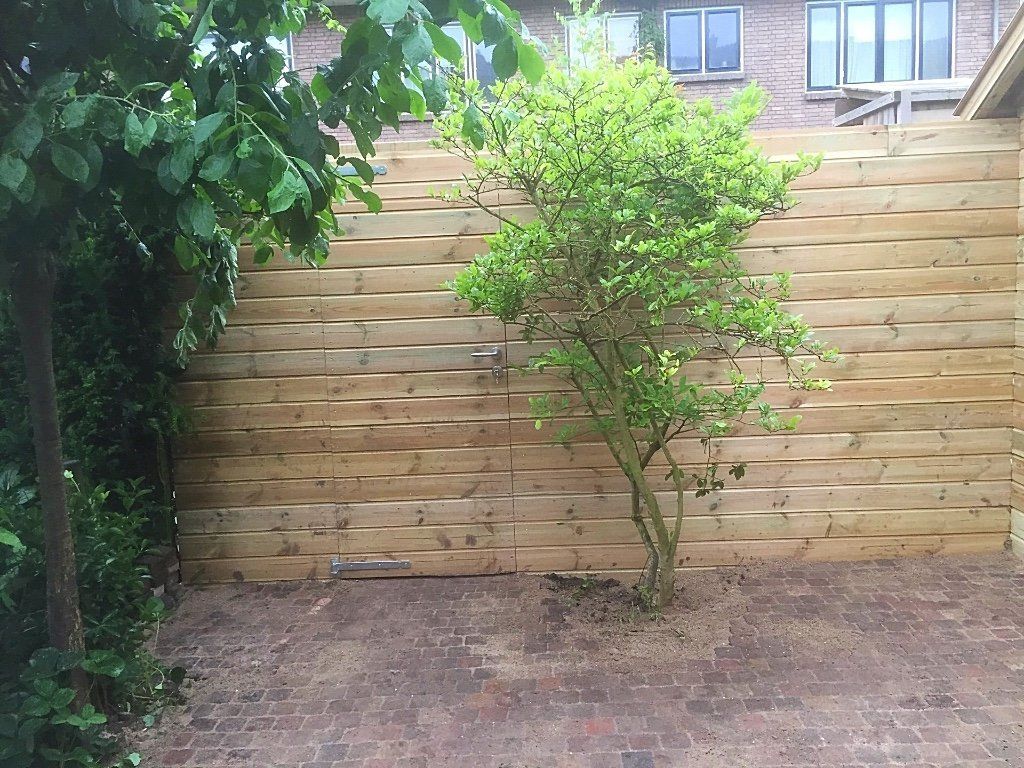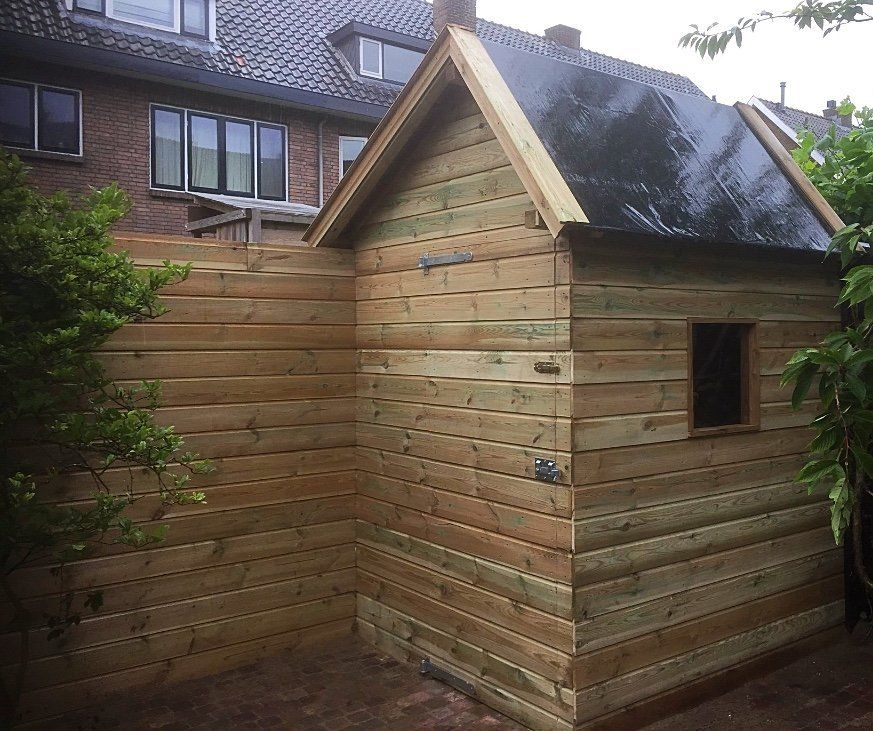 Schutting en schuur zijn gemaakt van geïmpregneerde rabatdelen. Het dak van de schuur is voorzien van rubberflex. De planken lopen mooi door, bij zowel de deur van de schuur als de schutting. Alleen het beslag verraad dat er een deur zit! Aan de zijkant van de schuur is een raam gerealiseerd van plexiglas voor de benodigde lichtinval.
