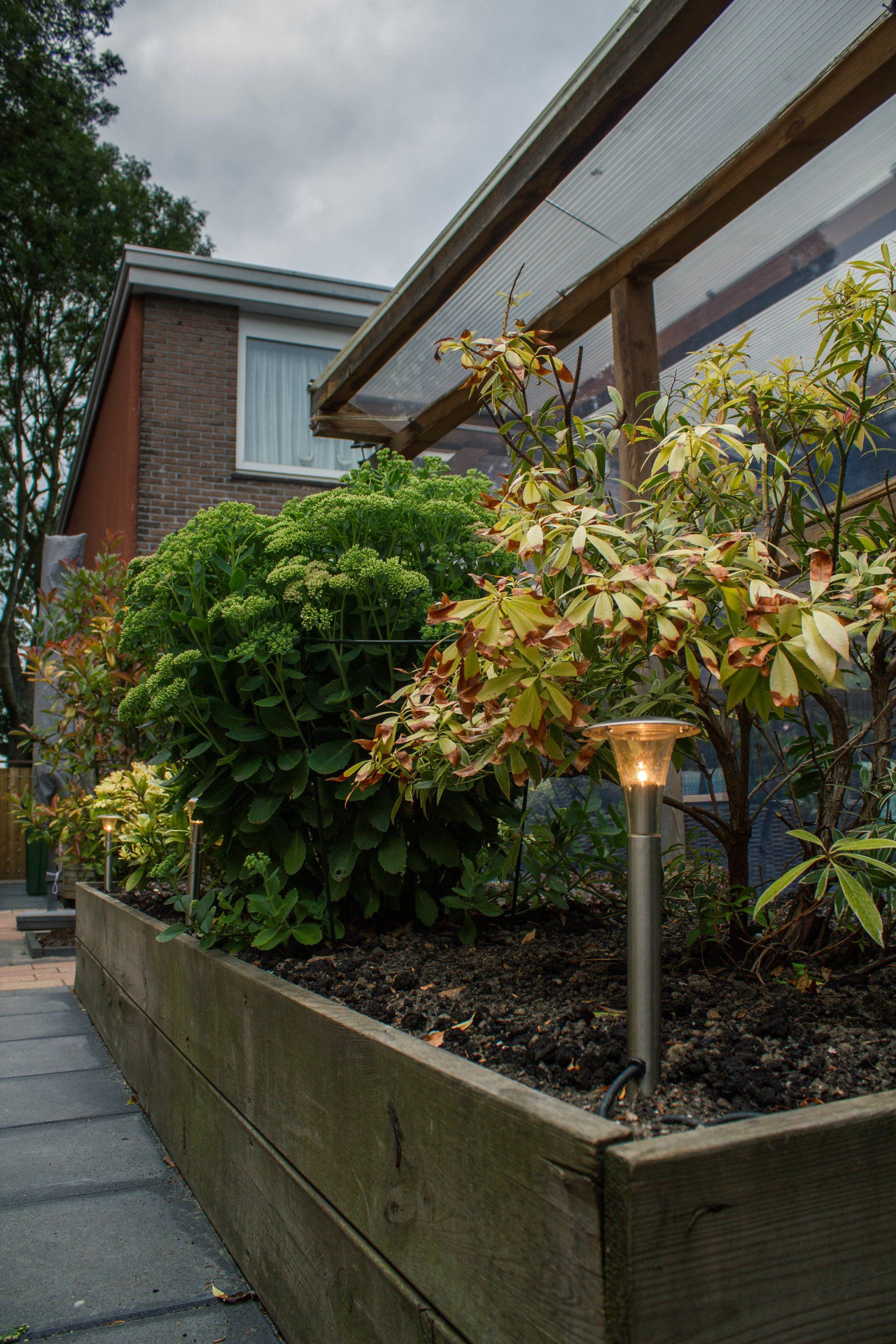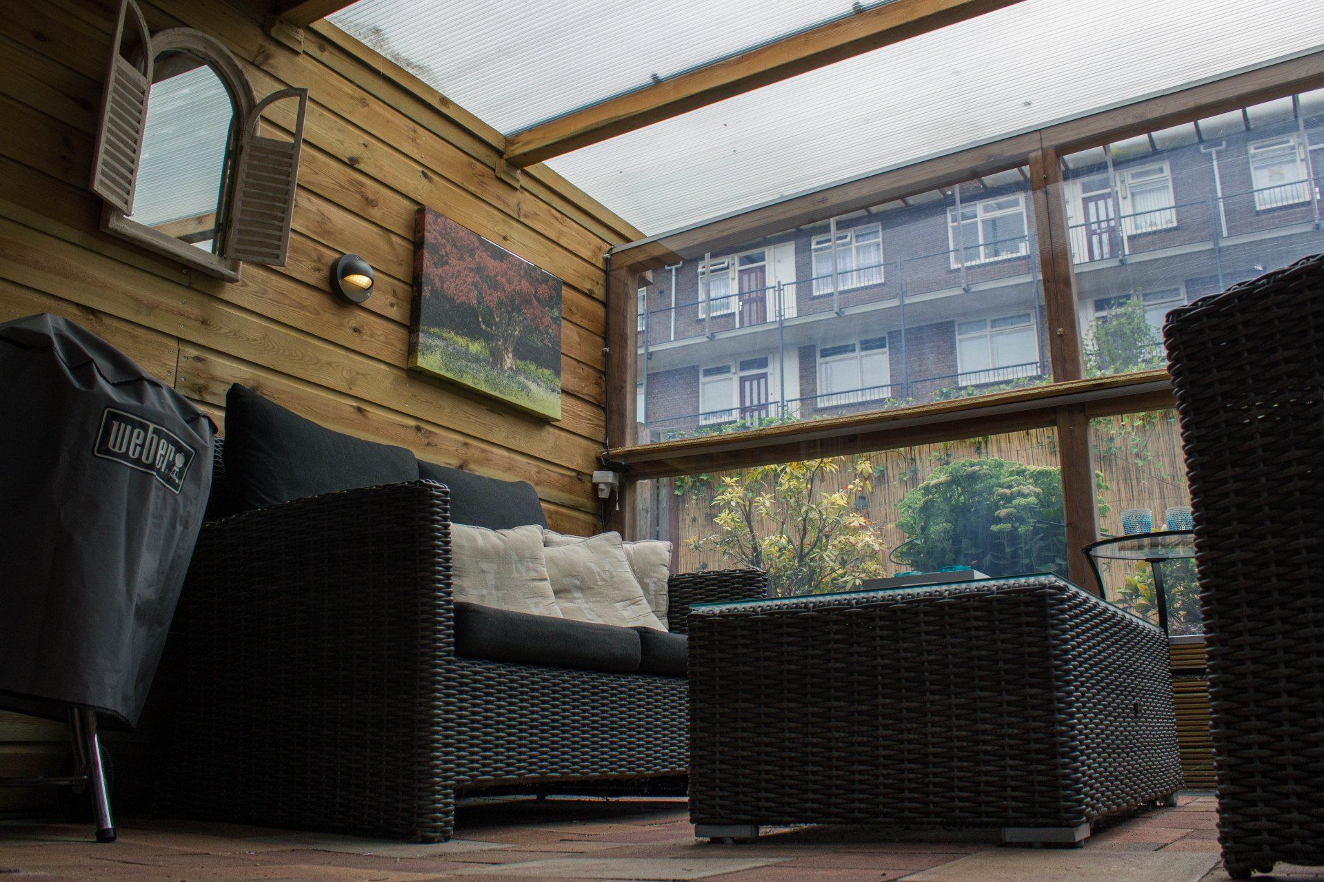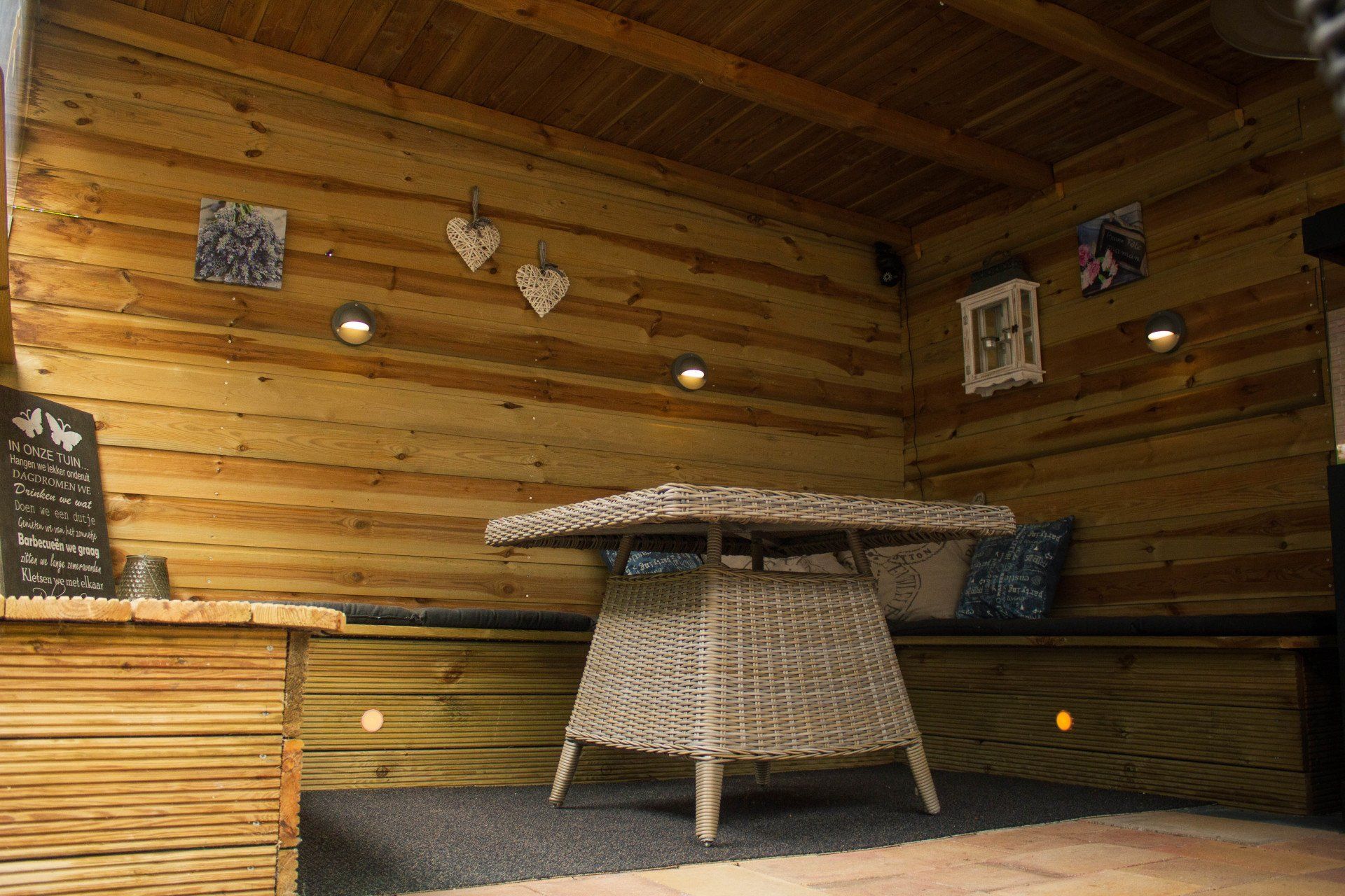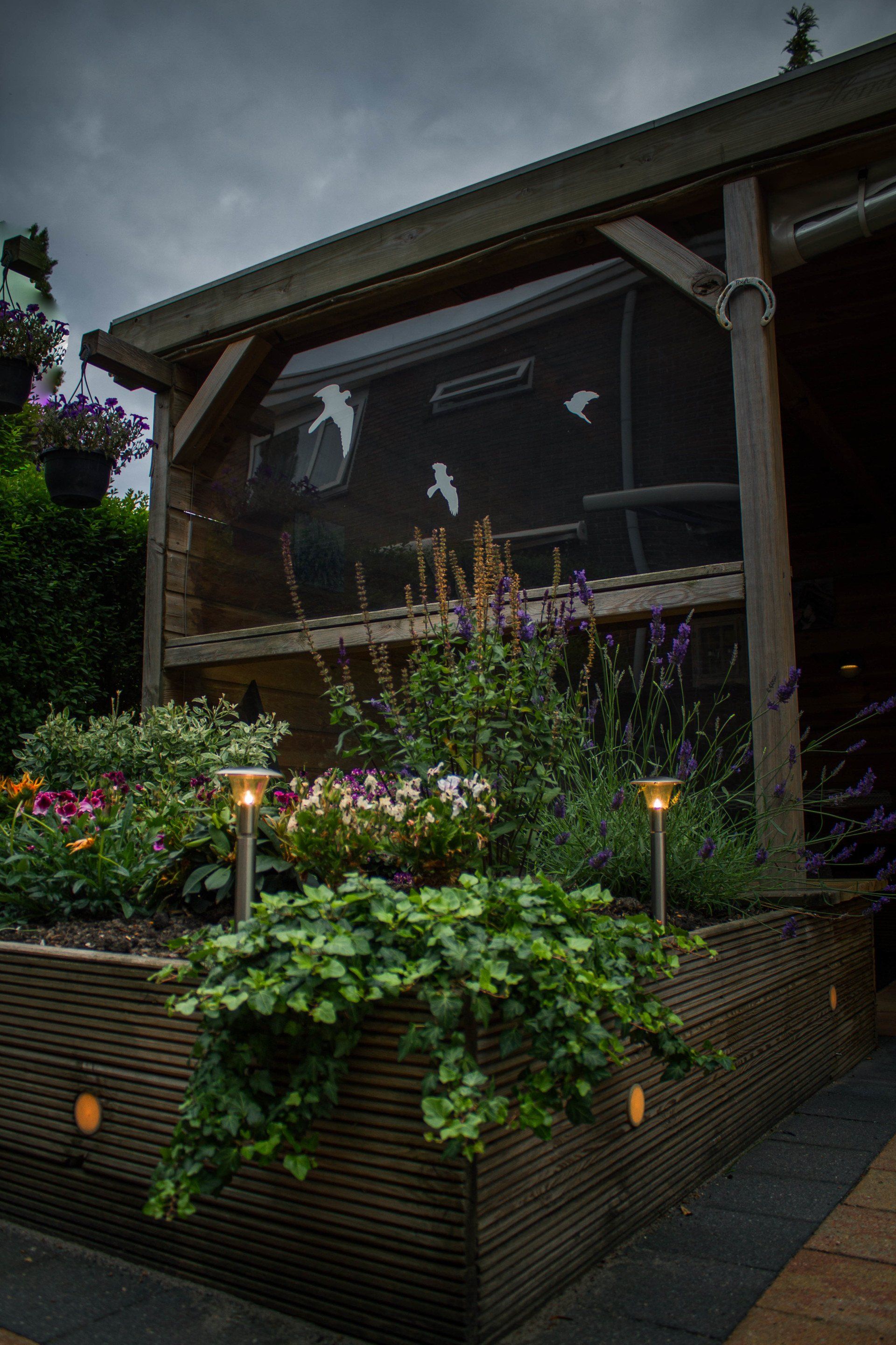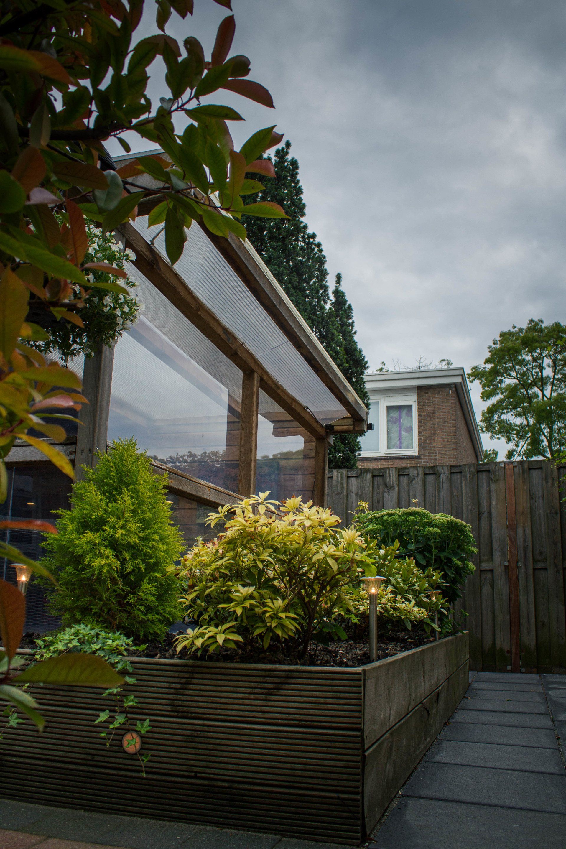 Er is zoveel meer genot in deze tuin! Zomer en winter kunnen genieten in deze geweldige overkapping! Zodra het koud wordt gaan de plexiplaten in de openingen van de overkapping en de haard aan. De bankjes in de overkapping, en de verlichting geven het een extraatje.De overkapping heeft deels een lichtdoorlatend dak en deels een donker dak. Ook de verhoogde bloembakken geven het een extra sfeer. En natuurlijk de 'wildverband' bestrating geeft het geheel een ruimtelijk effect. "Home Sweet Home" een fijn thuis gevoel!