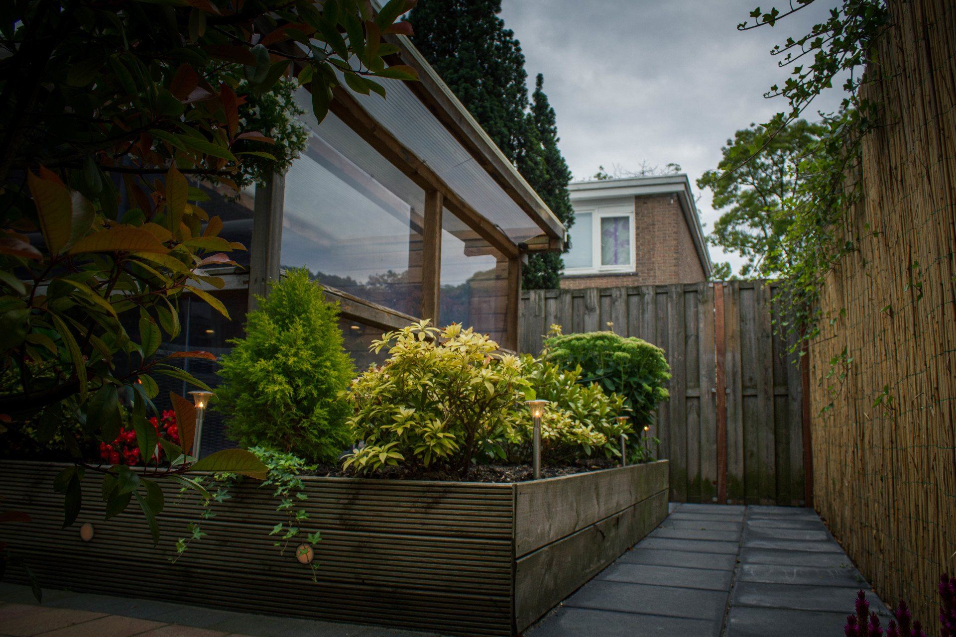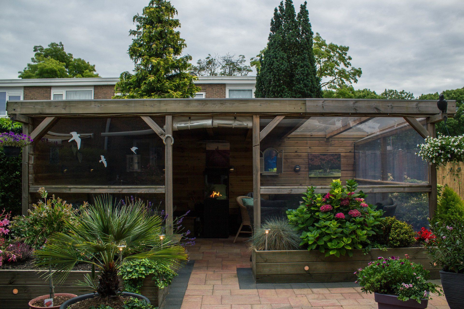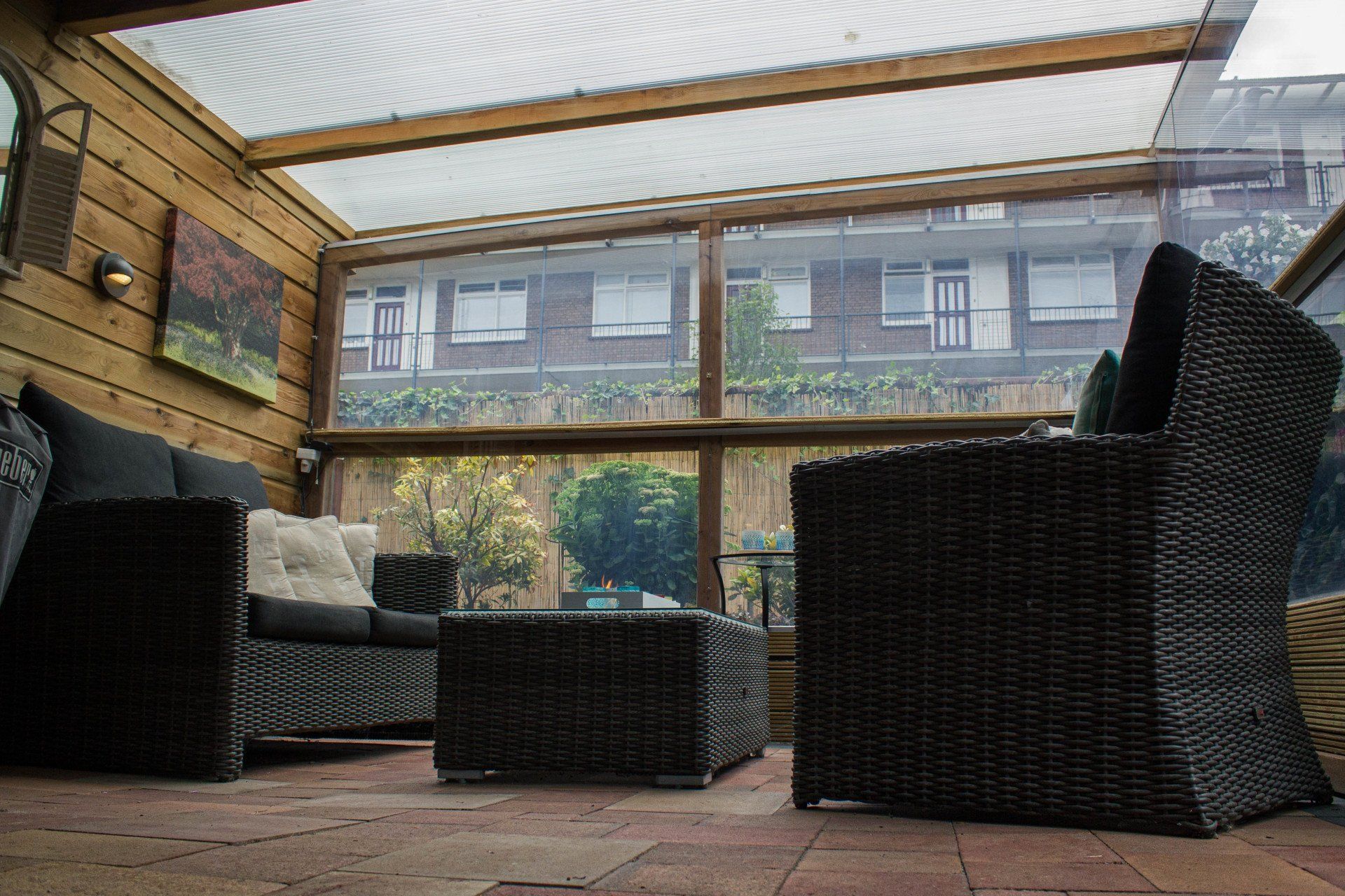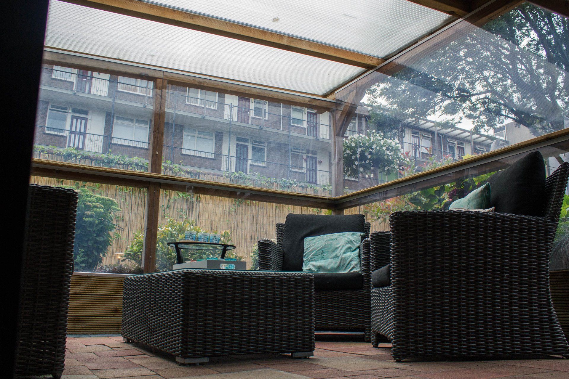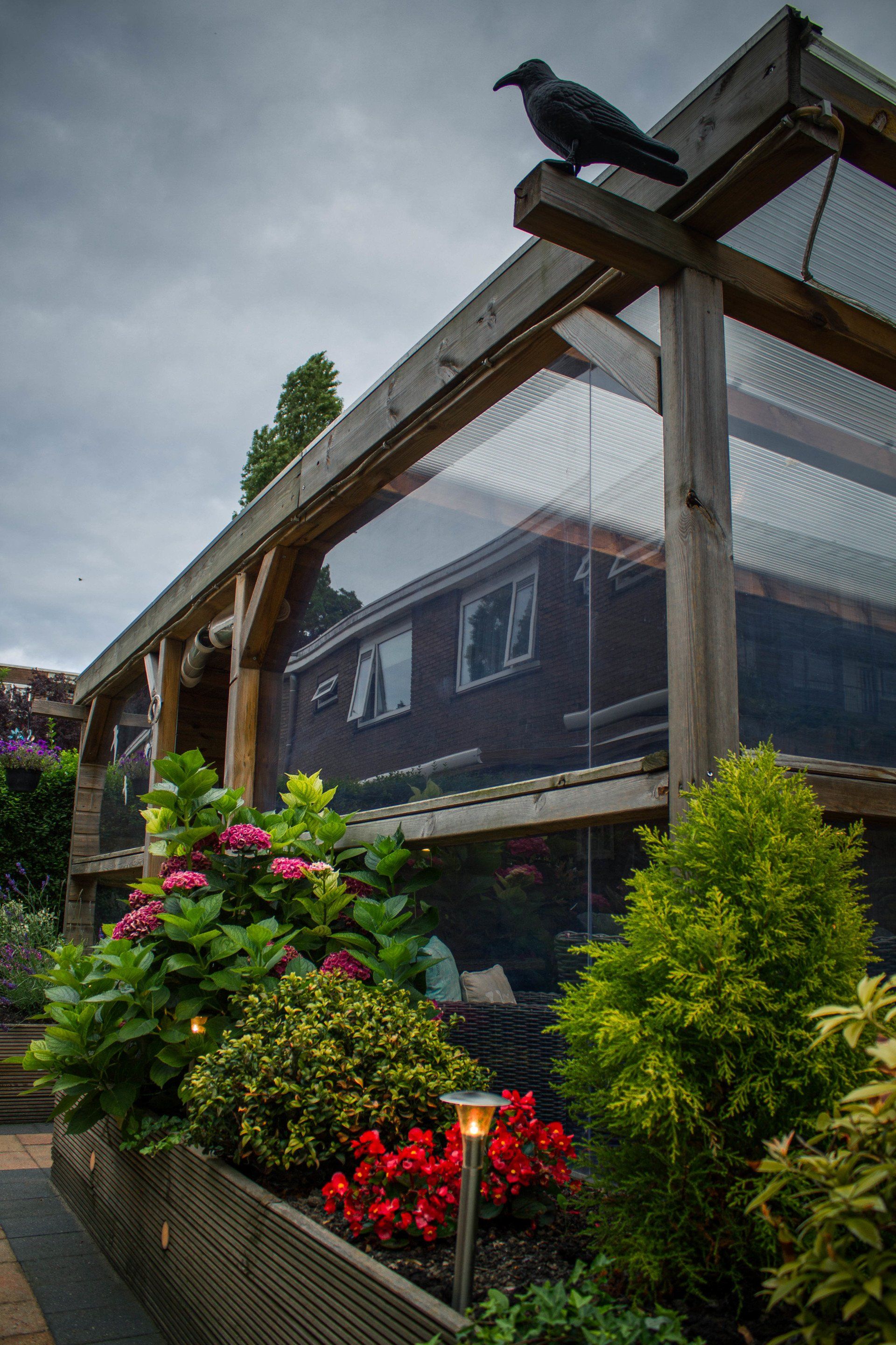 Er is zoveel meer genot in deze tuin! Zomer en winter kunnen genieten in deze geweldige overkapping! Zodra het koud wordt gaan de plexiplaten in de openingen van de overkapping en de haard aan. De bankjes in de overkapping, en de verlichting geven het een extraatje.De overkapping heeft deels een lichtdoorlatend dak en deels een donker dak. Ook de verhoogde bloembakken geven het een extra sfeer. En natuurlijk de 'wildverband' bestrating geeft het geheel een ruimtelijk effect. "Home Sweet Home" een fijn thuis gevoel!