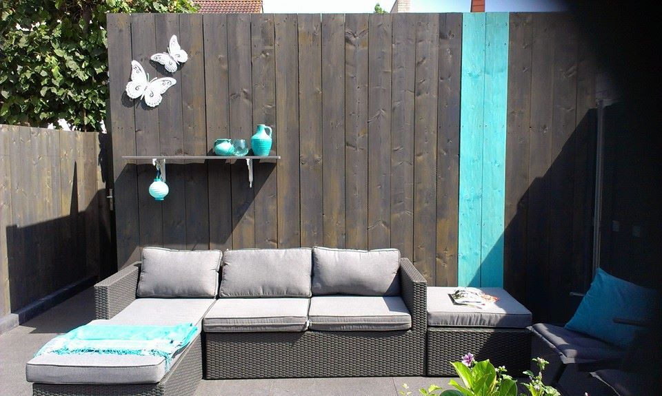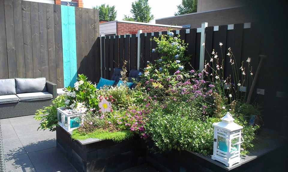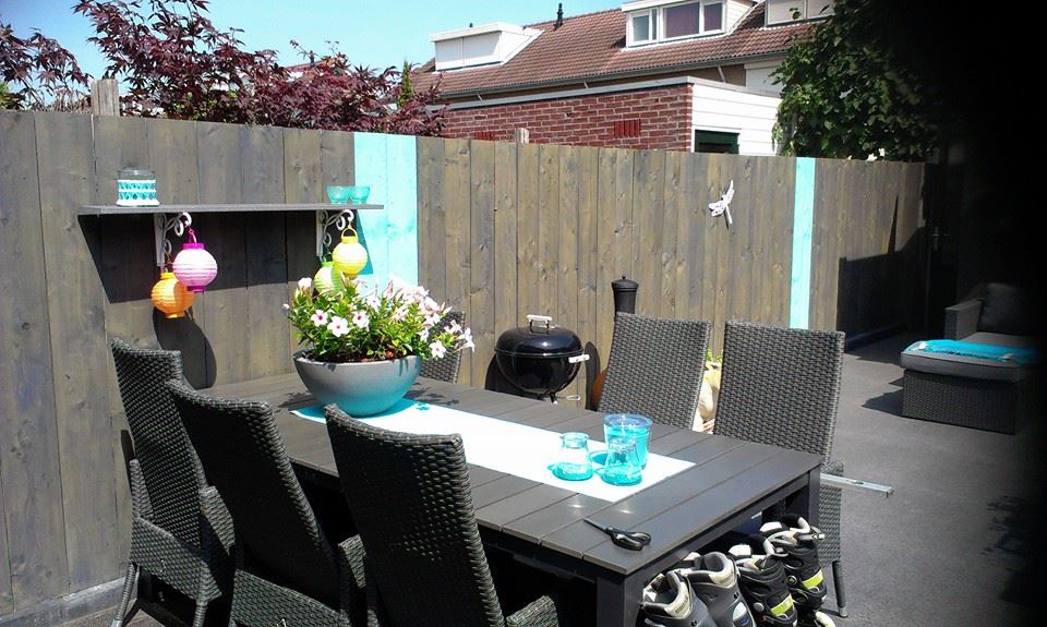Keramiek, gevoegd gelegd dus geen onkruid tussen de tegels. Zelfbouwschutting, met mooie kleuren geschilderd. Lineablokken voor verhoogde bloembakken.