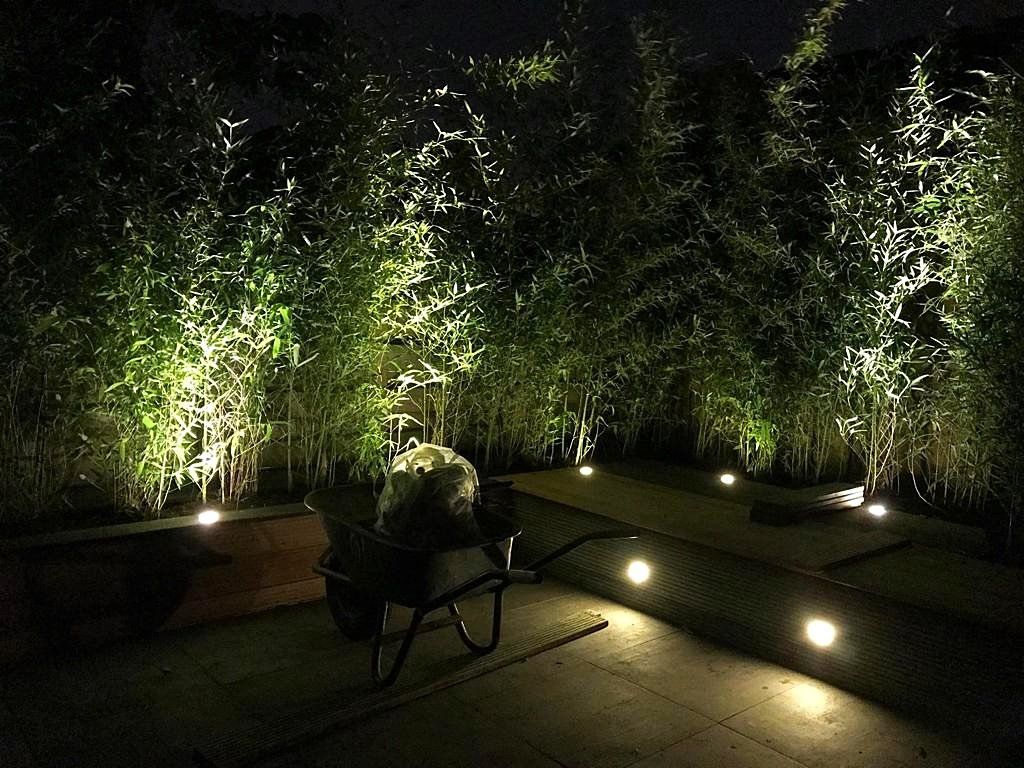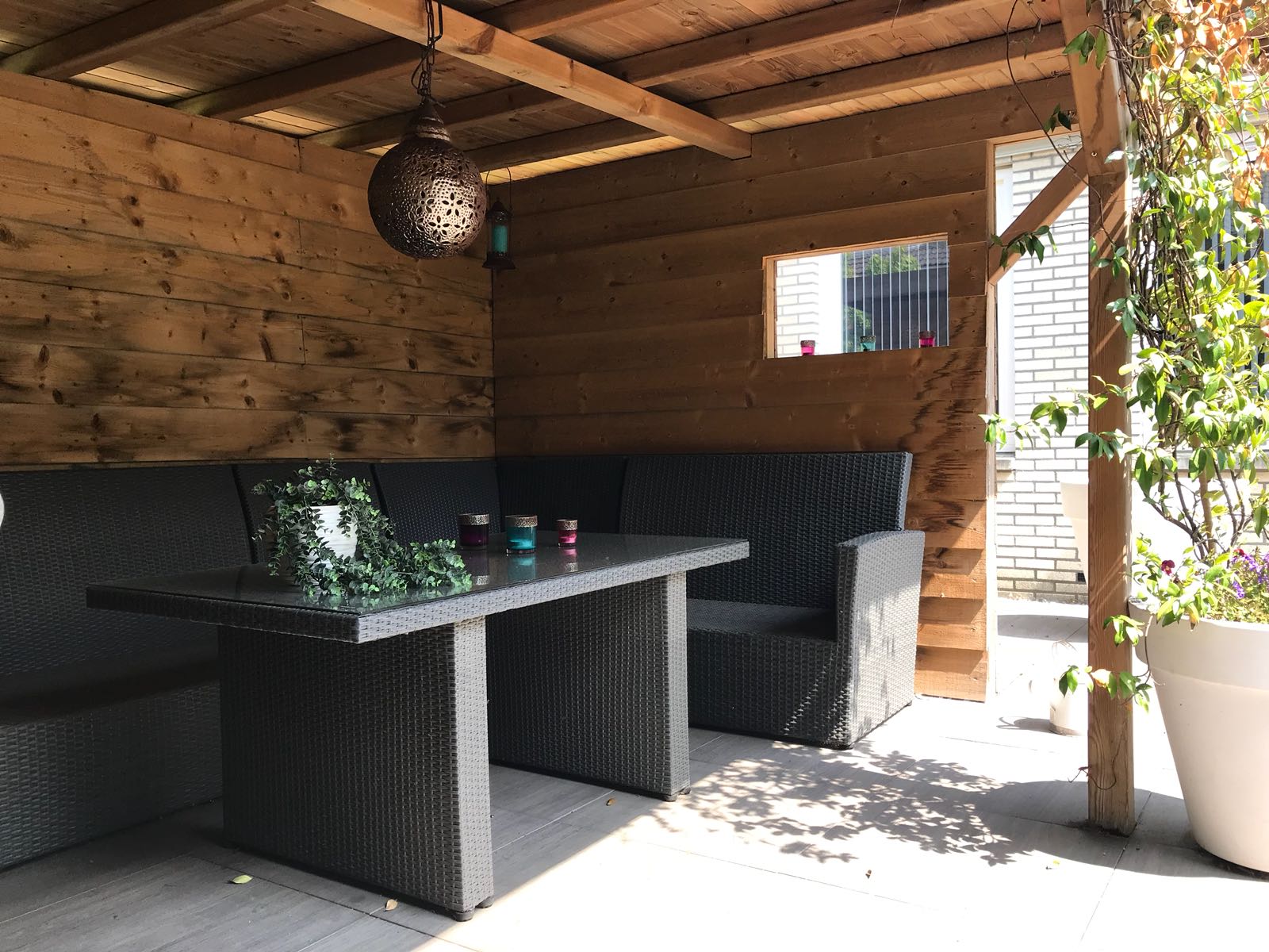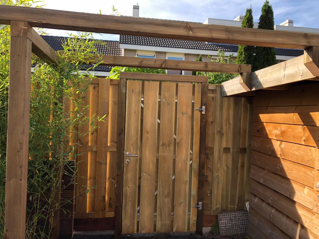 Mooie verlichting in de bakken en in de bamboe. Overkapping en schuur van Zweeds rabat en plexiglas ramen. Nette nieuwe schutting en poort waarop een pergola is gemonteerd, deze wordt begroeid met Toscaanse Jasmijn en groenblijvende Clematis. Achter de bamboe is een ruimte gecreëerd voor een klikko. Mooie sfeervolle tuin met diverse zitgedeeltes.