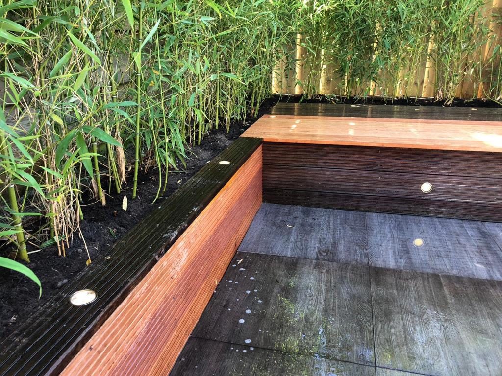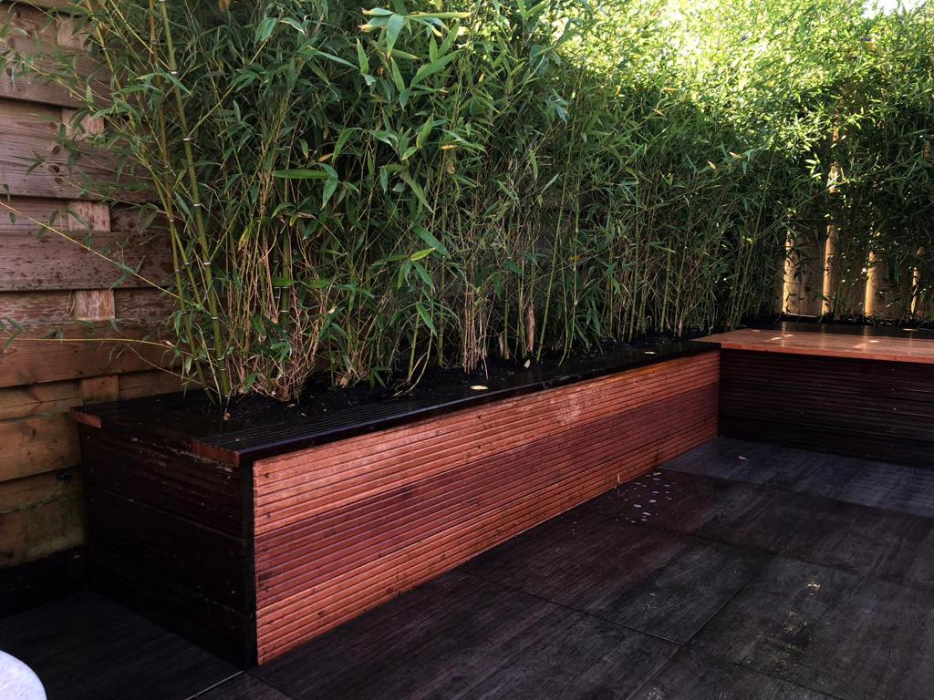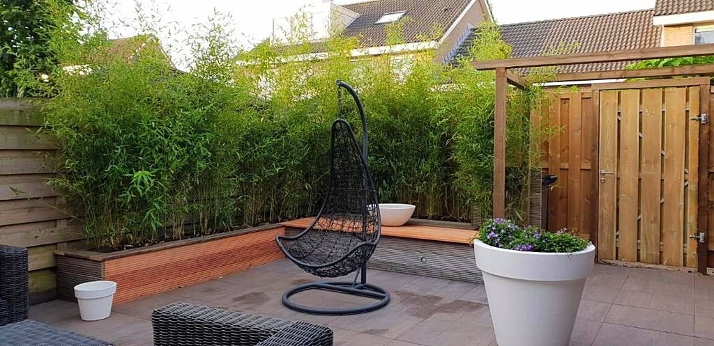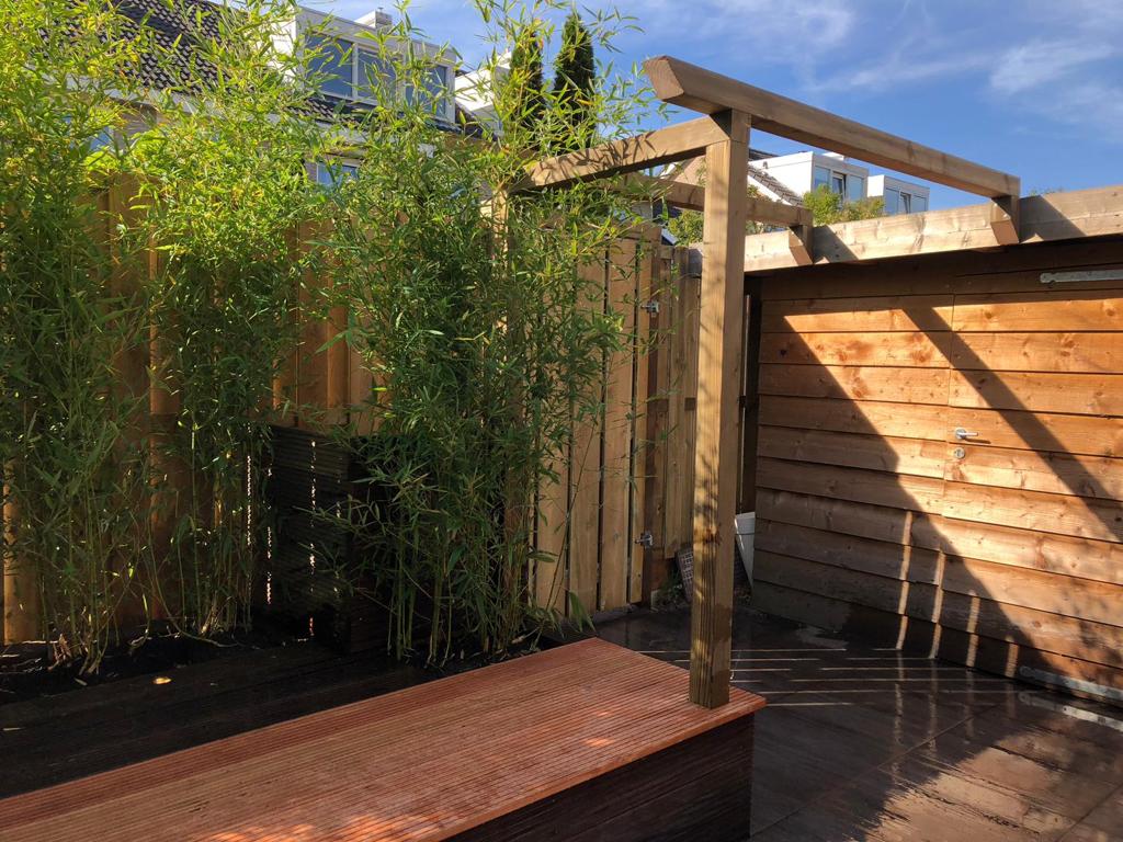 Deze tuin is een aantal jaar geleden aangelegd en onlangs aangepast. De vlonder is ingekort tot bakken met bamboe met een zitgedeelte. Gelukkig blijven er vaak wat tegels over bij het leggen van een terras waardoor we deze konden gebruiken op de plek van de vlonder. Keramiek grijs houtlook, gevoegd gelegd, dus geen onkruid tussen de tegels!