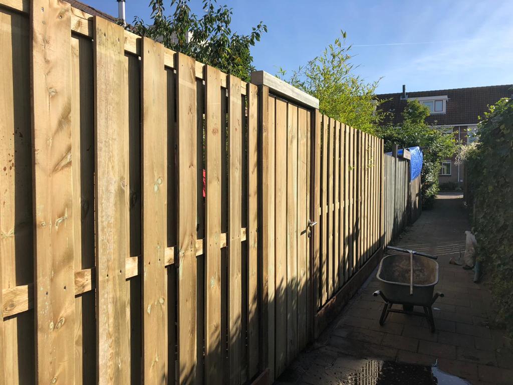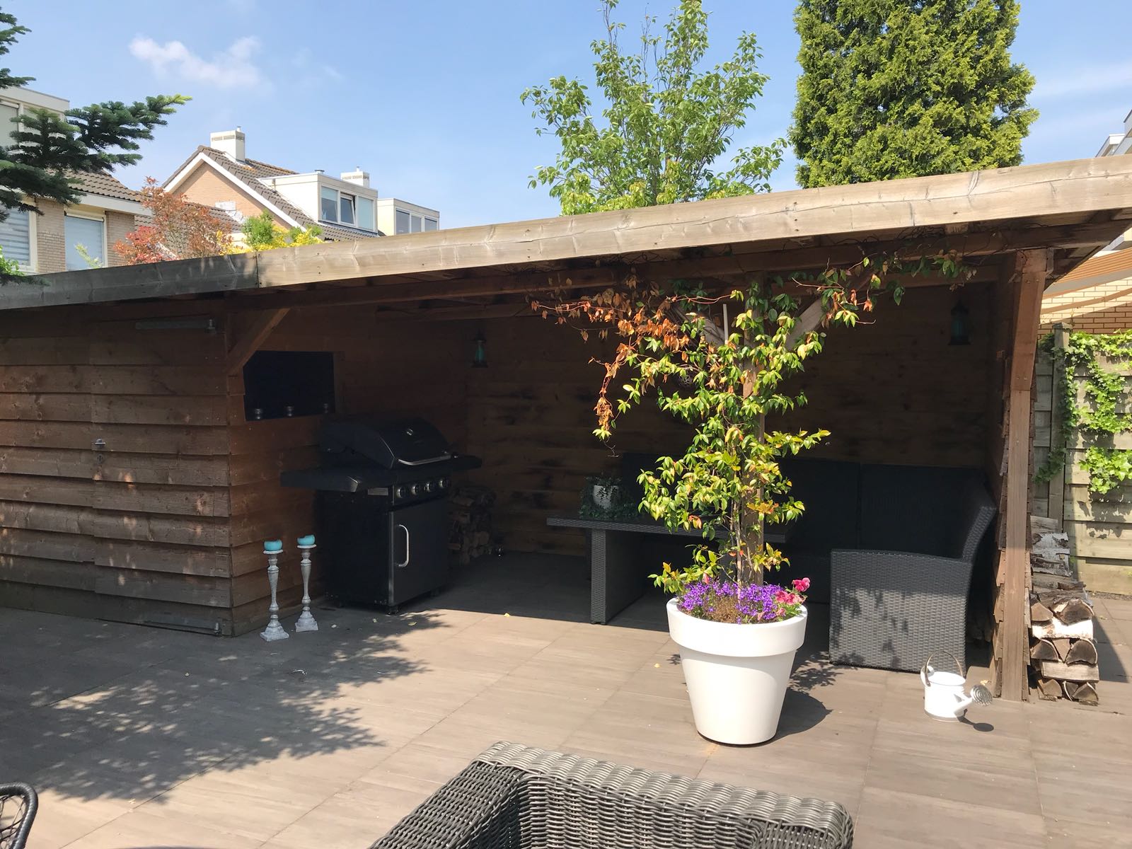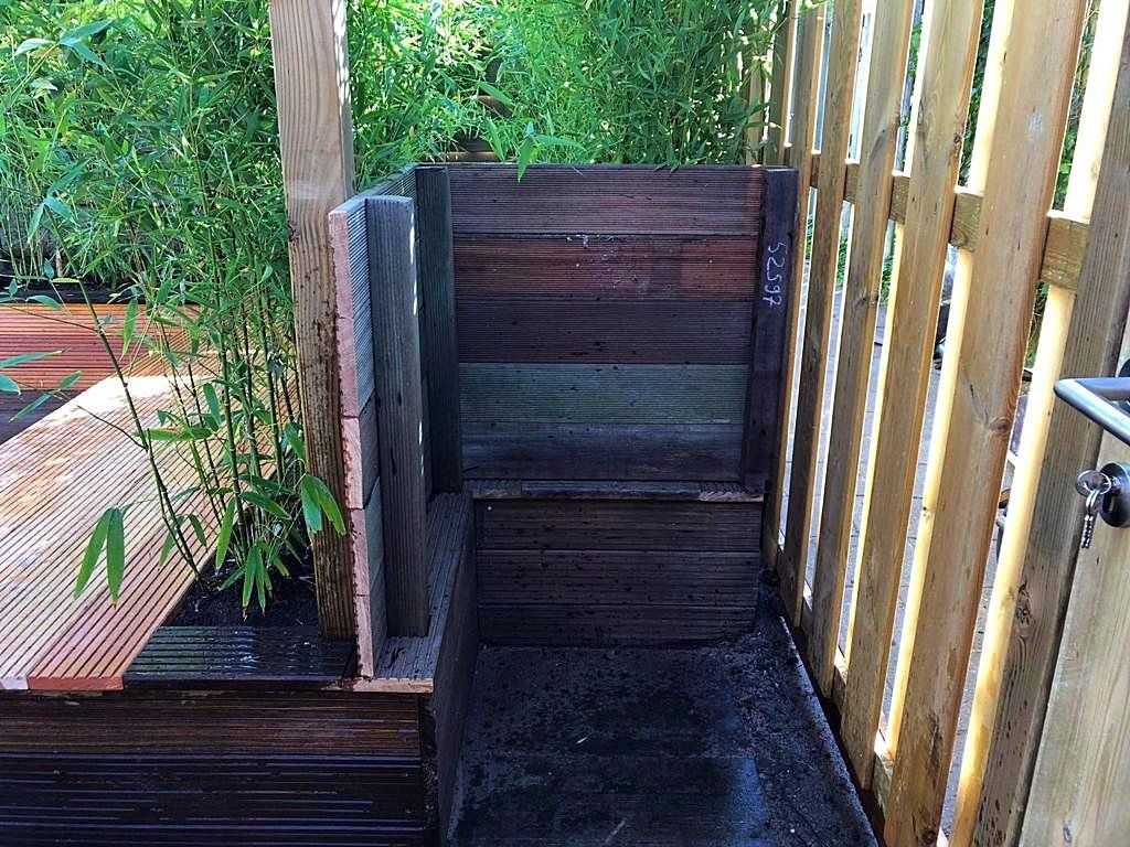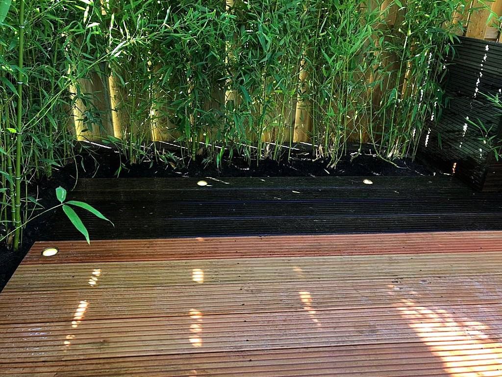 Deze tuin is een aantal jaar geleden aangelegd en onlangs aangepast. De vlonder is ingekort tot bakken met bamboe met een zitgedeelte. Gelukkig blijven er vaak wat tegels over bij het leggen van een terras waardoor we deze konden gebruiken op de plek van de vlonder. Keramiek grijs houtlook, gevoegd gelegd, dus geen onkruid tussen de tegels!