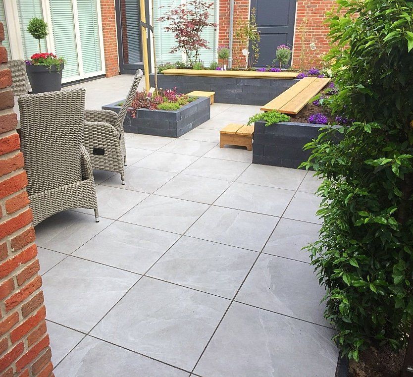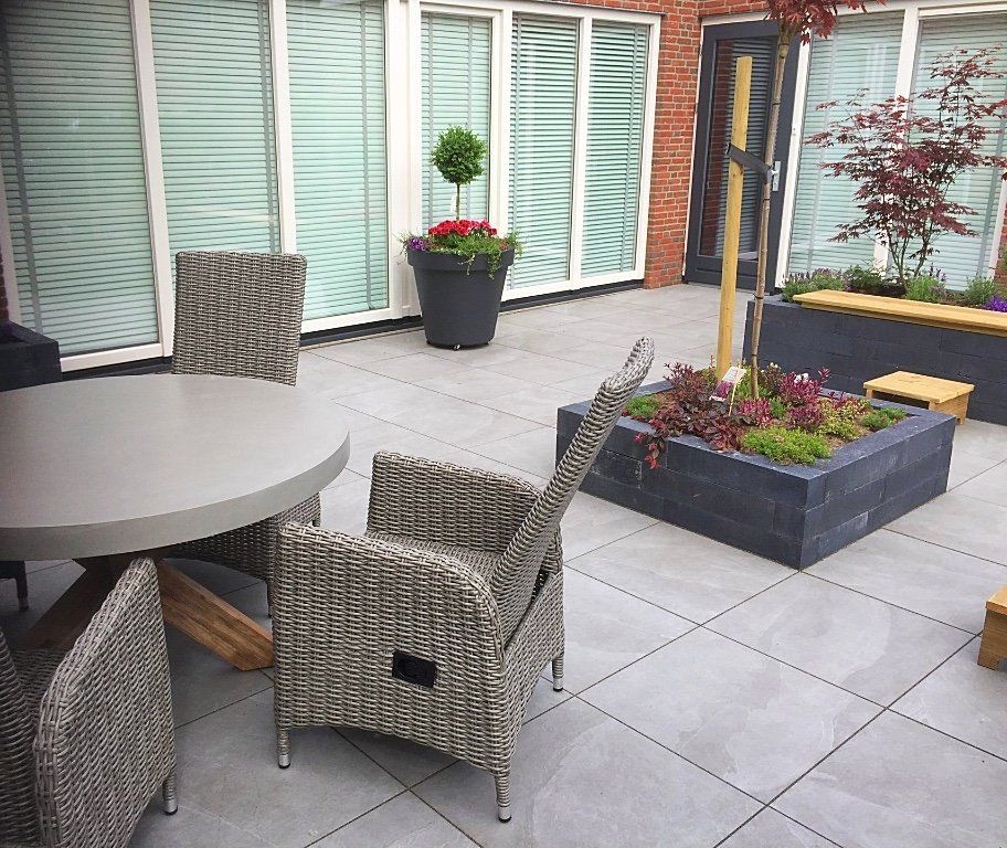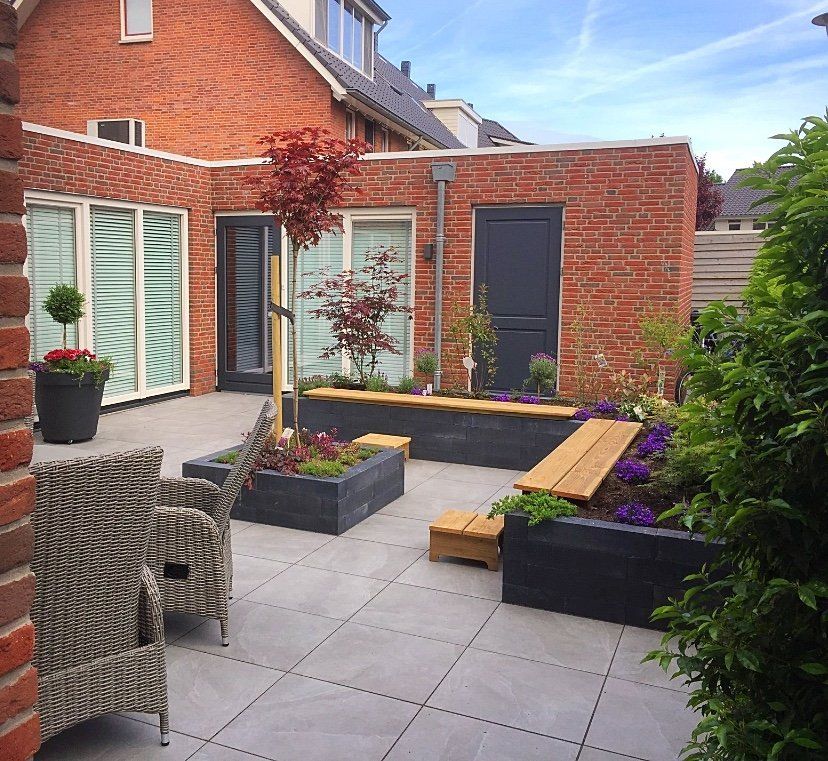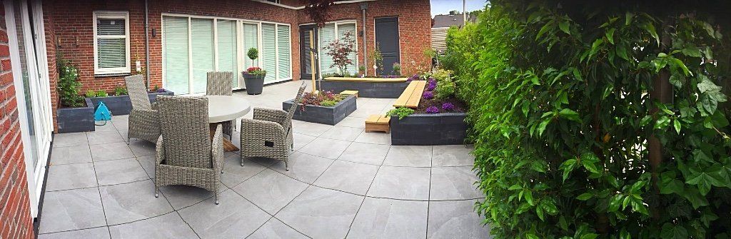 Mooie complete tuin met keramiek bestrating, verhoogde bloembakken van lineablokken, beplanting en douglasplanken voor leuke bankjes.