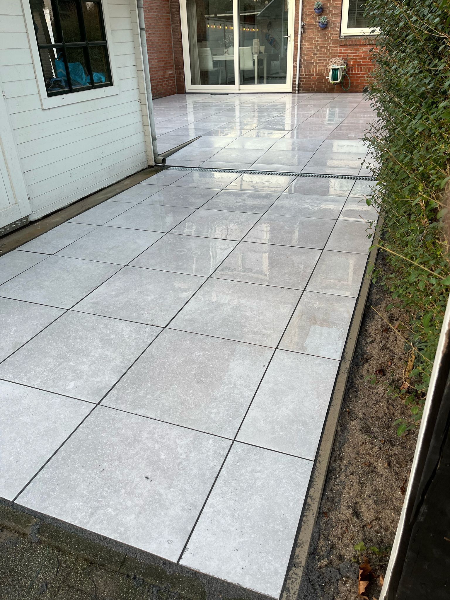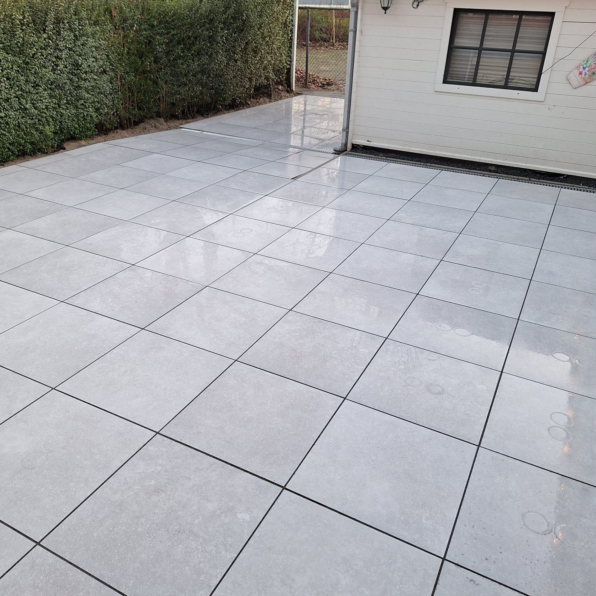 Keramiek 60x60x3 Cesano grey is vakkundig gevoegd gelegd, met een afwatering richting de draingoot bij de schuur. Door het voegen van de tegels wordt ervoor gezorgd dat water efficiënt kan weglopen, terwijl onkruid geen kans krijgt om tussen de voegen te groeien. Deze werkwijze garandeert niet alleen een strak en verzorgd uiterlijk, maar ook een minimaal onderhoud en een functionele oplossing voor een vochtige omgeving.