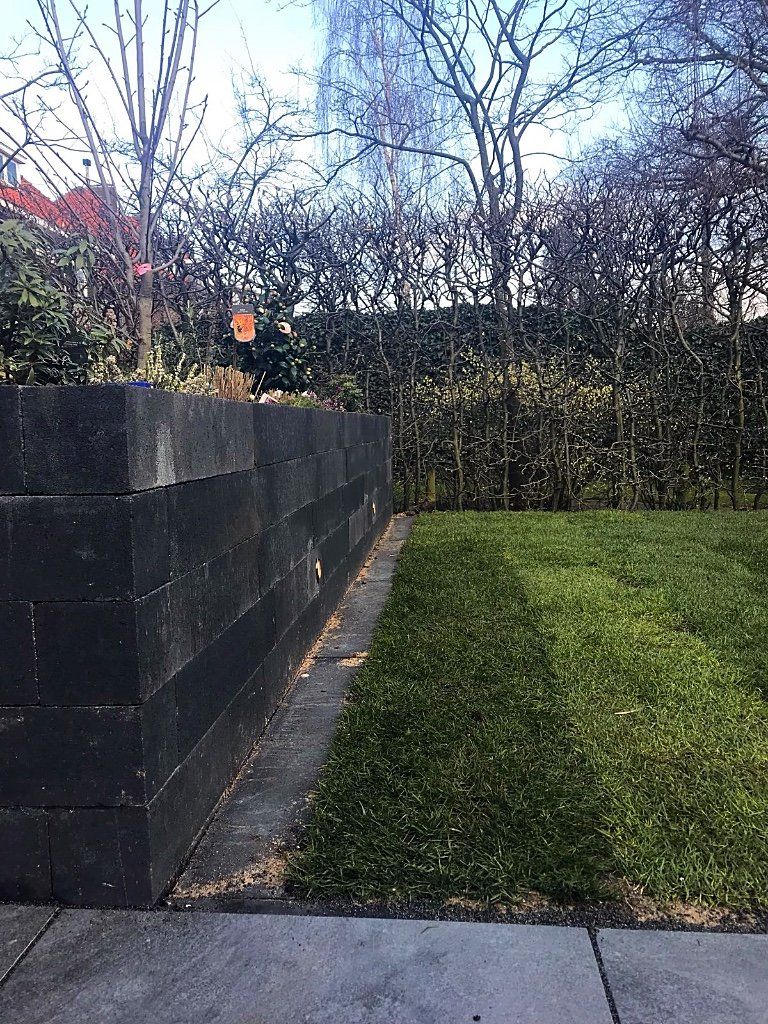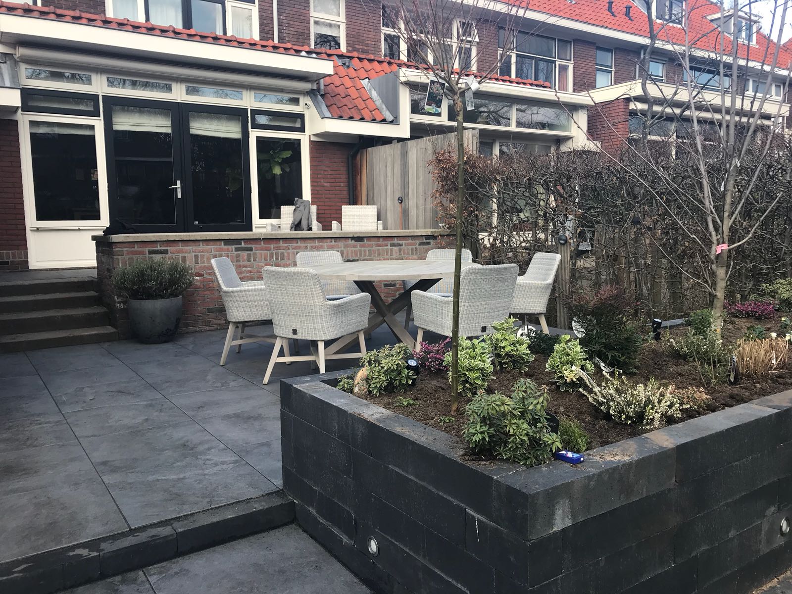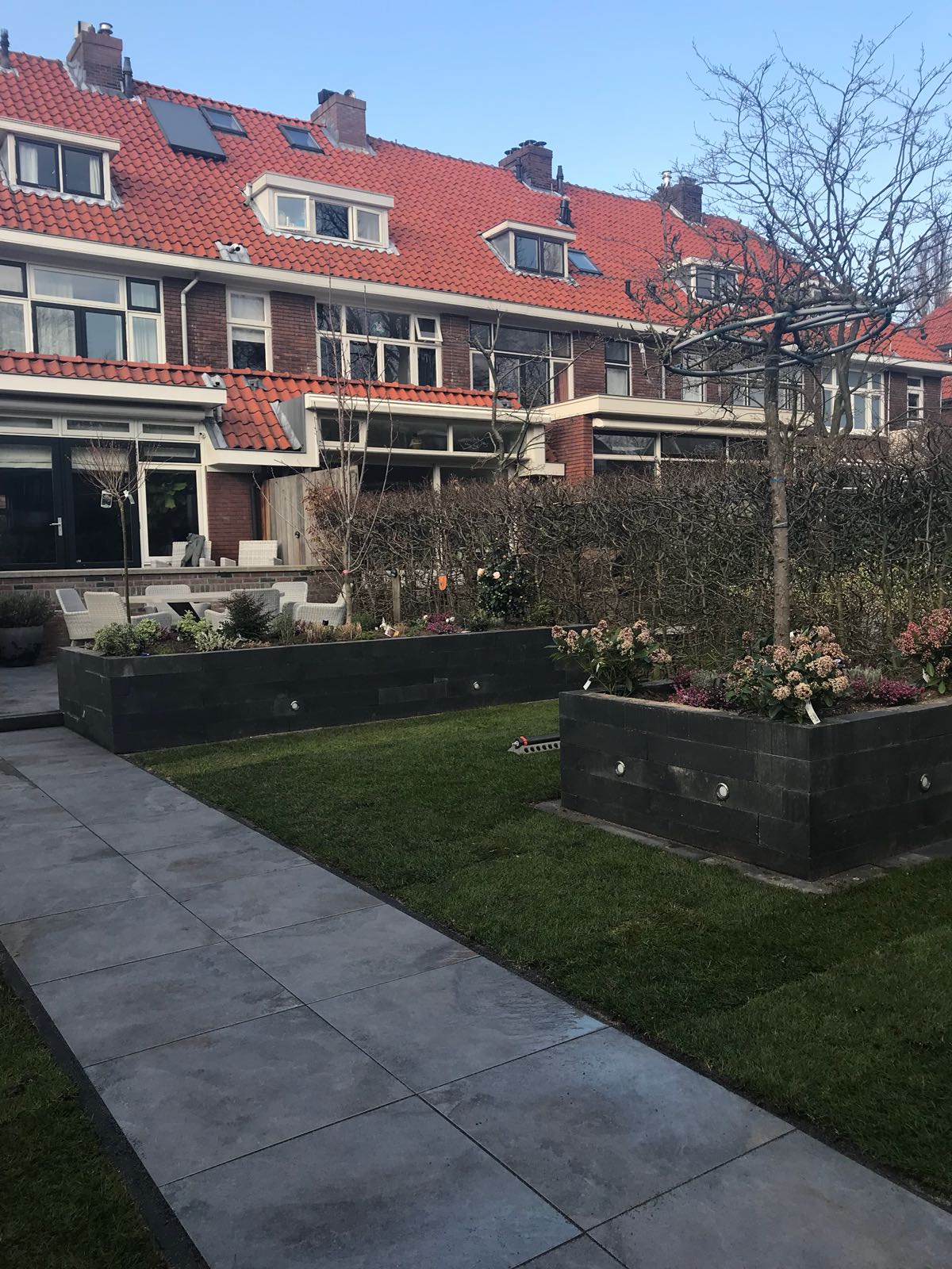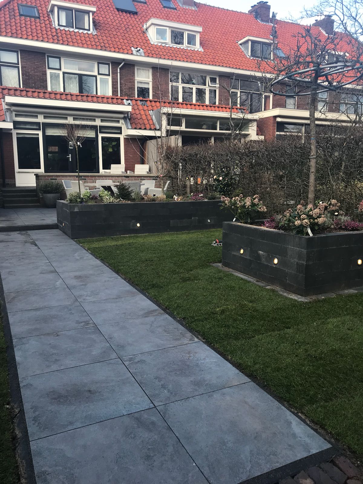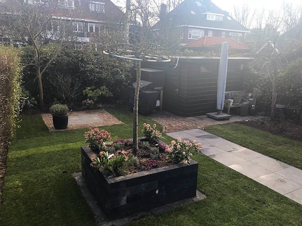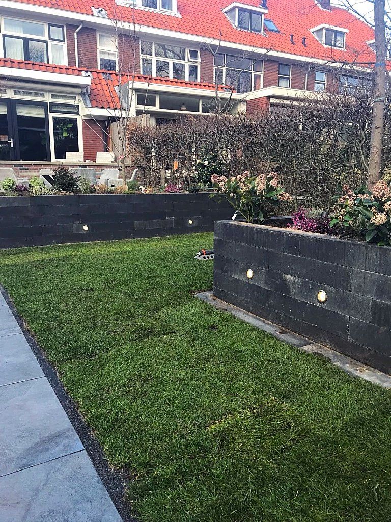 Mooie complete tuin met keramiek, verhoogde bakken van lineablokken. Afstapjes en trapjes van keramiek en lineablokken. Mooie beplanting en verlichting!