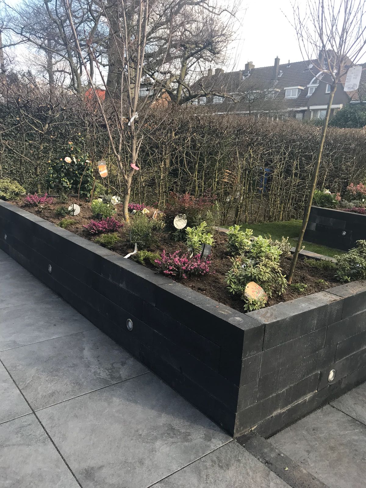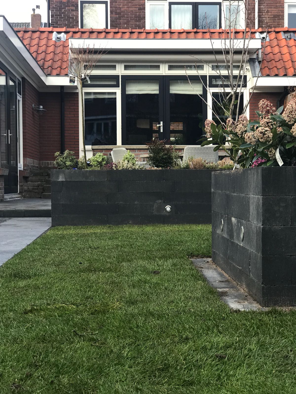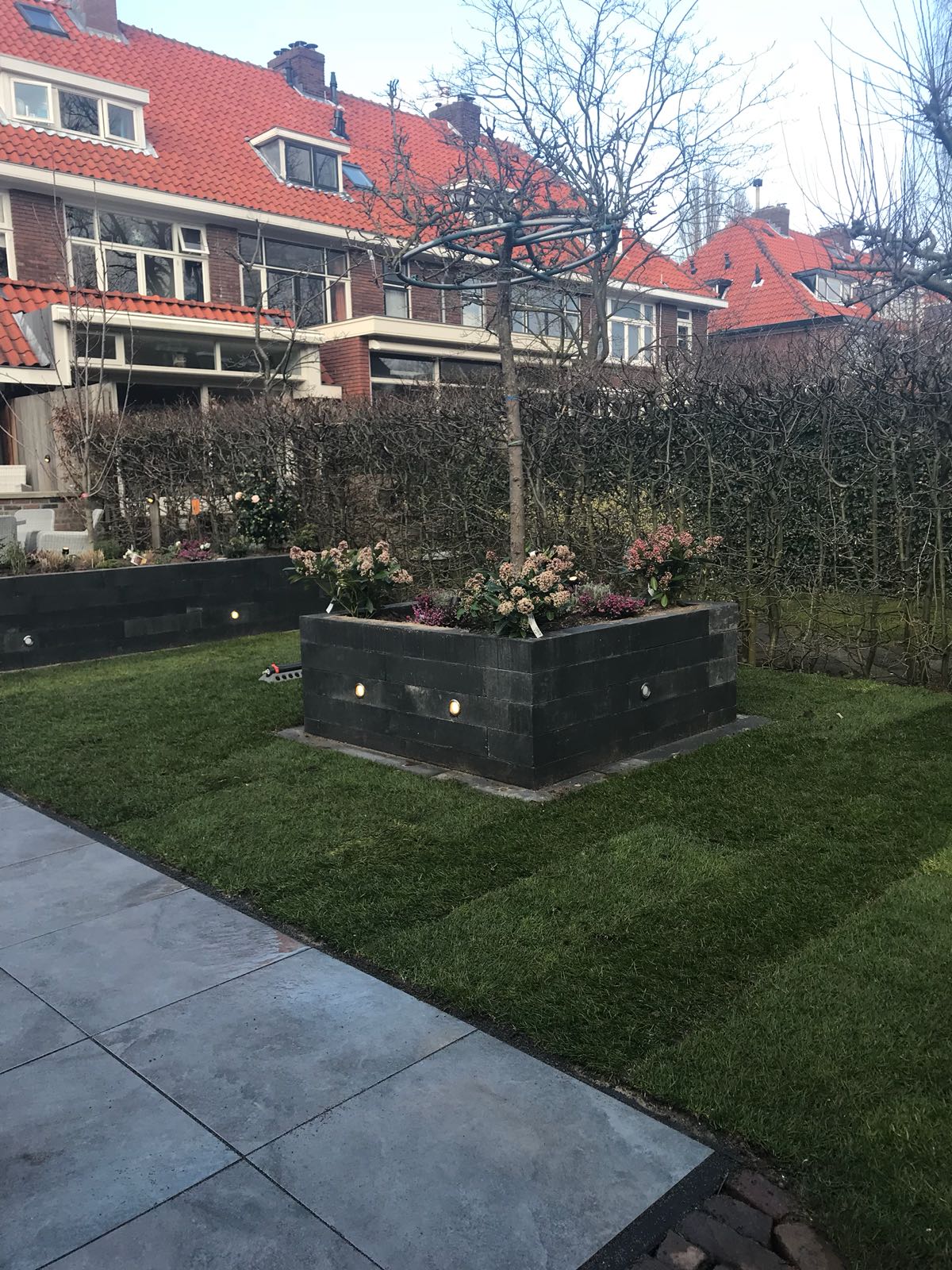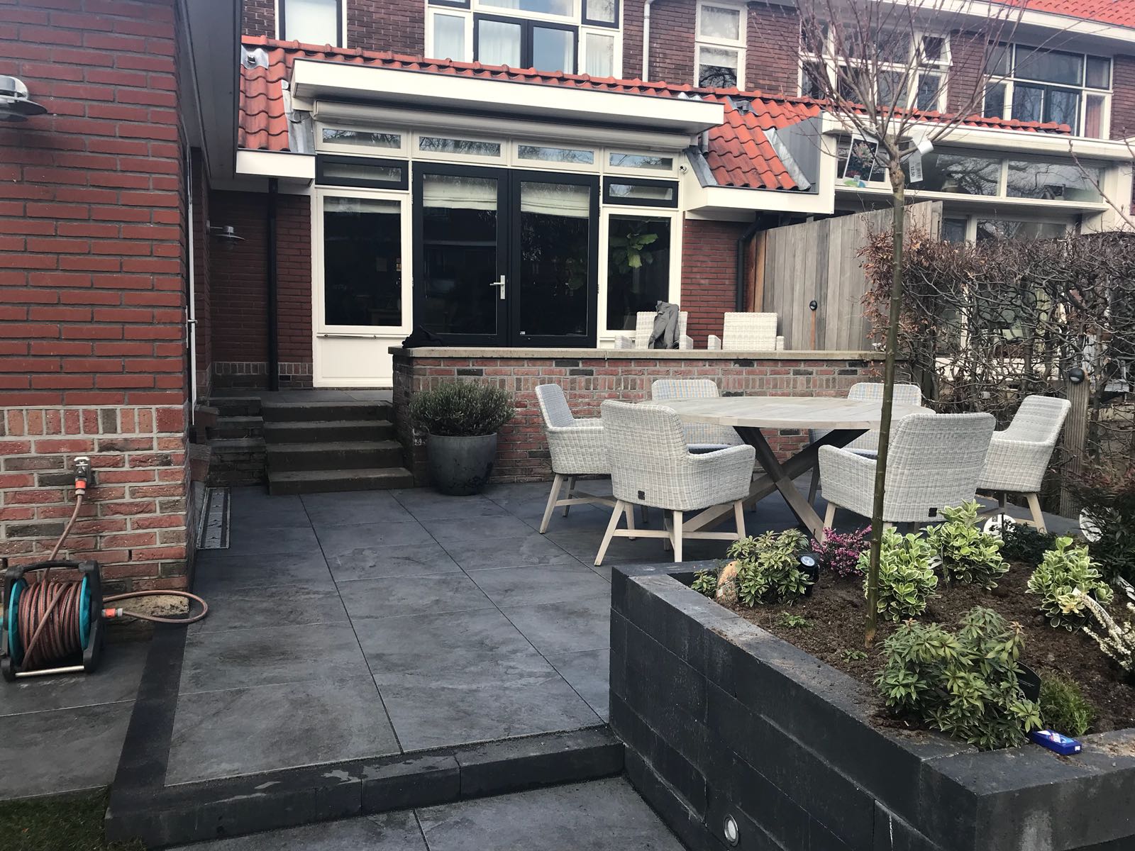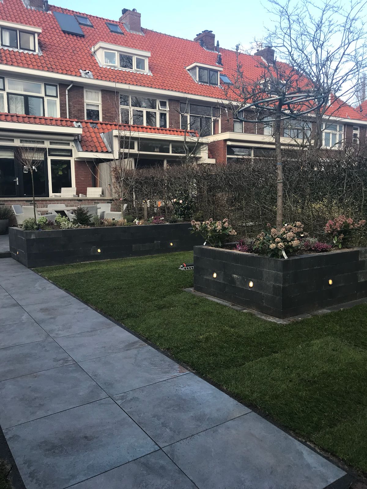Mooie complete tuin met keramiek, verhoogde bakken van lineablokken. Afstapjes en trapjes van keramiek en lineablokken. Mooie beplanting en verlichting!
