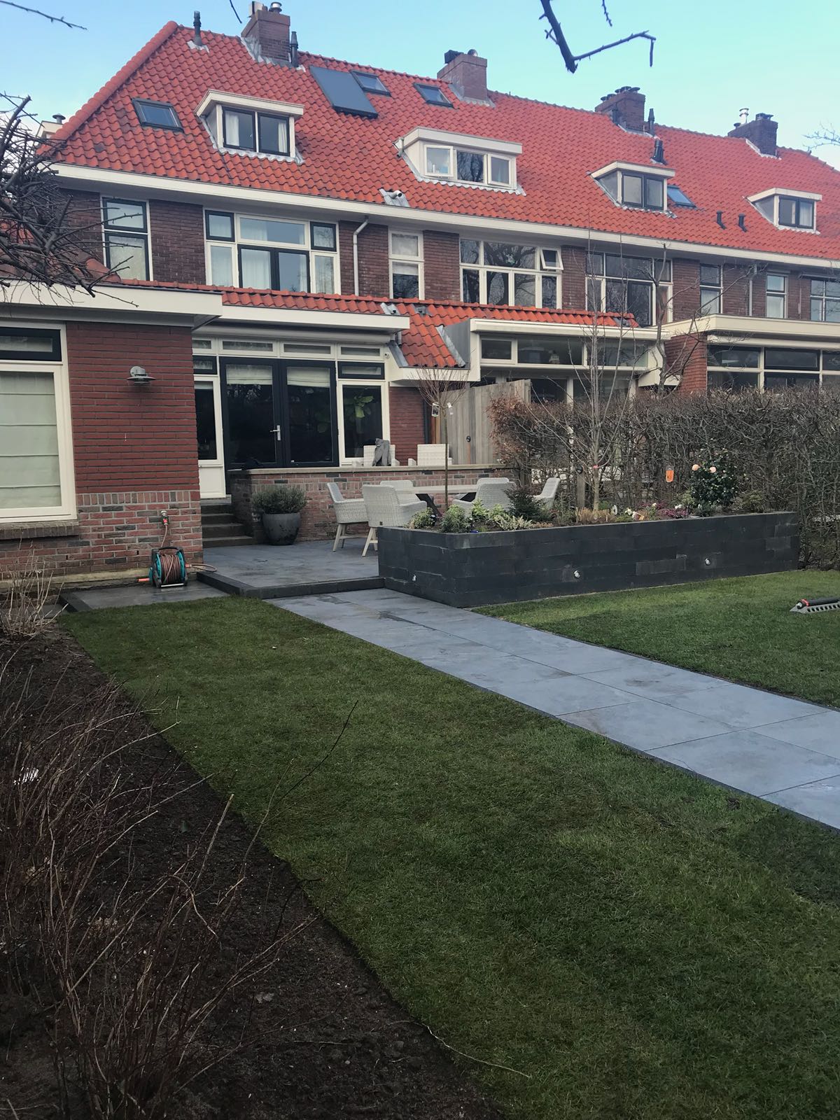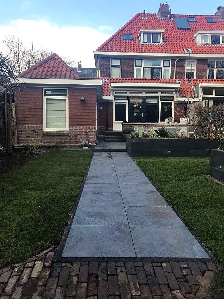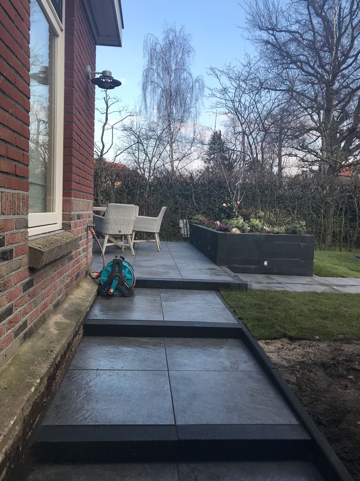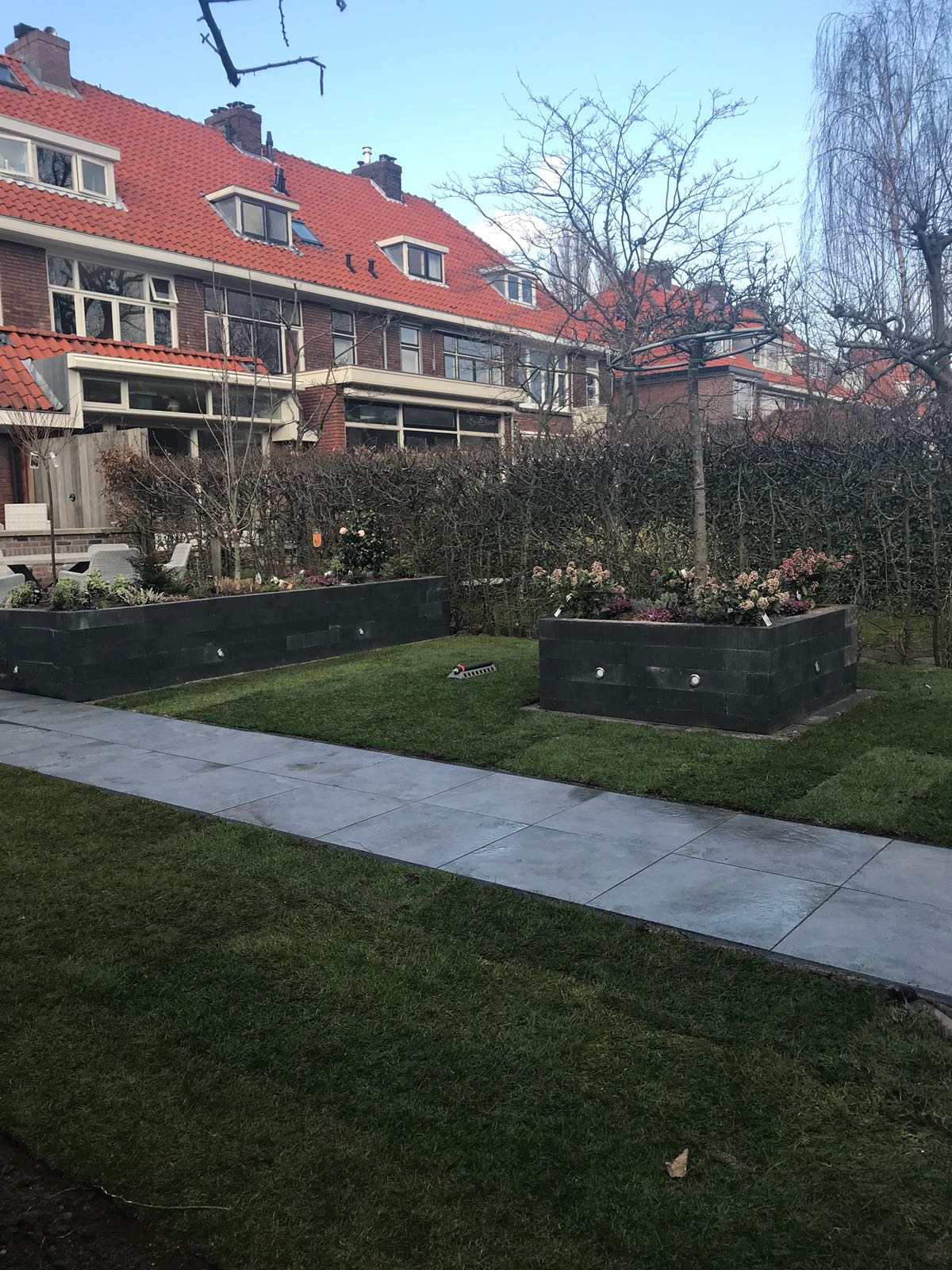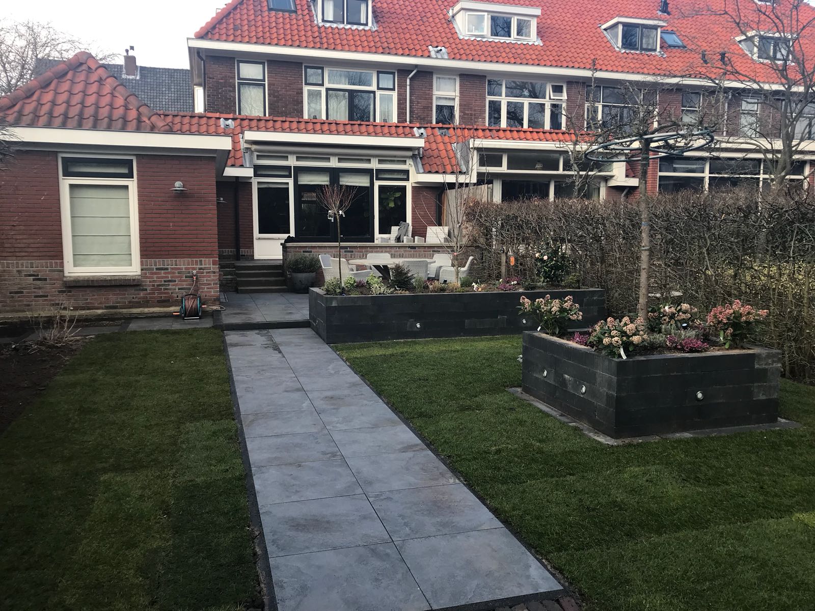 Mooie complete tuin met keramiek, verhoogde bakken van lineablokken. Afstapjes en trapjes van keramiek en lineablokken. Mooie beplanting en verlichting!