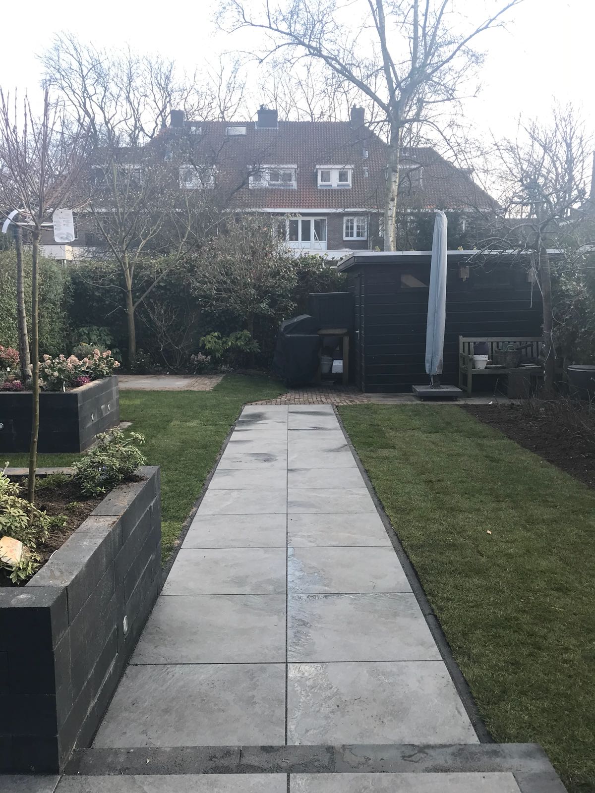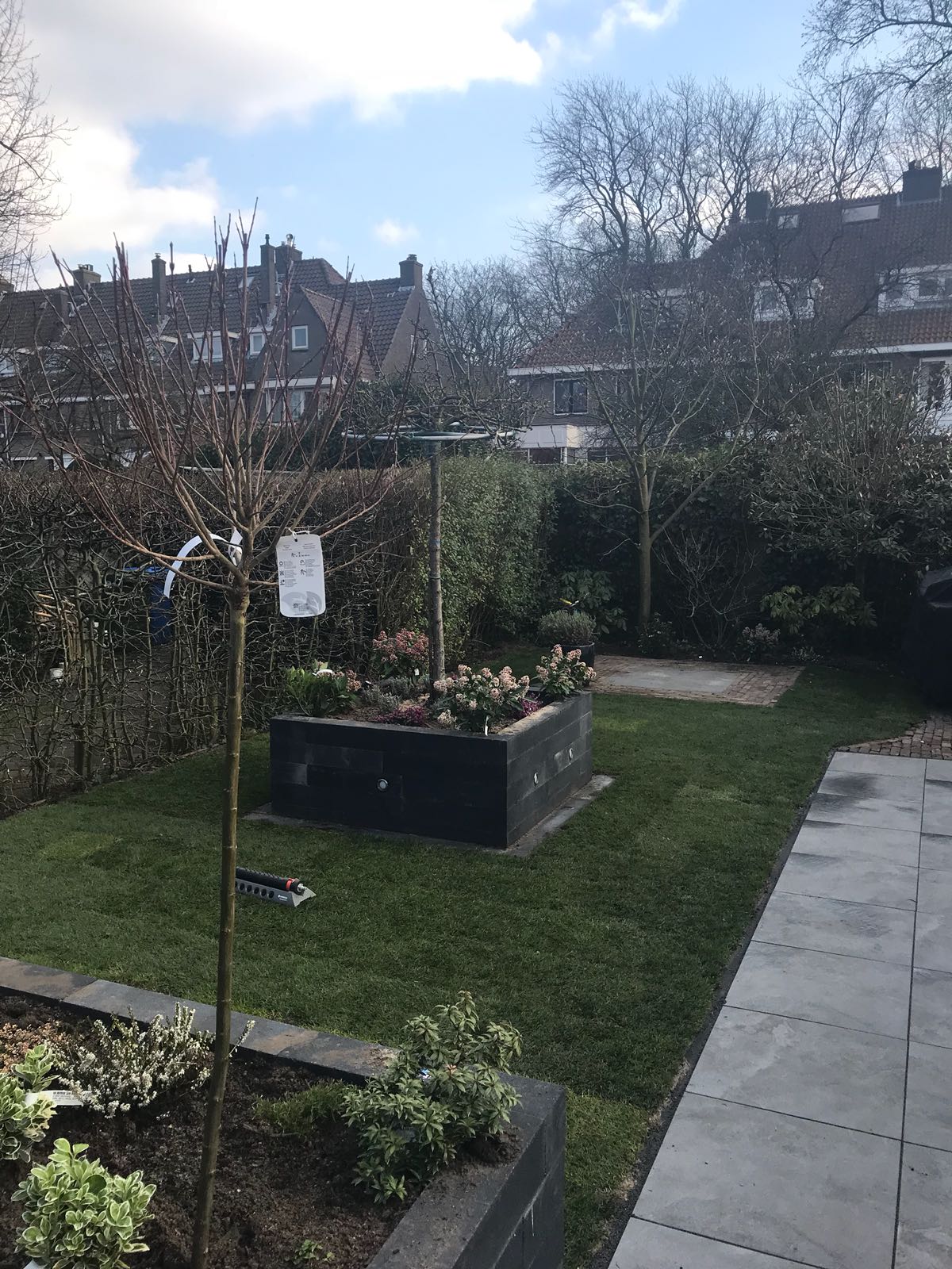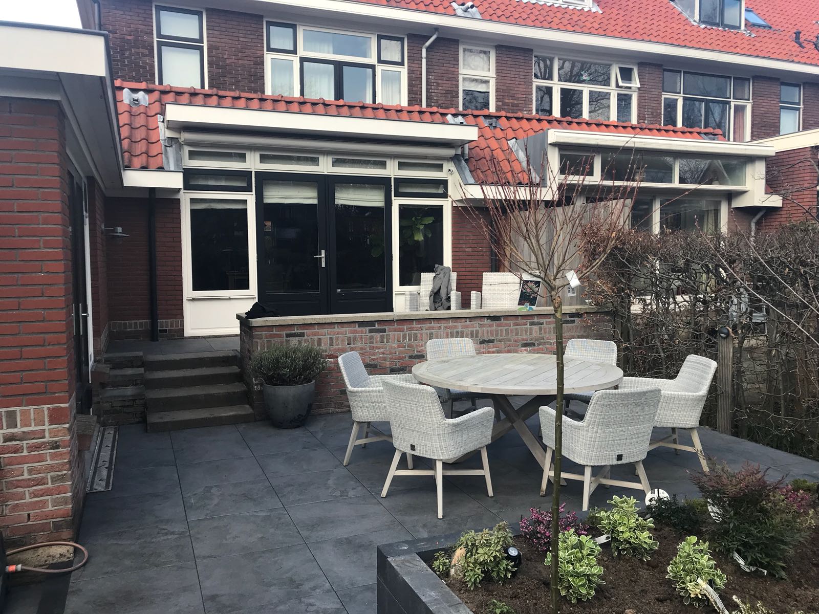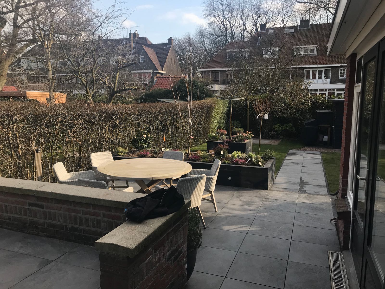 Mooie complete tuin met keramiek, verhoogde bakken van lineablokken. Afstapjes en trapjes van keramiek en lineablokken. Mooie beplanting en verlichting!