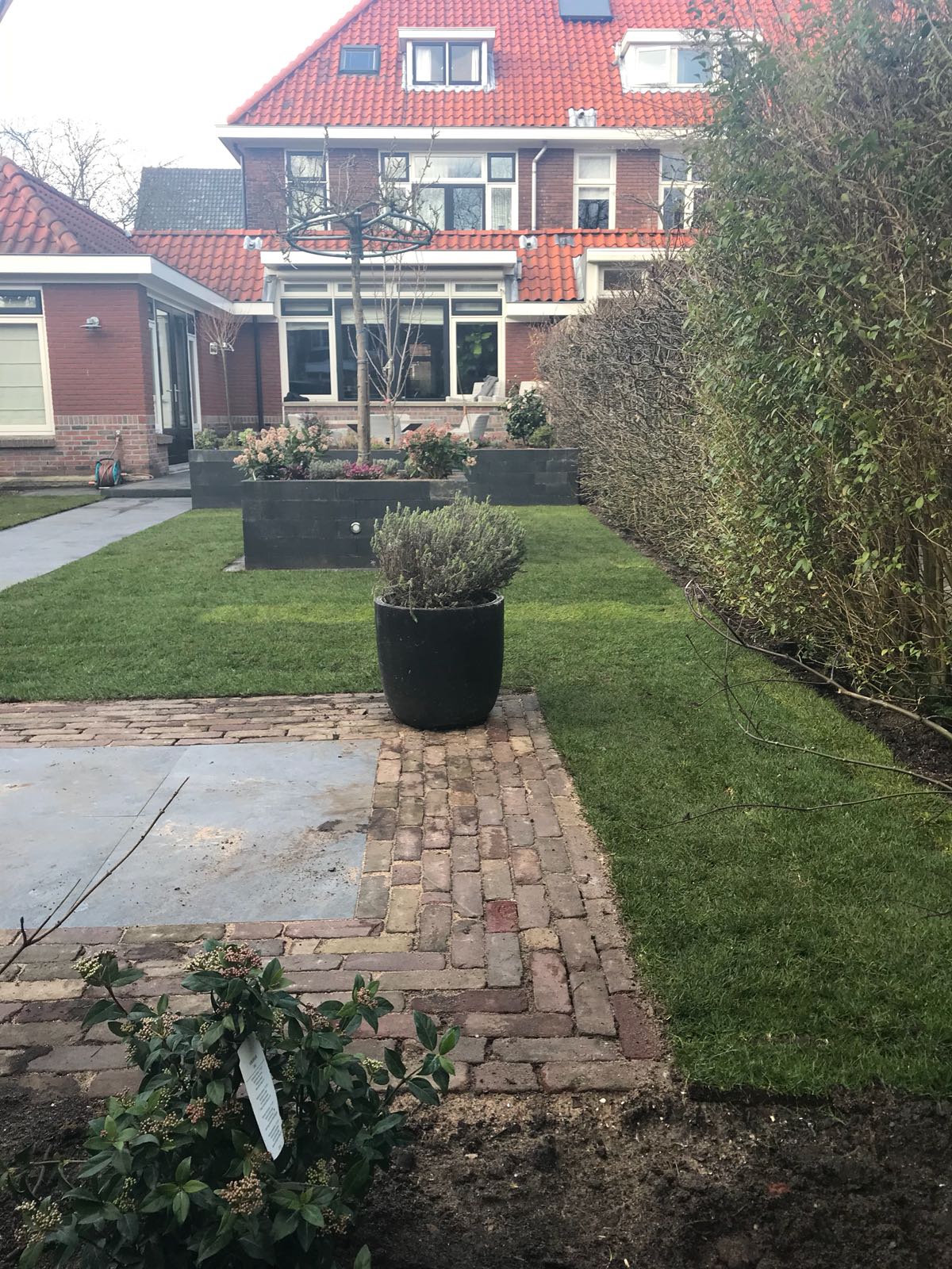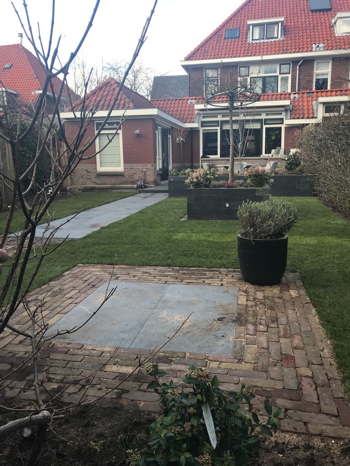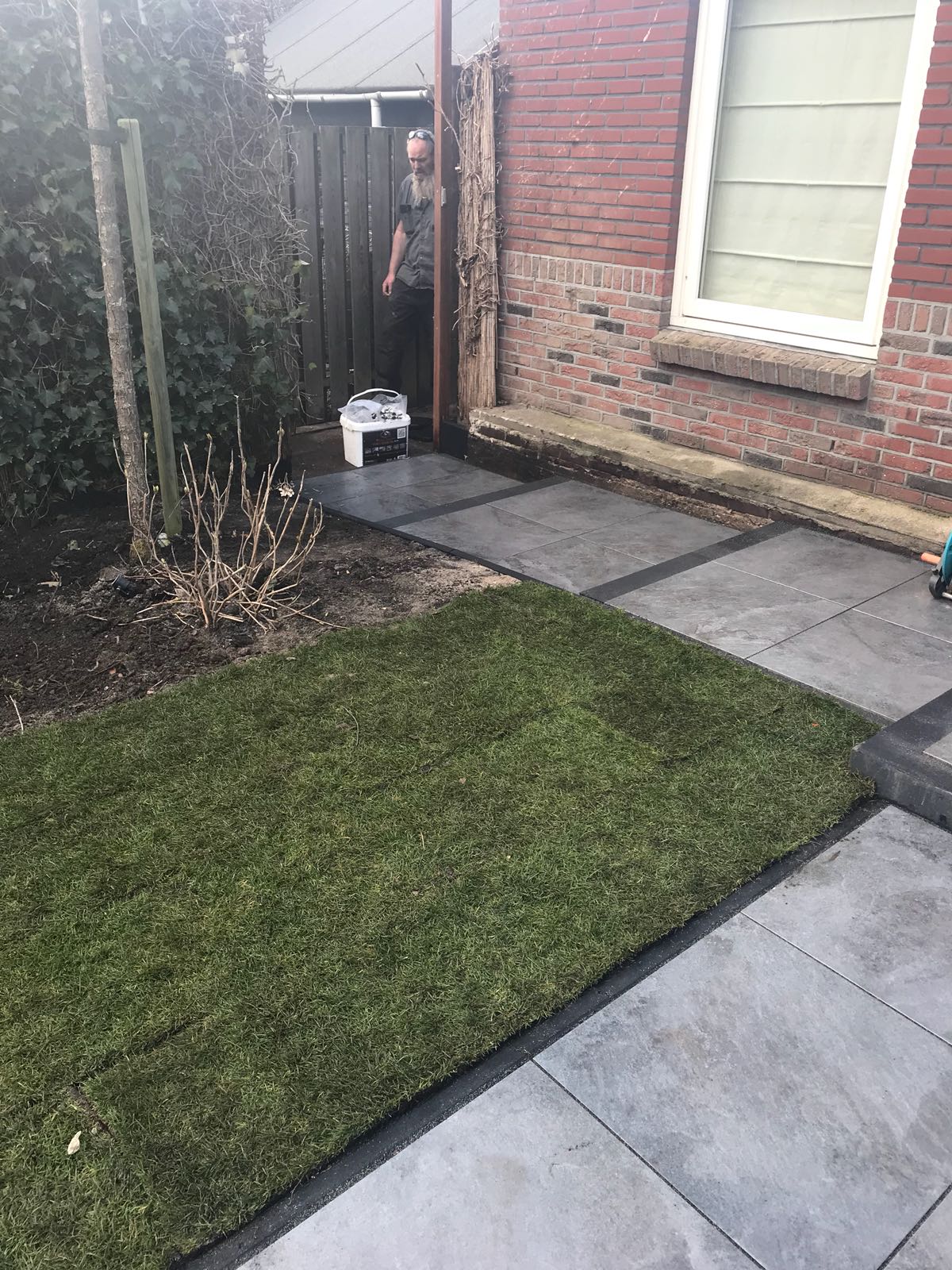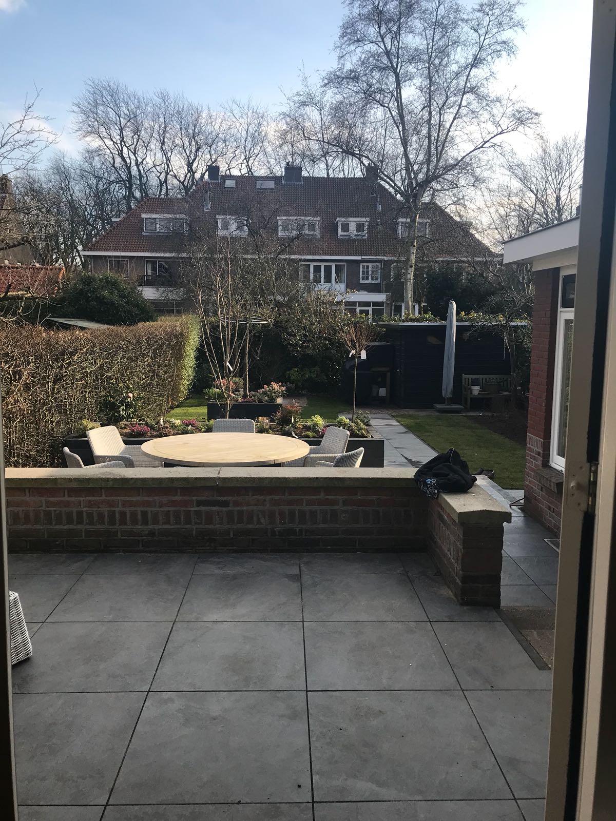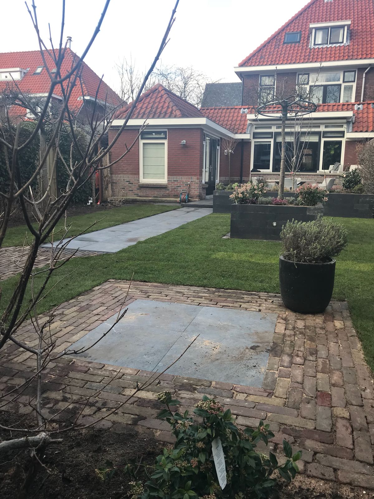 Mooie complete tuin met keramiek, verhoogde bakken van lineablokken. Afstapjes en trapjes van keramiek en lineablokken. Mooie beplanting en verlichting!