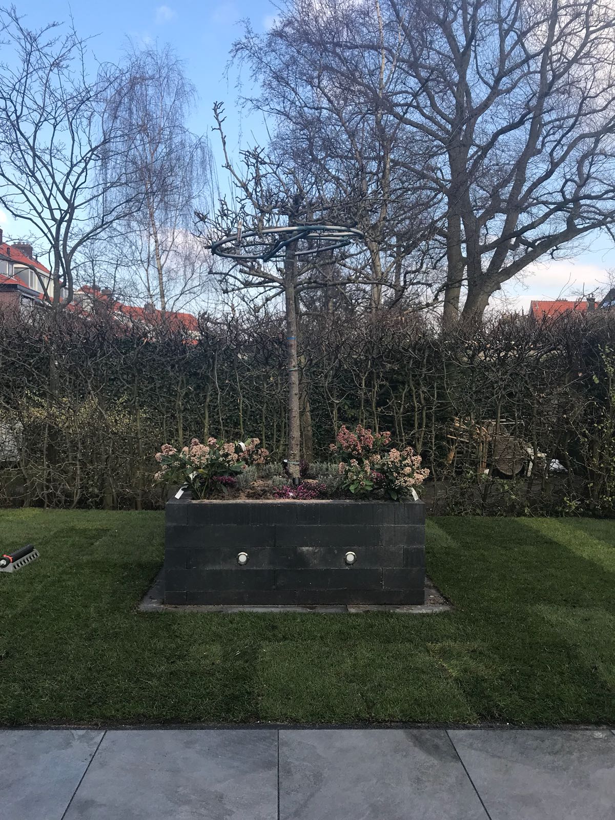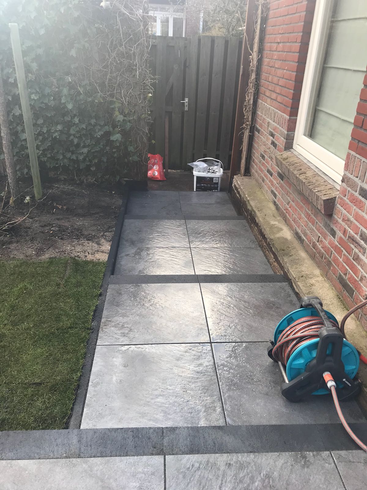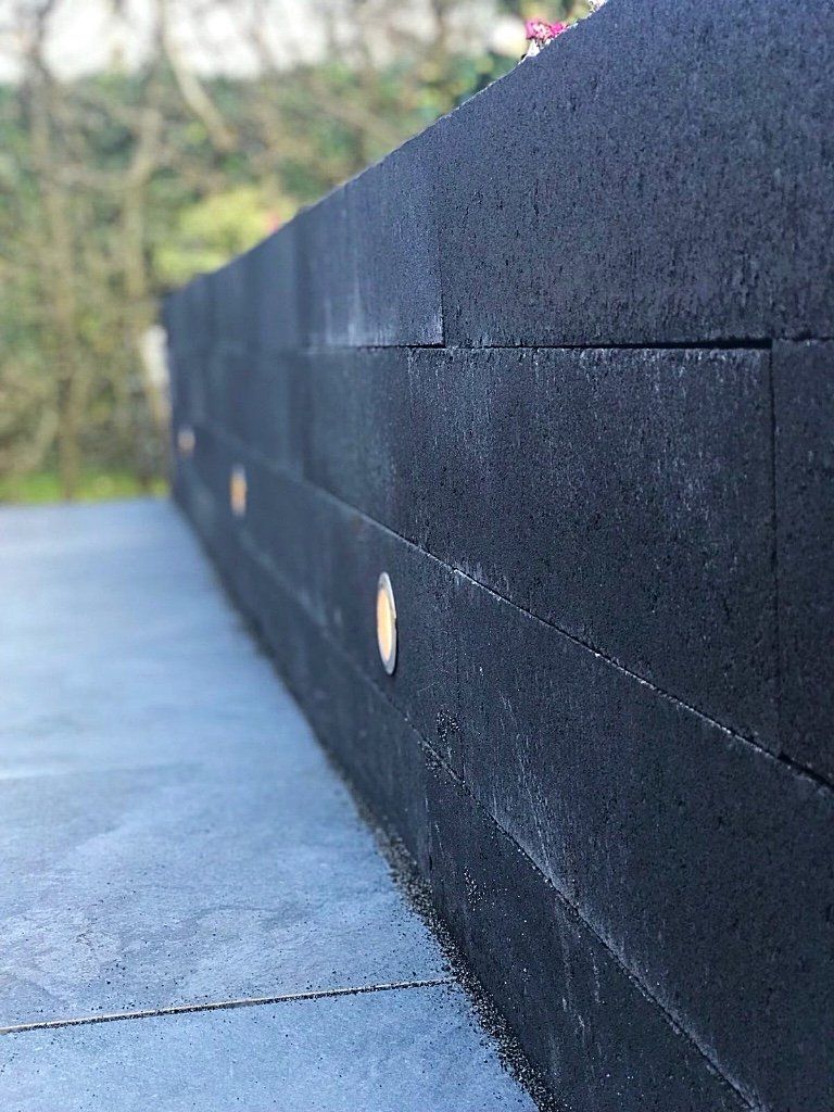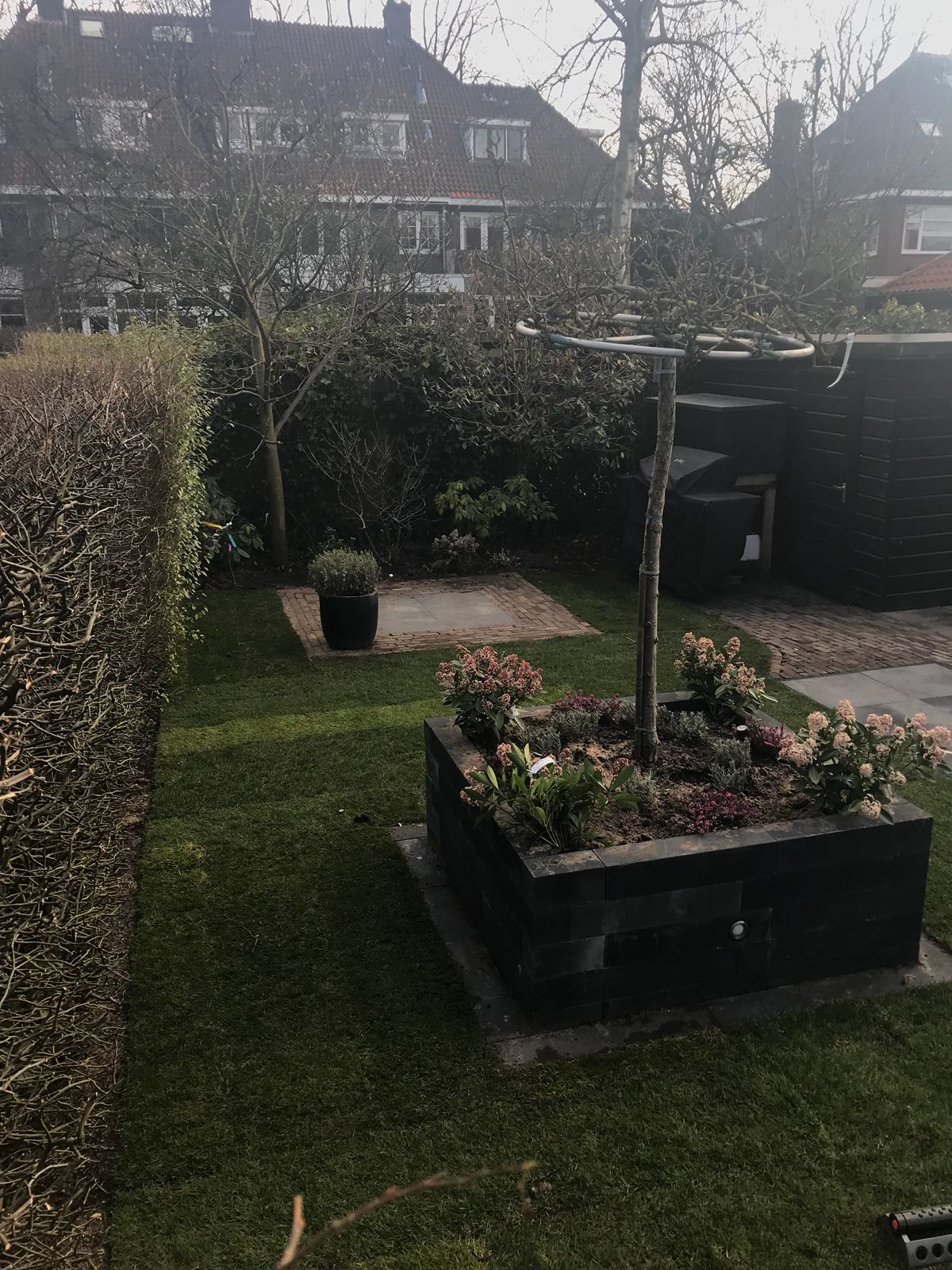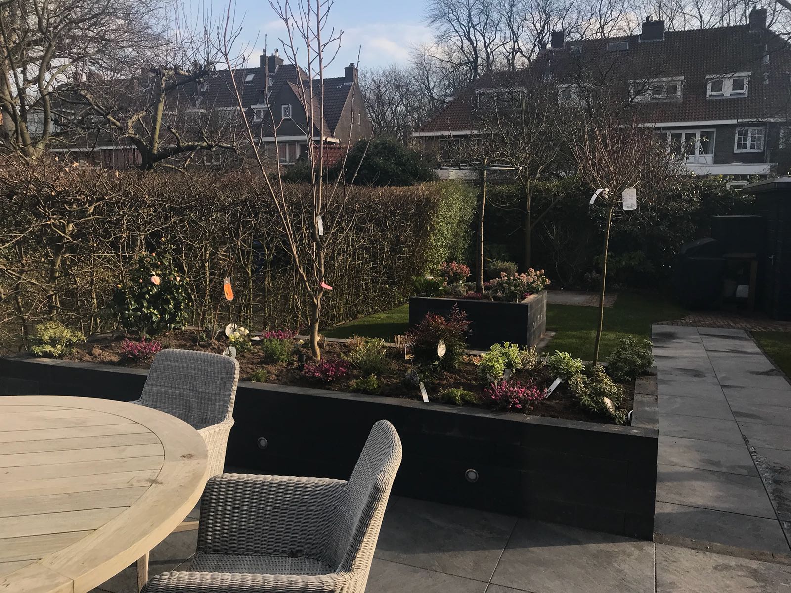 Mooie complete tuin met keramiek, verhoogde bakken van lineablokken. Afstapjes en trapjes van keramiek en lineablokken. Mooie beplanting en verlichting!