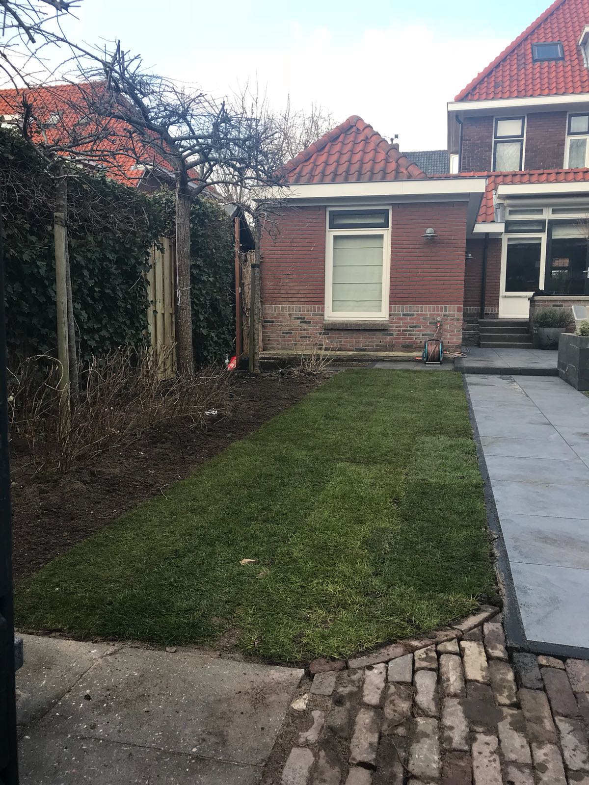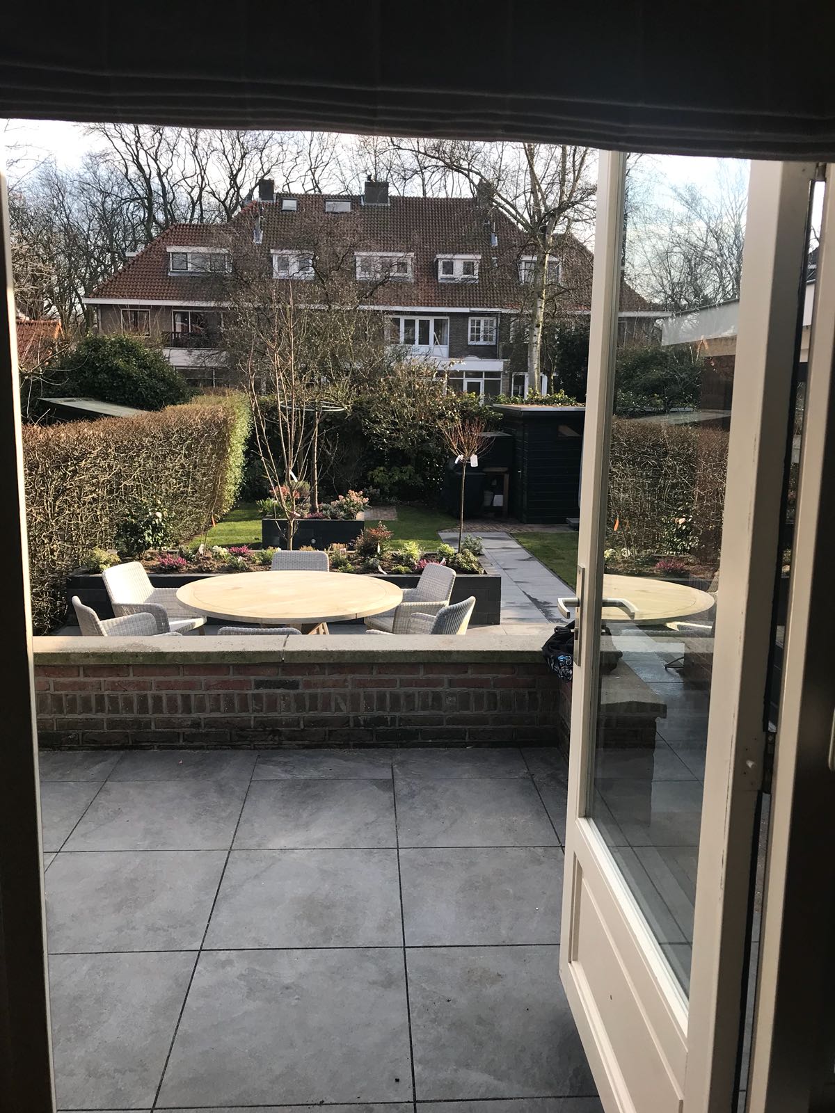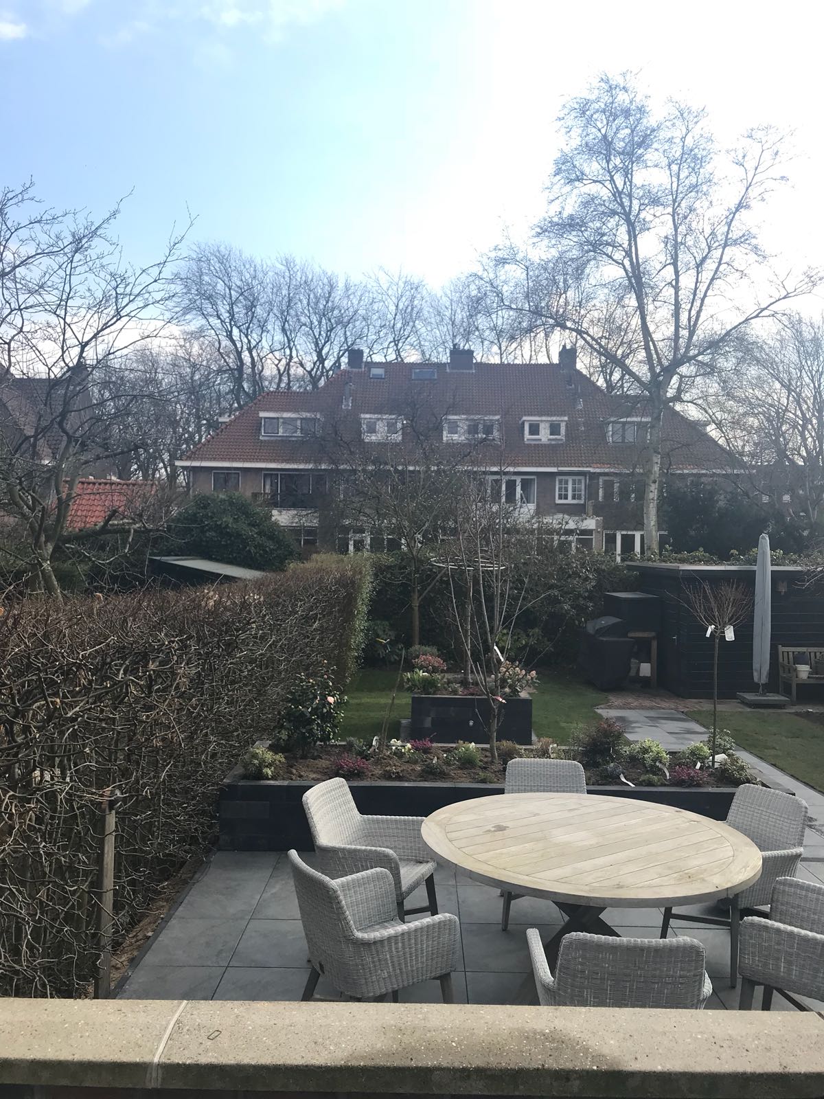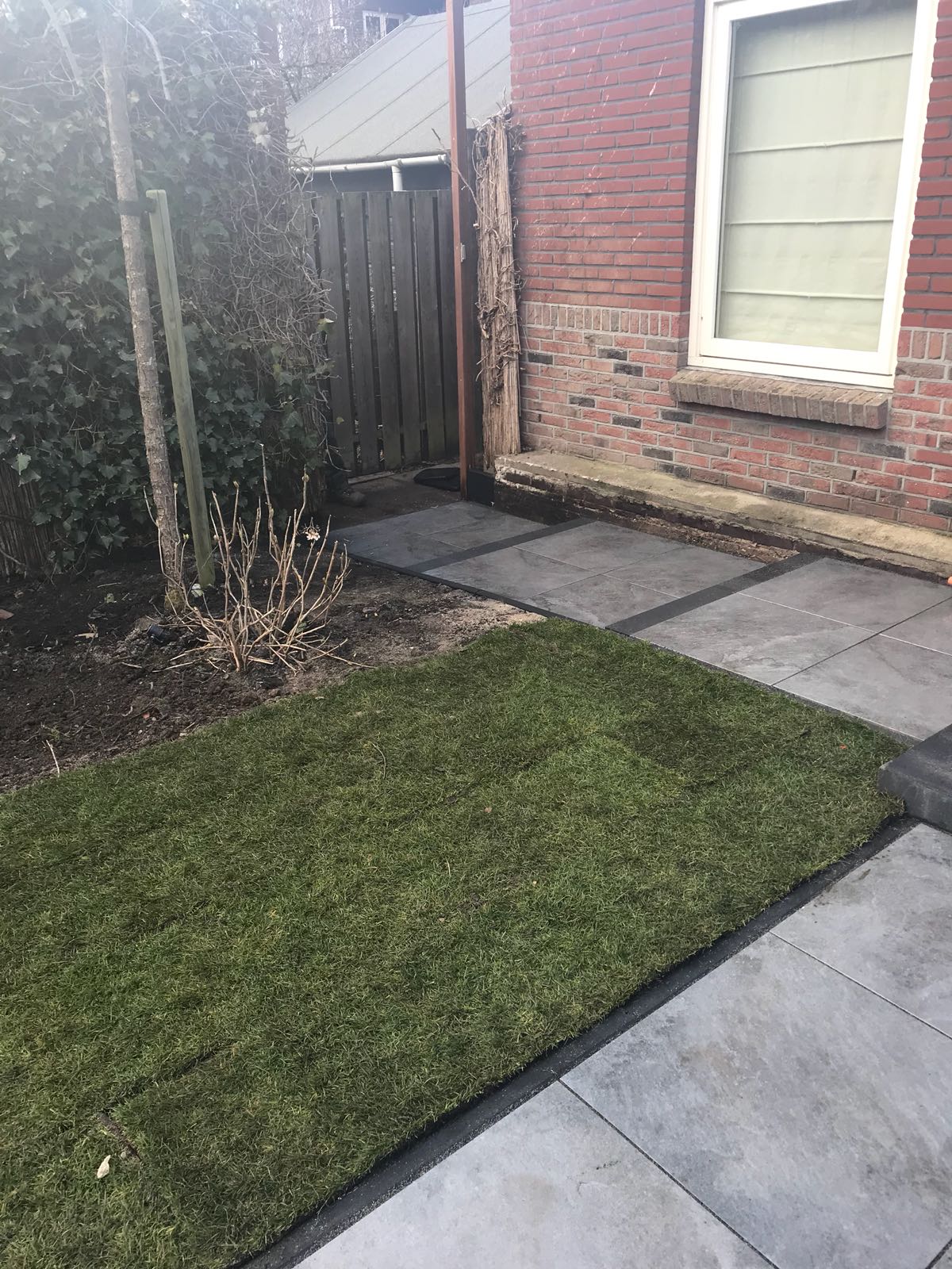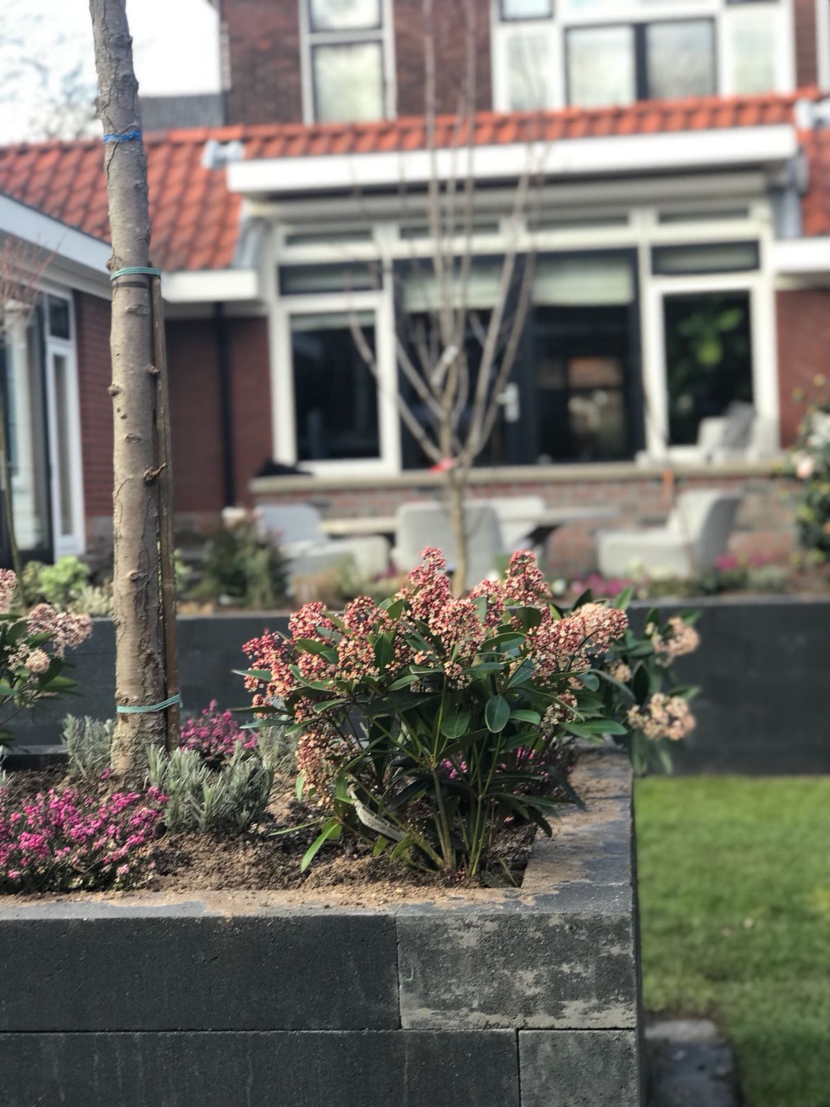 Mooie complete tuin met keramiek, verhoogde bakken van lineablokken. Afstapjes en trapjes van keramiek en lineablokken. Mooie beplanting en verlichting!
