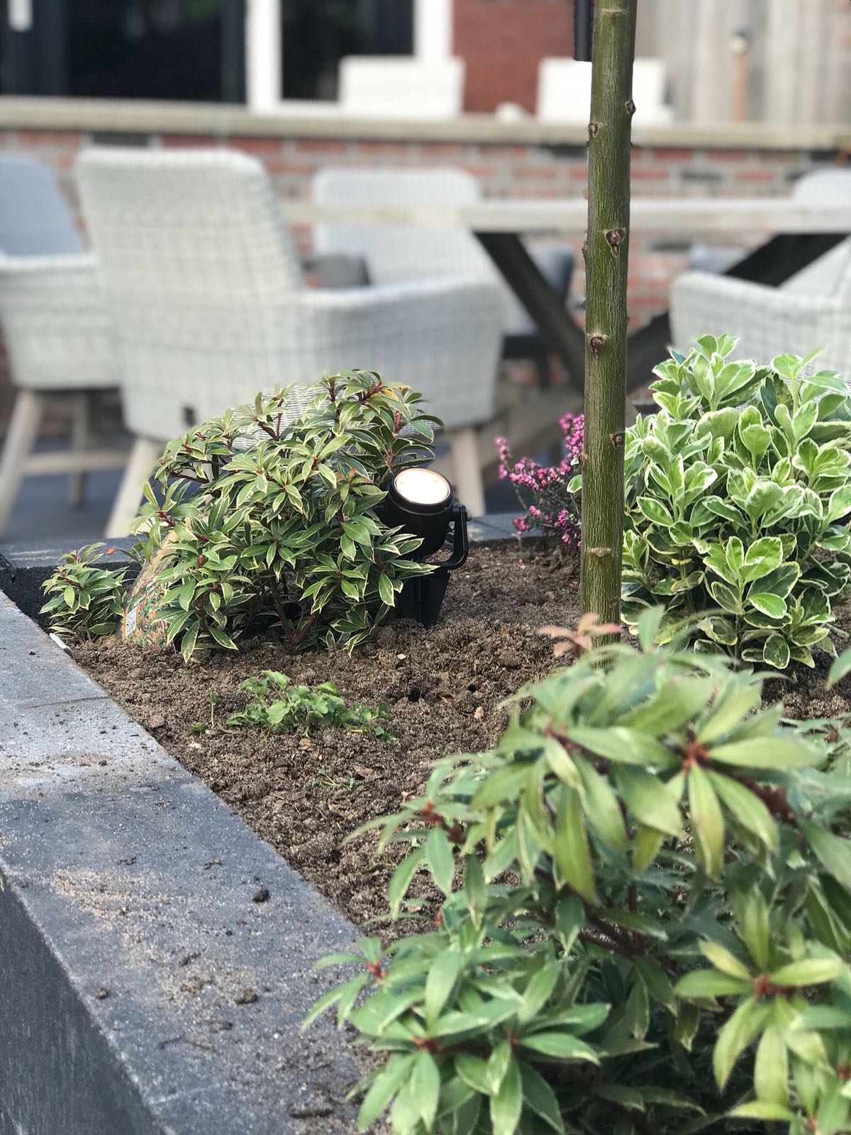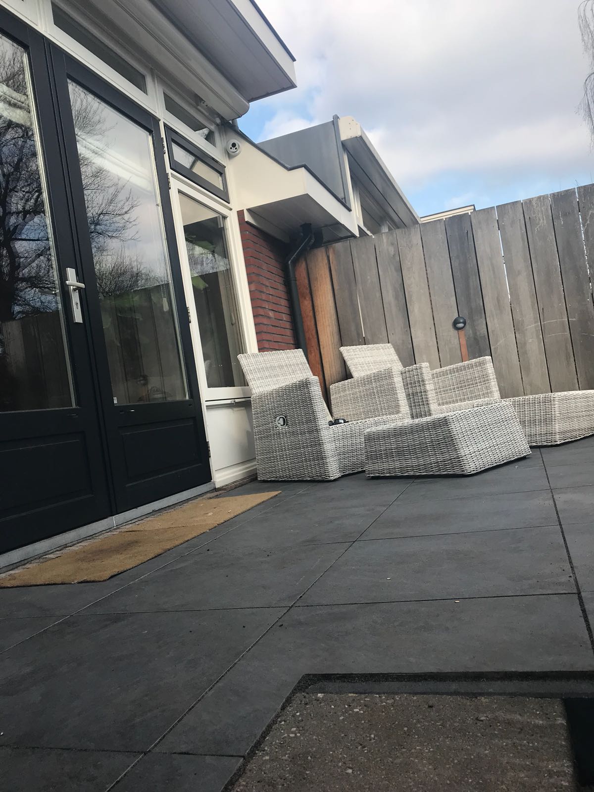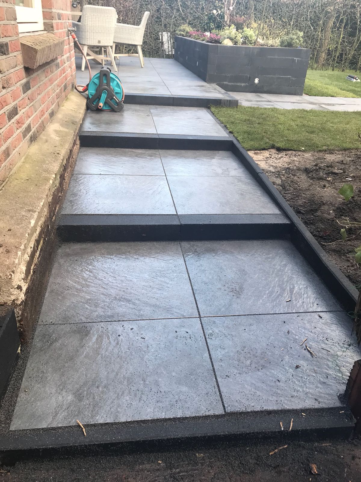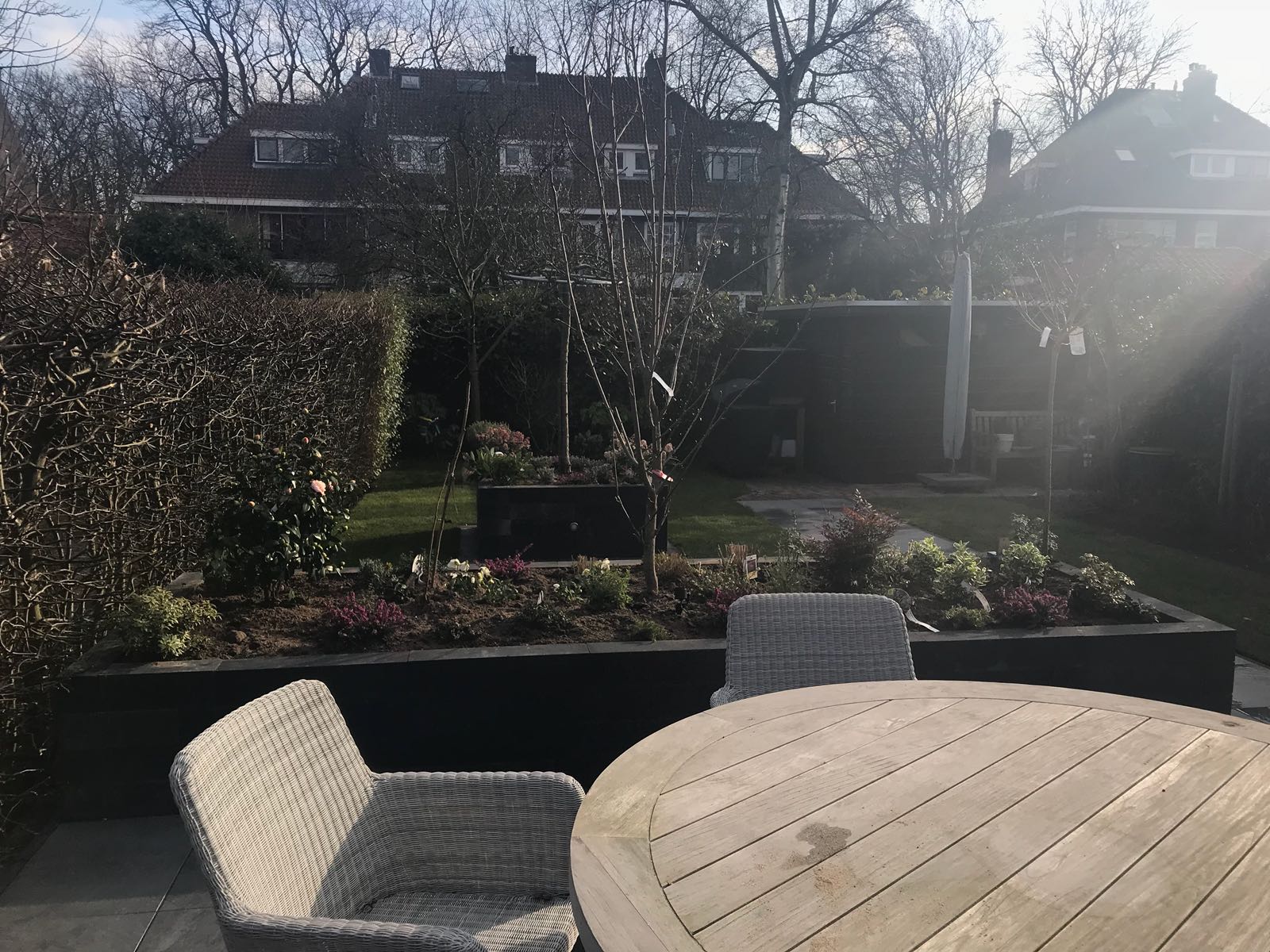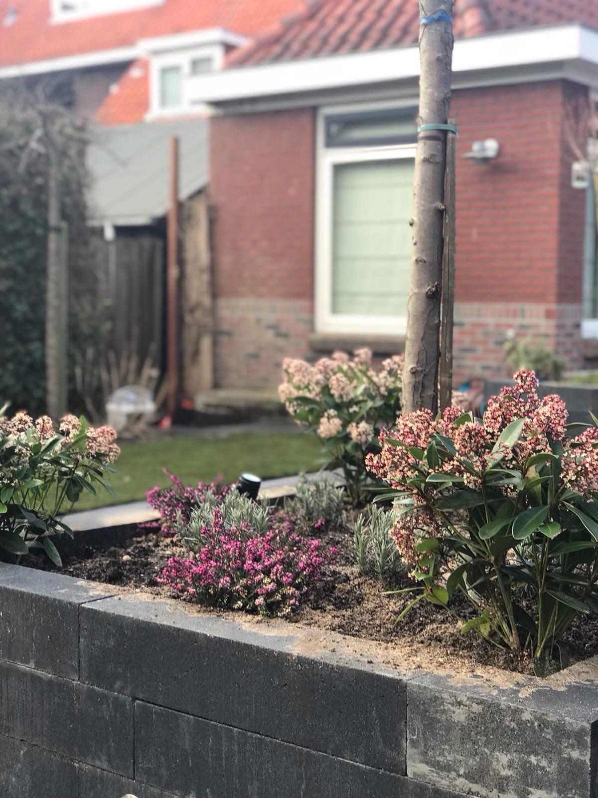 Mooie complete tuin met keramiek, verhoogde bakken van lineablokken. Afstapjes en trapjes van keramiek en lineablokken. Mooie beplanting en verlichting!