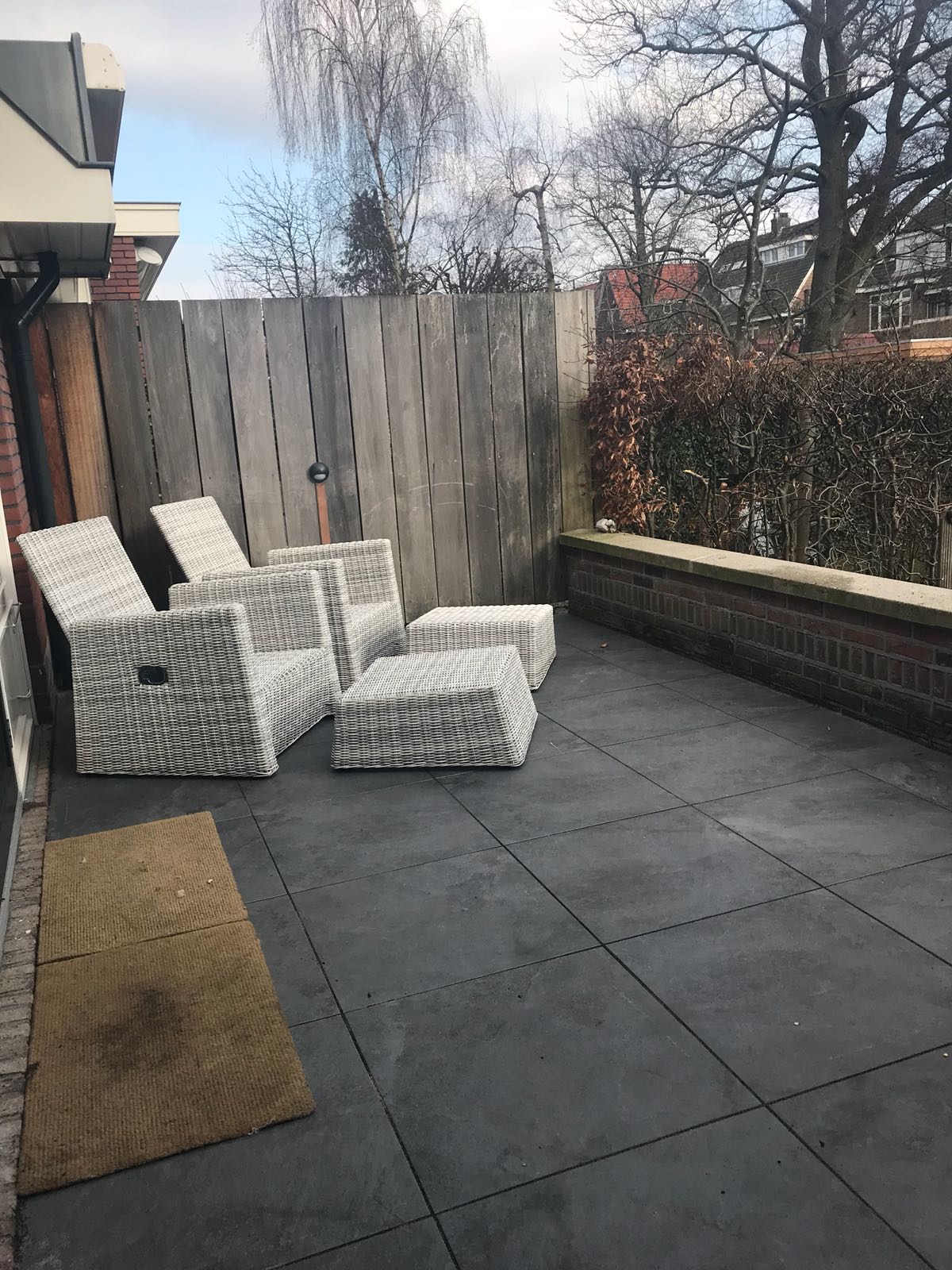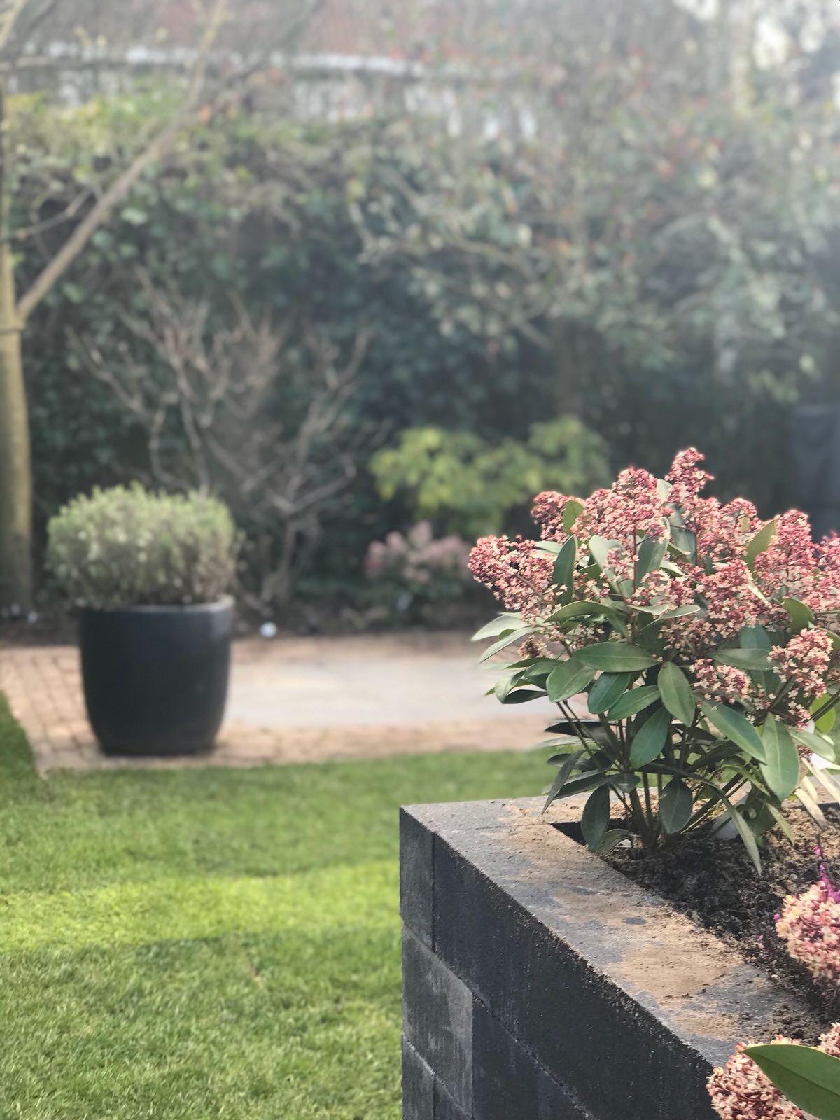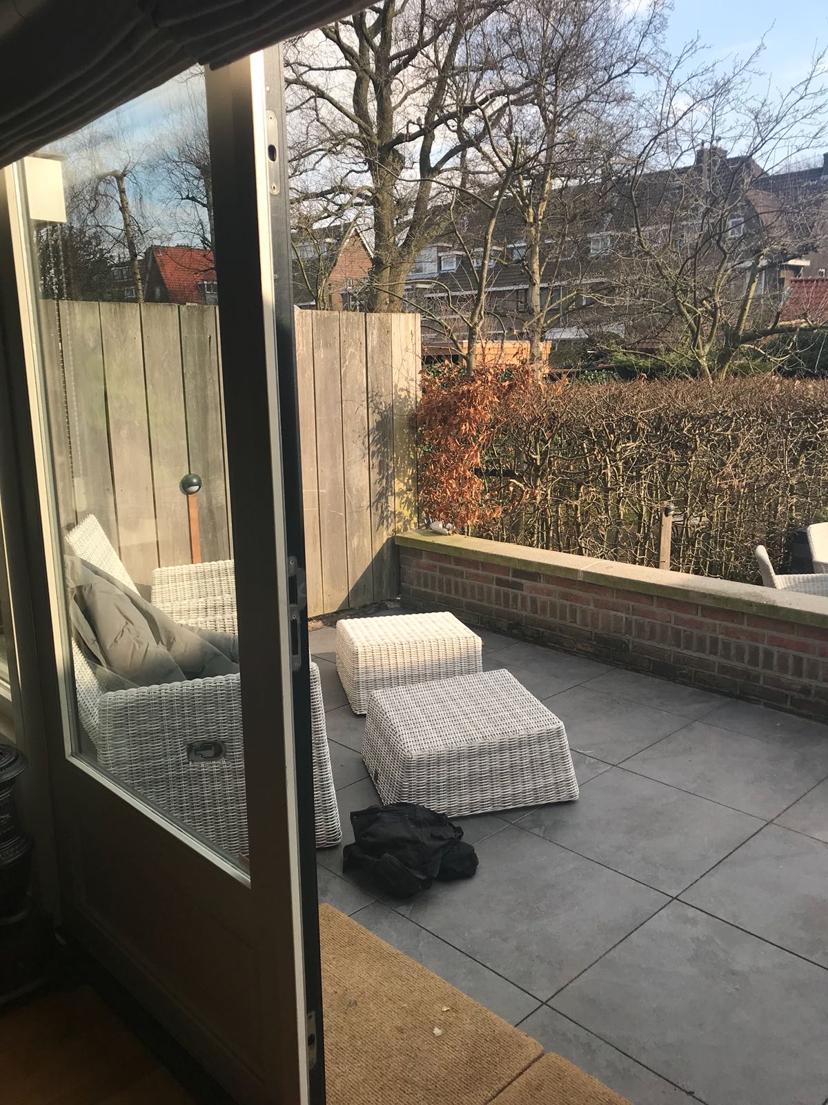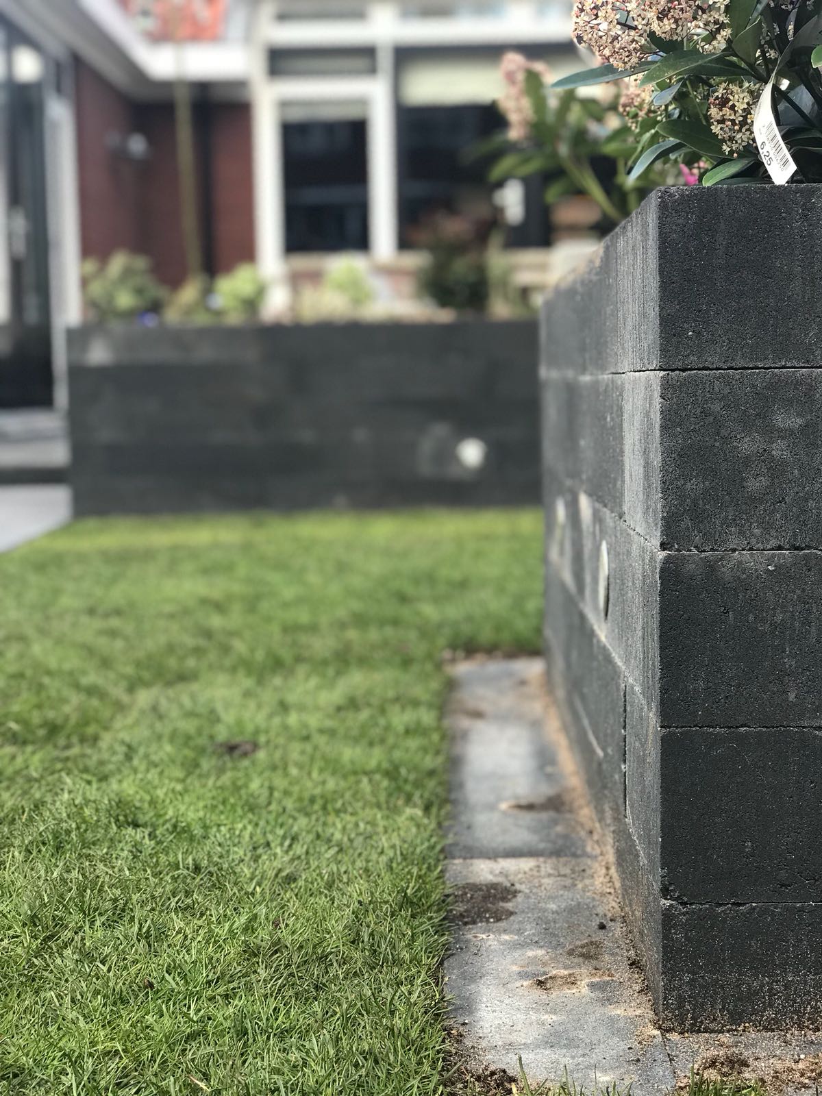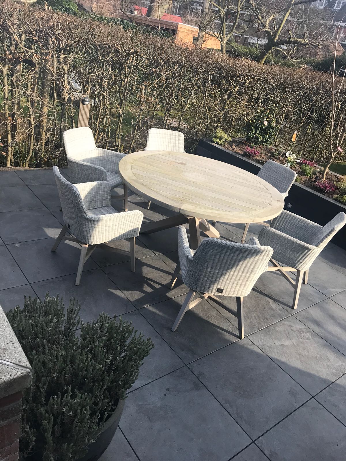 Mooie complete tuin met keramiek, verhoogde bakken van lineablokken. Afstapjes en trapjes van keramiek en lineablokken. Mooie beplanting en verlichting!
