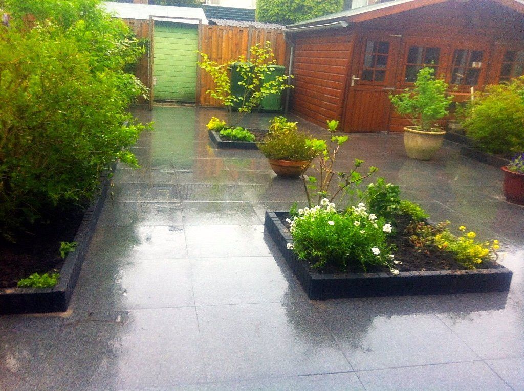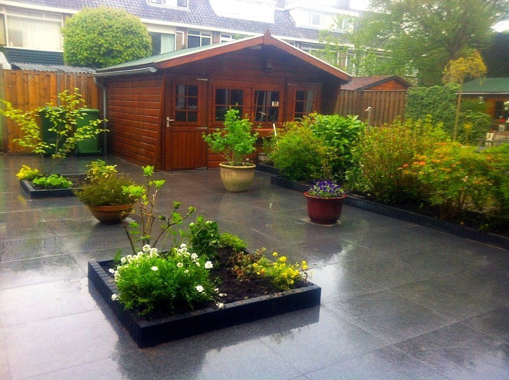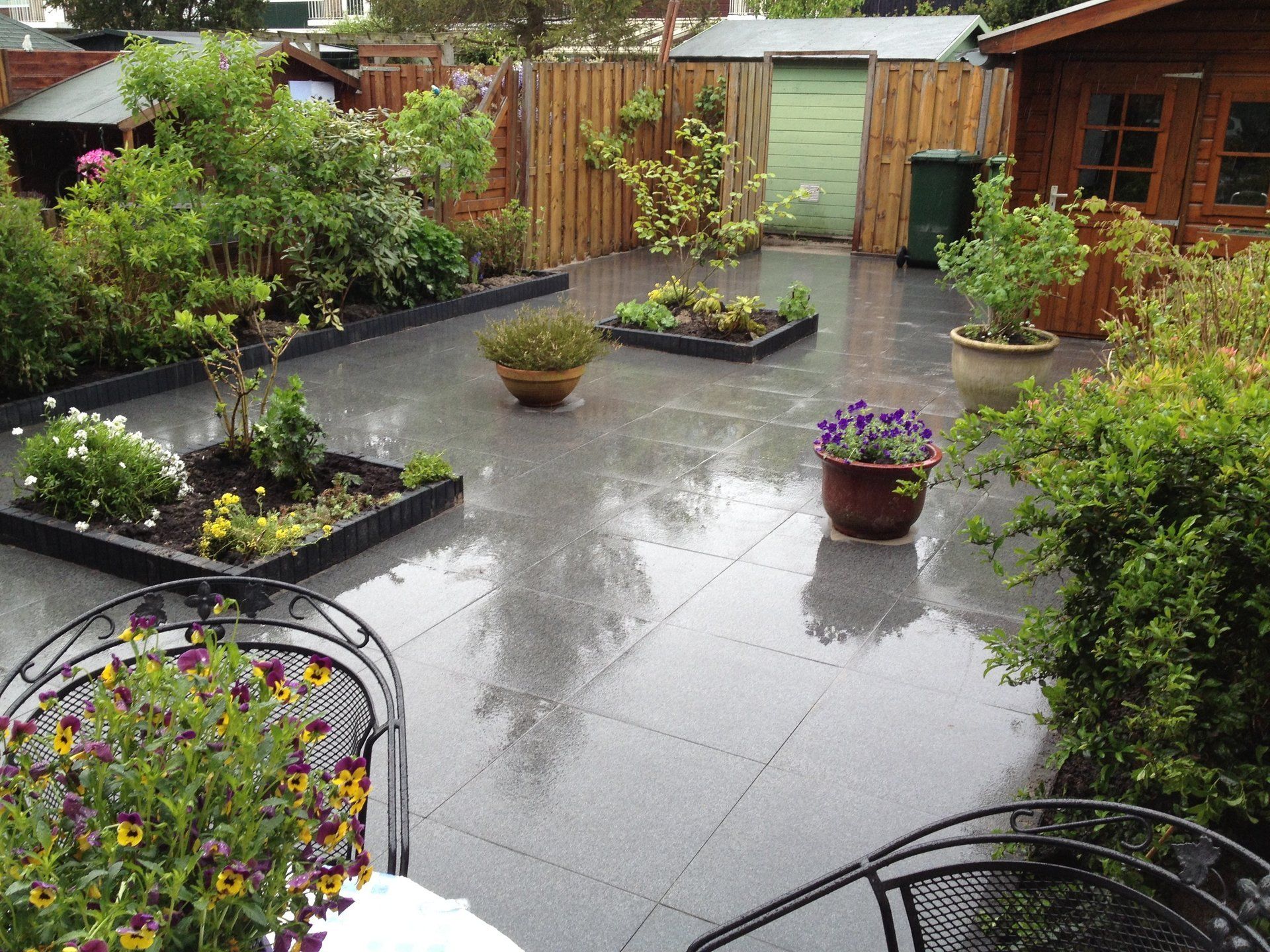 Heerlijke makkelijke onderhouden tuin met keramiek bestrating (gevoegd gelegd) met veel lage borders en beplanting.