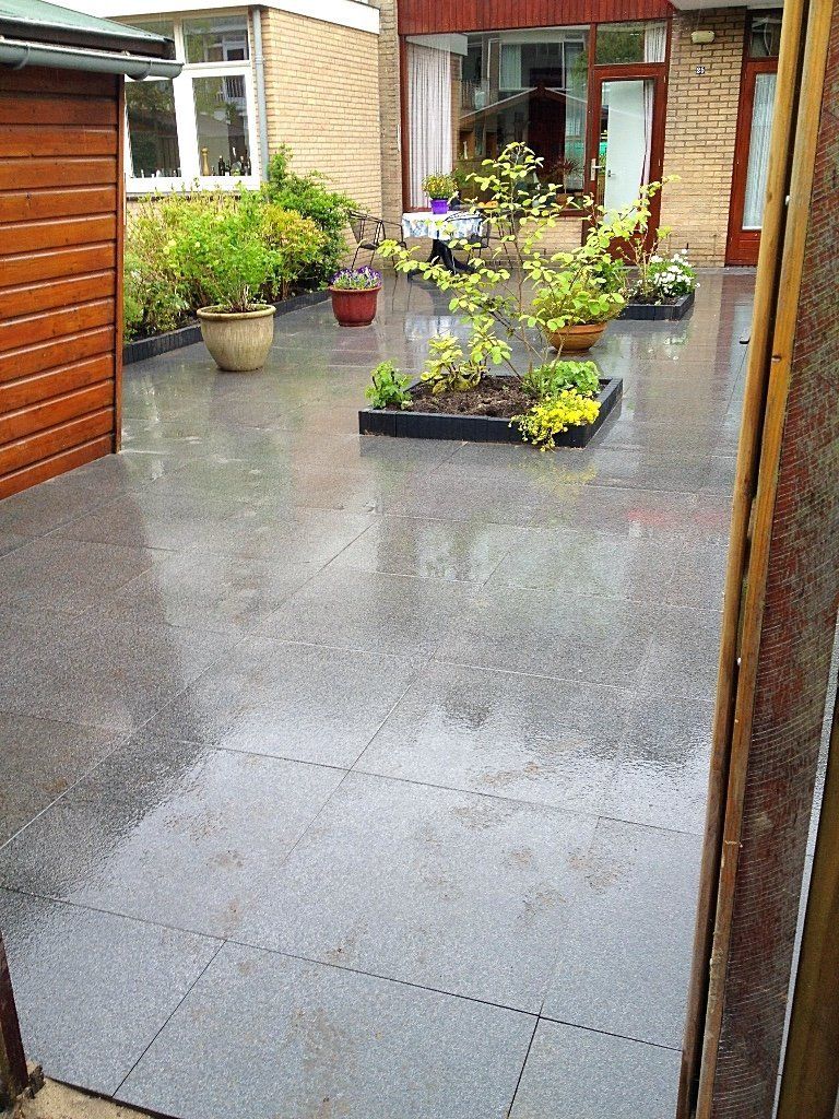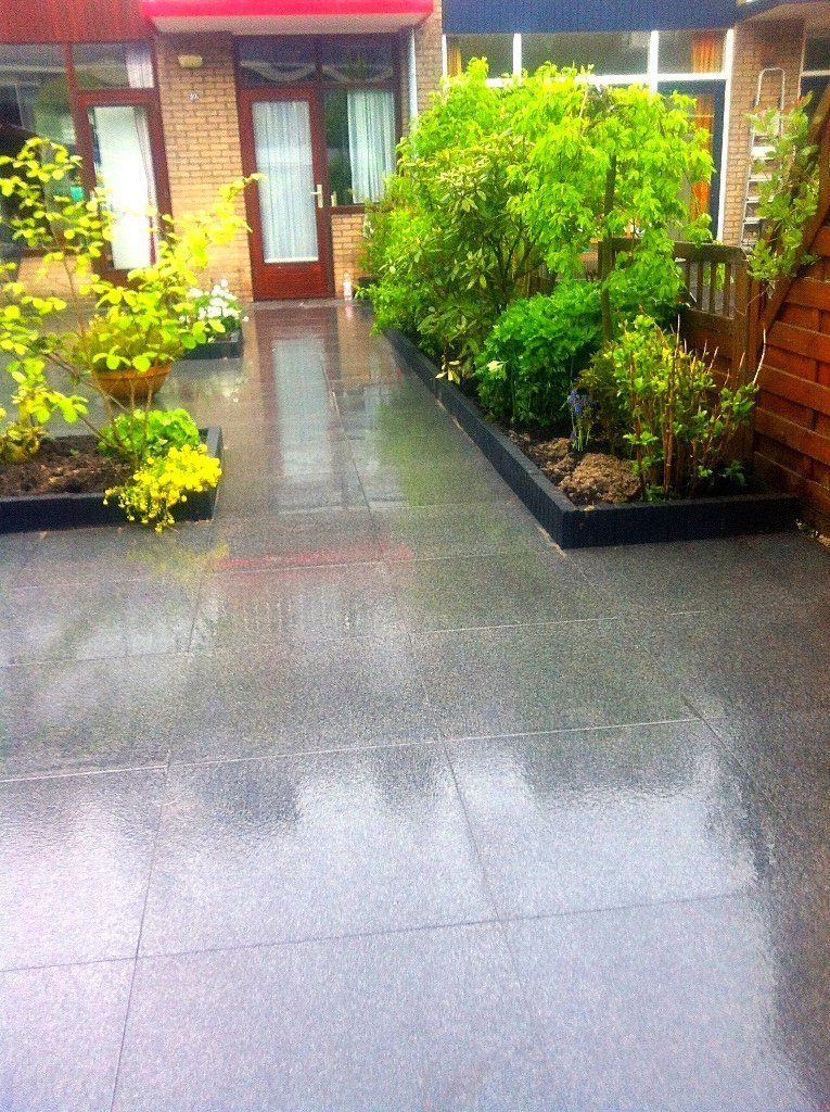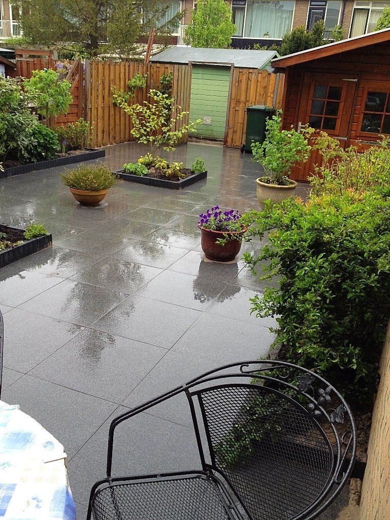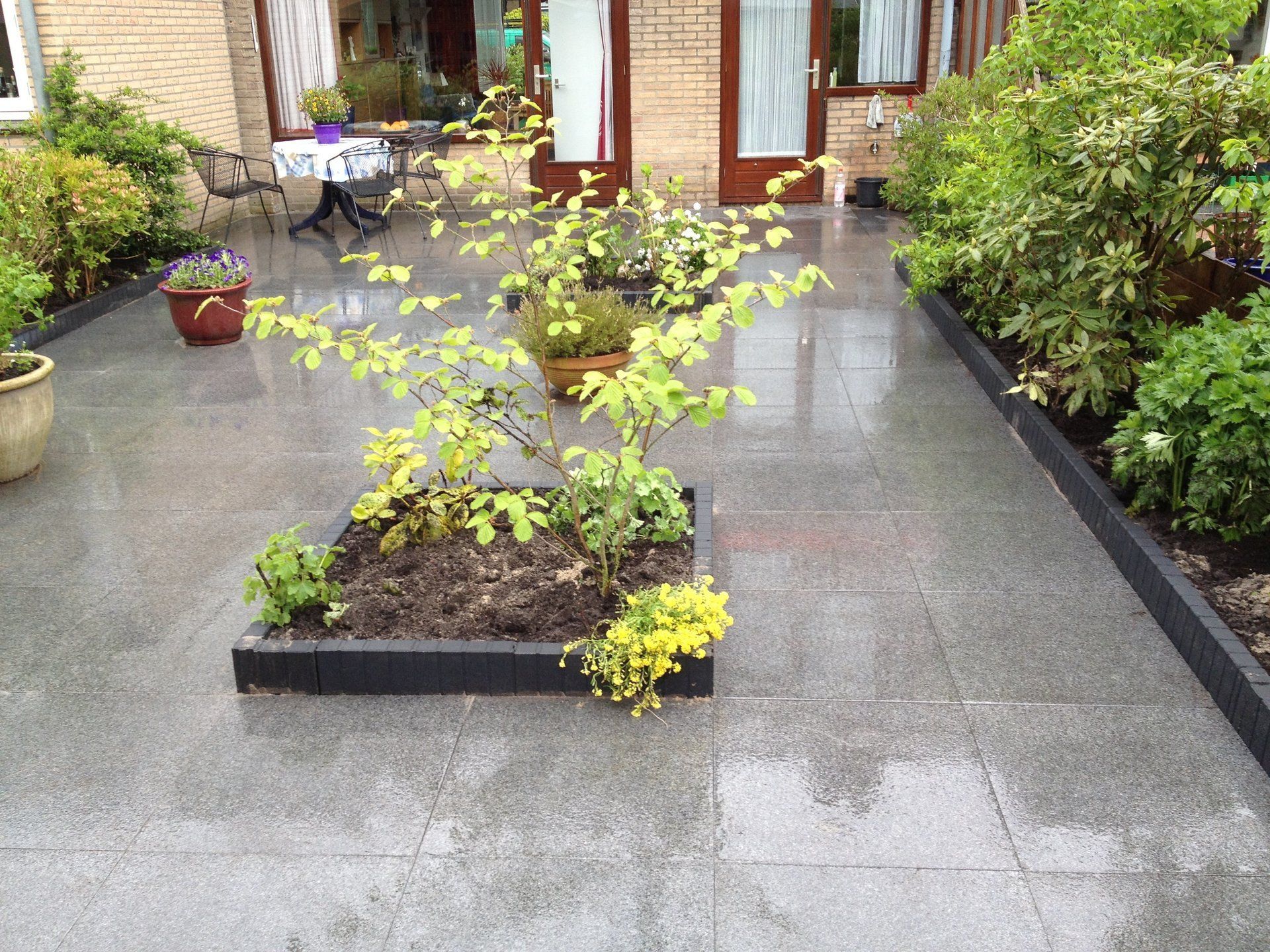 Heerlijke makkelijke onderhouden tuin met keramiek bestrating (gevoegd gelegd) met veel lage borders en beplanting.