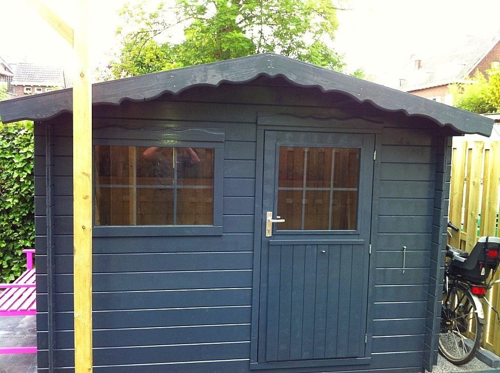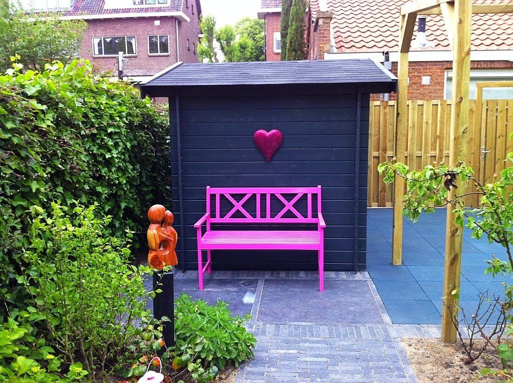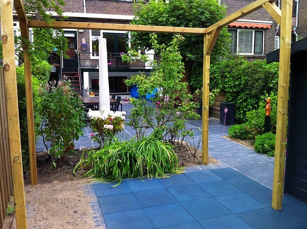 Schuttingdelen, poort en een pergola van geïmpregneerd hout. Onder de pergola liggen rubberen tegels.