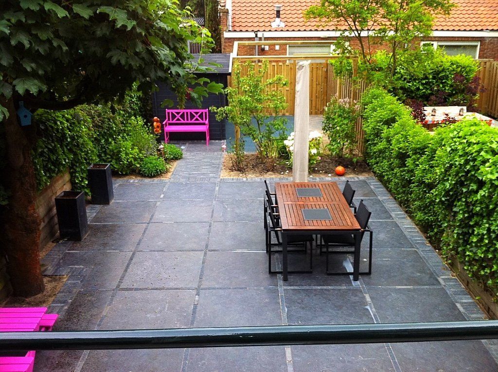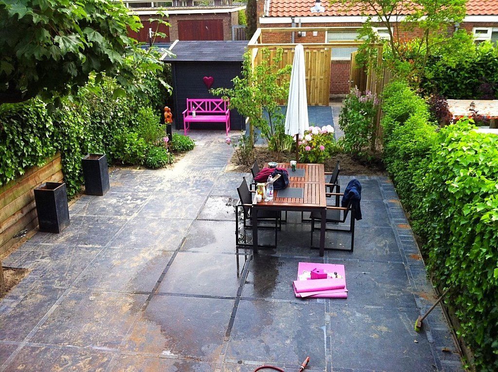 Prachtige sfeervolle tuin met 60x60 natuursteen tegels opgevuld met grijze waaltjes.