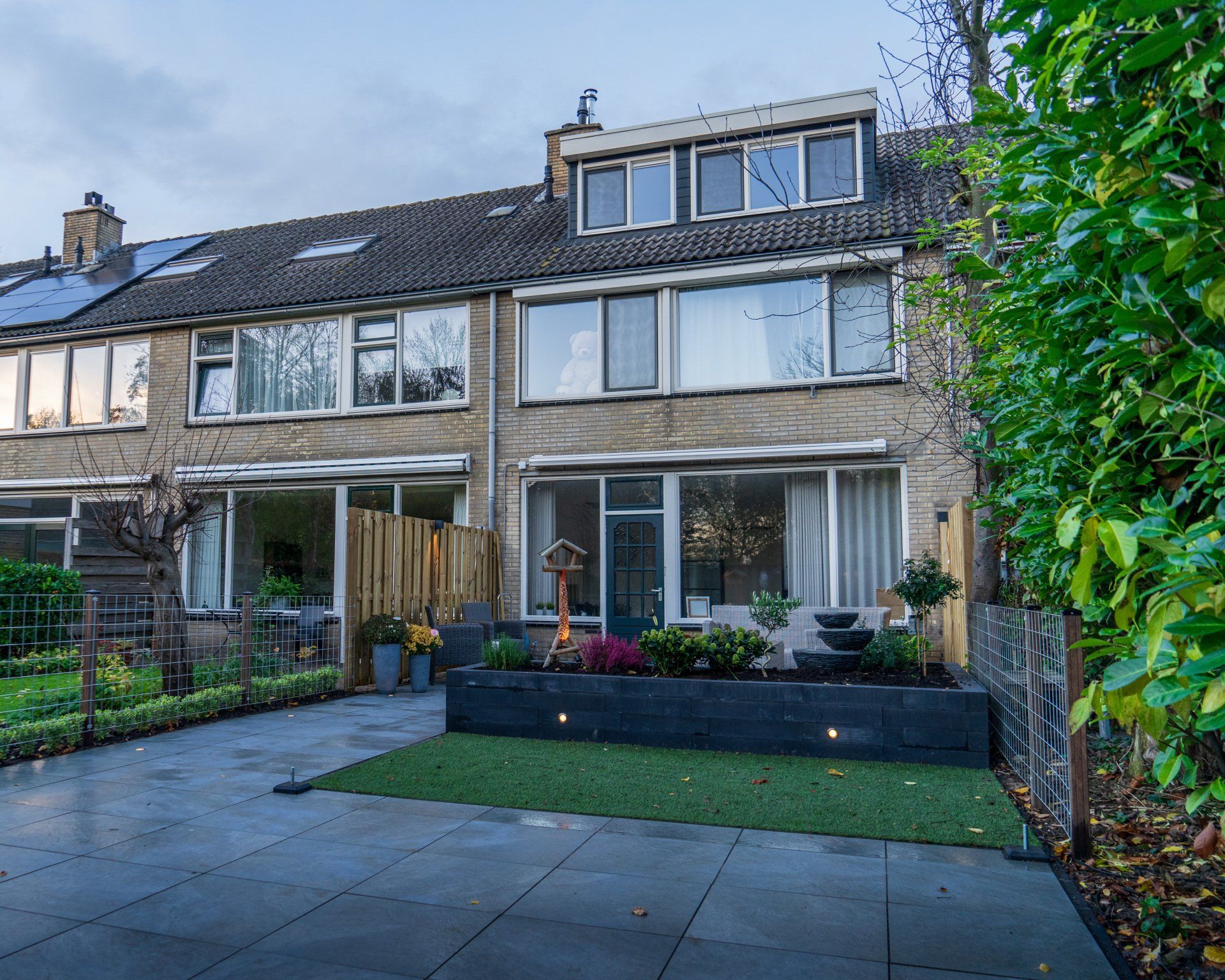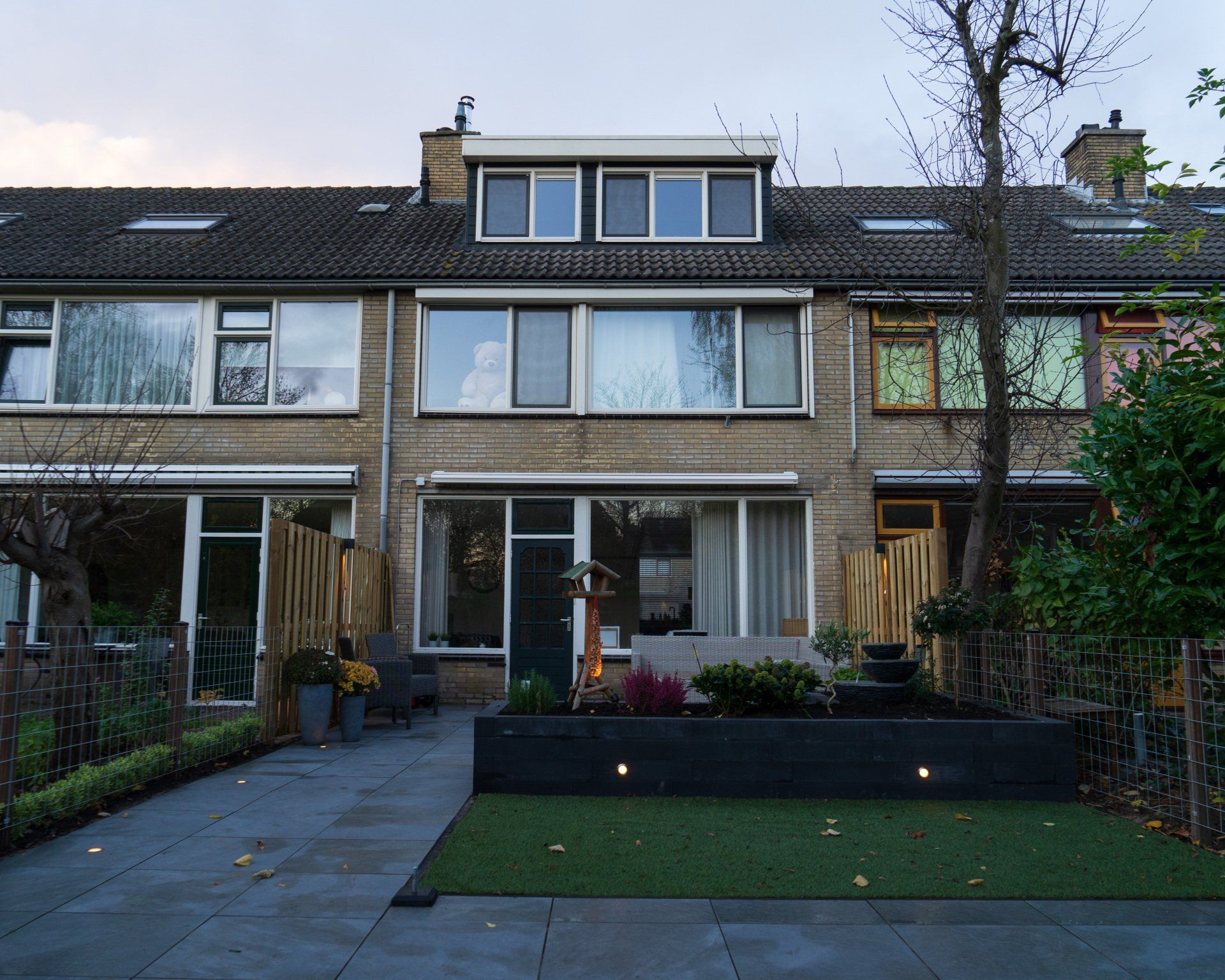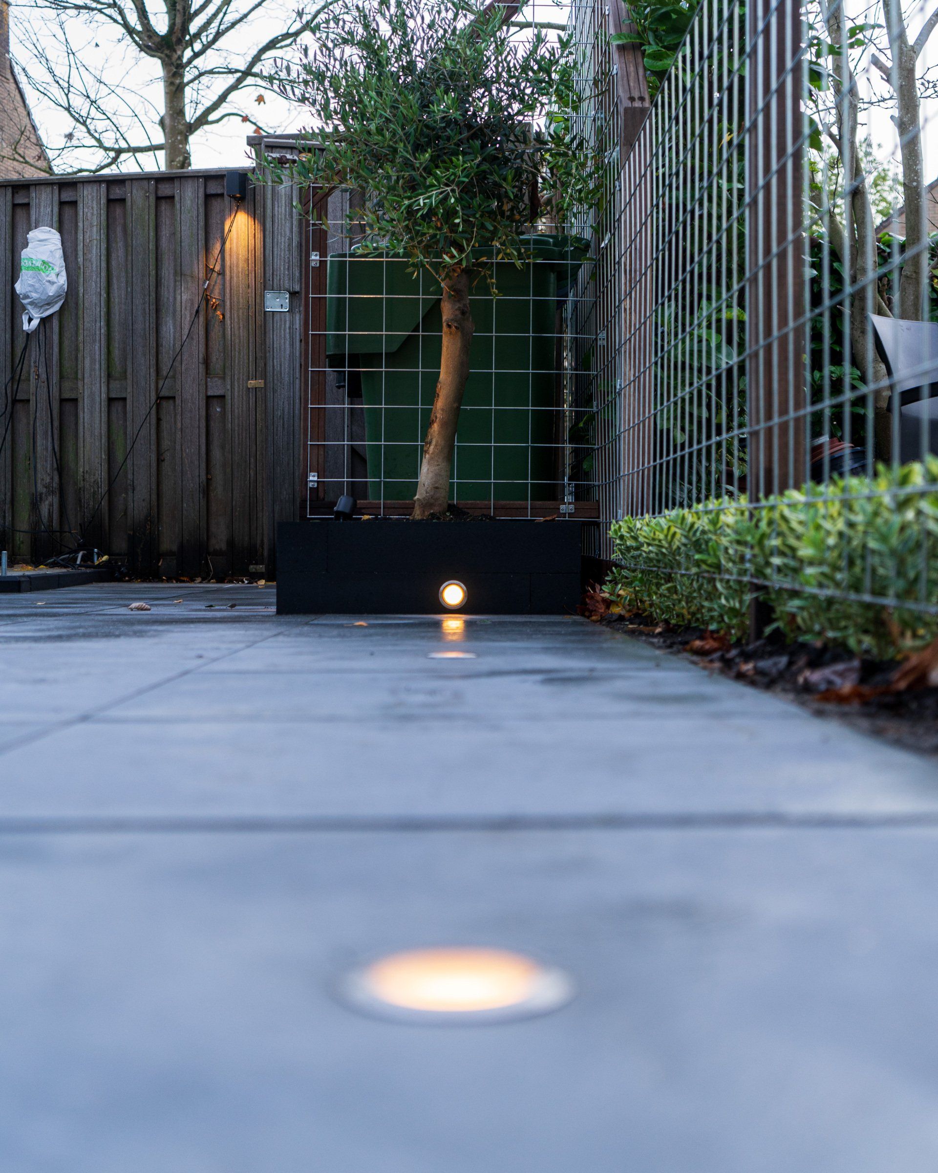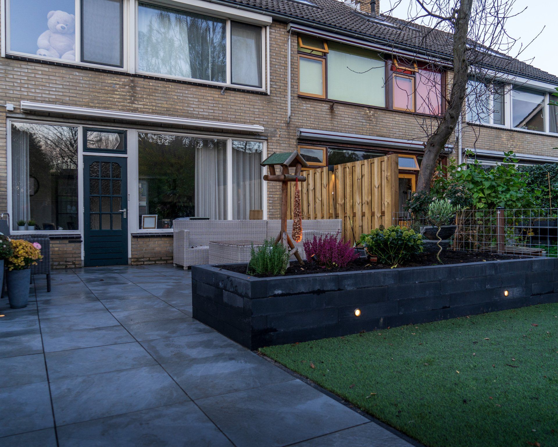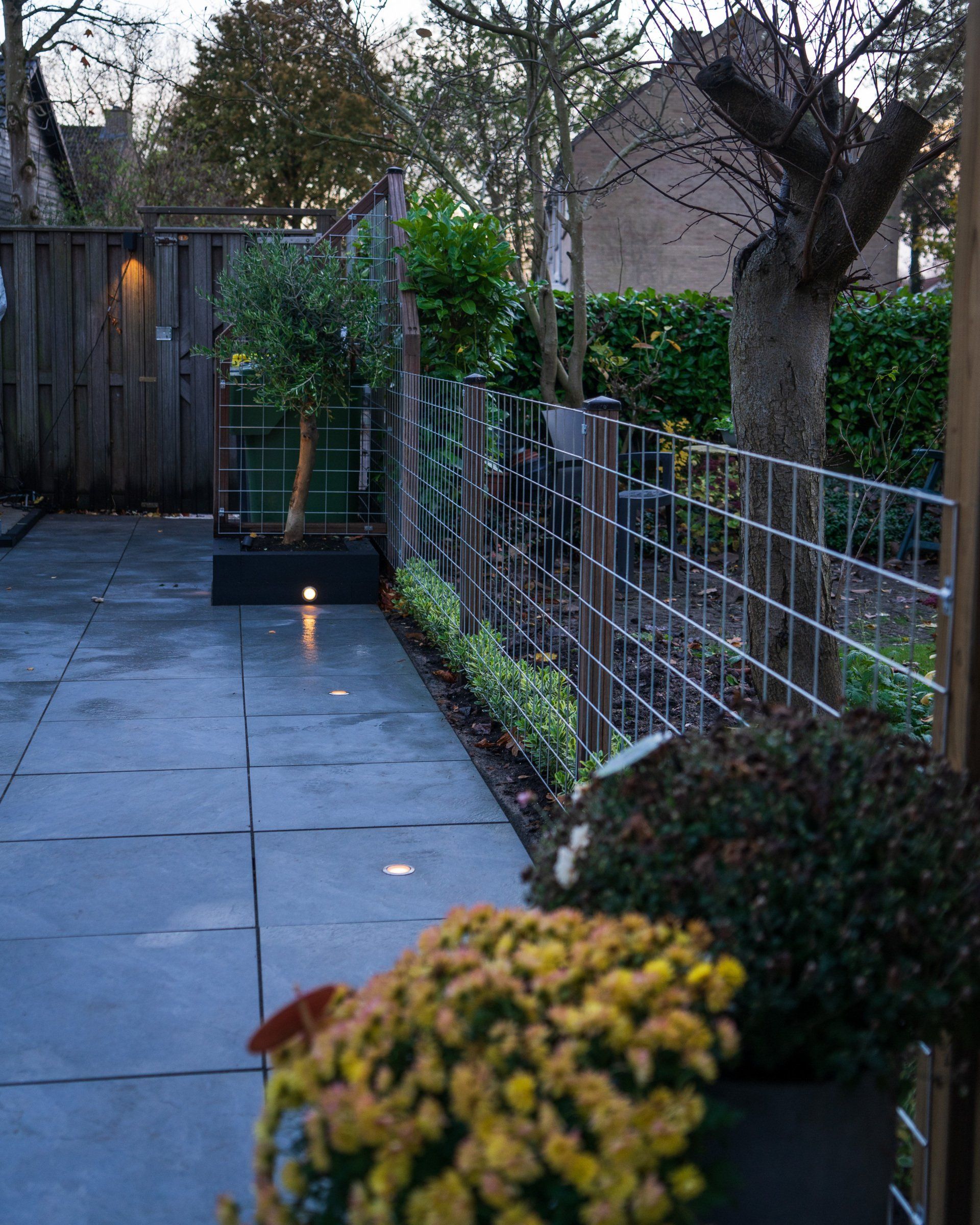 Grote tuin met keramieke tegels, gevoegd gelegd, opkomend onkruid behoort tot het verleden. De verlichting in de tegels als in de linea verhoogde bloembakken maakt dat de tuin in alle seizoenen een mooi sfeerbeeld geeft. Lage schutting van trellis met hardhouten palen en onderhoudsvrij (kunst)gras.