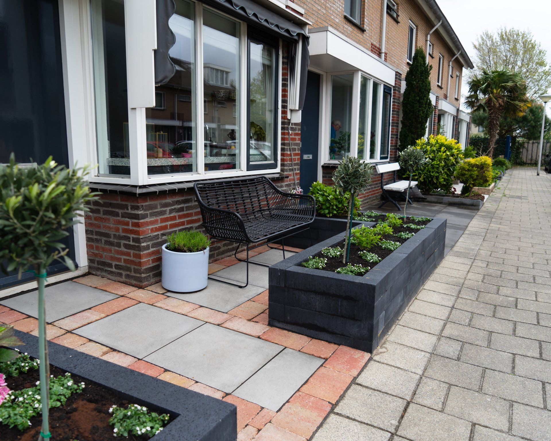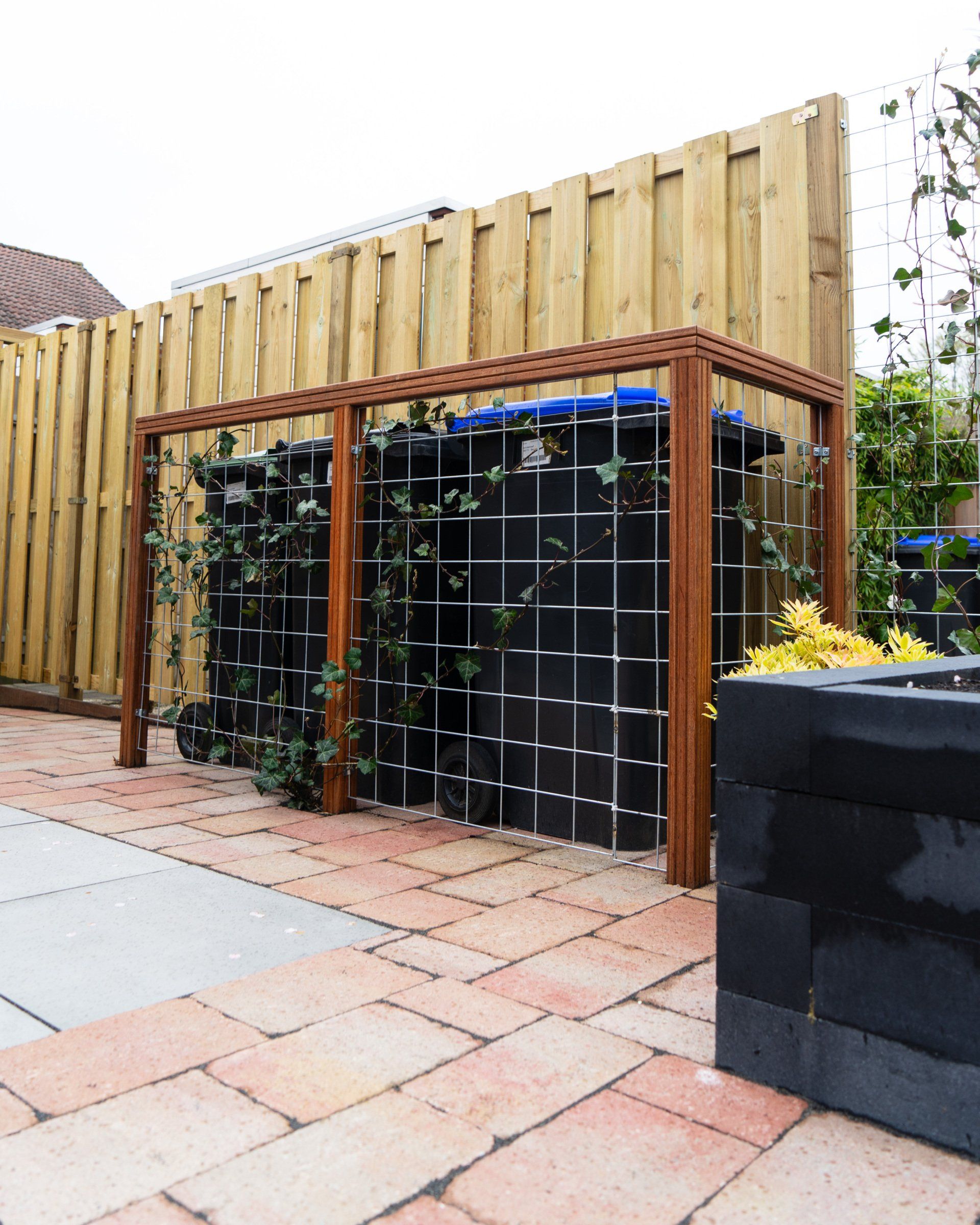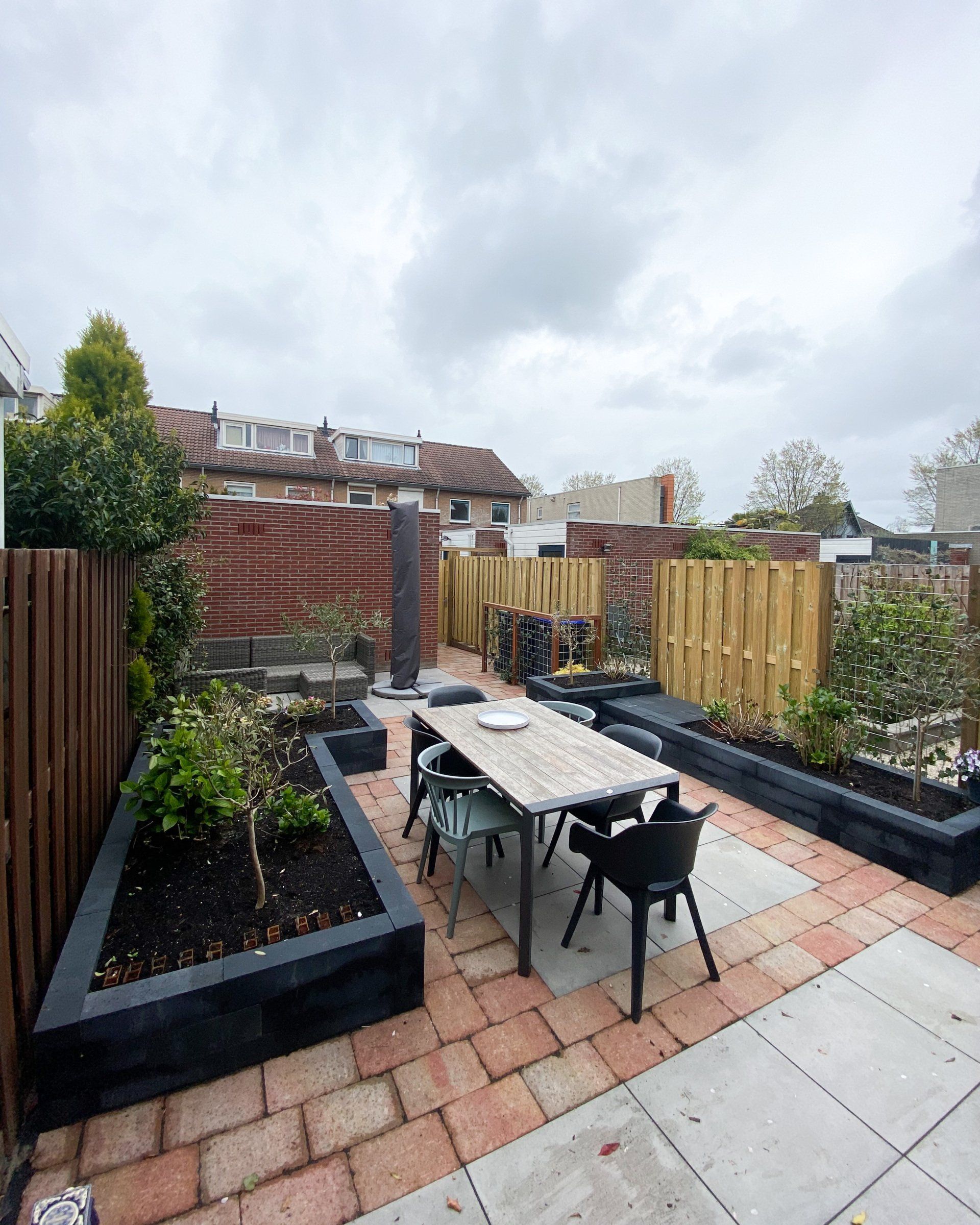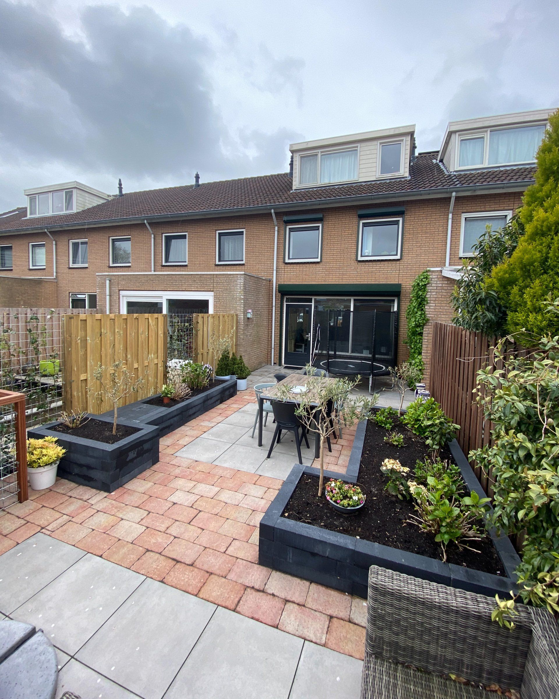 Keramiek tegels gecombineerd met Toscaanse bestrating geeft een prachtig resultaat, in combinatie met antraciet linea blokken. Schutting en een poort, tevens een trellis begroeit met klimop, de beplanting maakt het geheel mooi af.