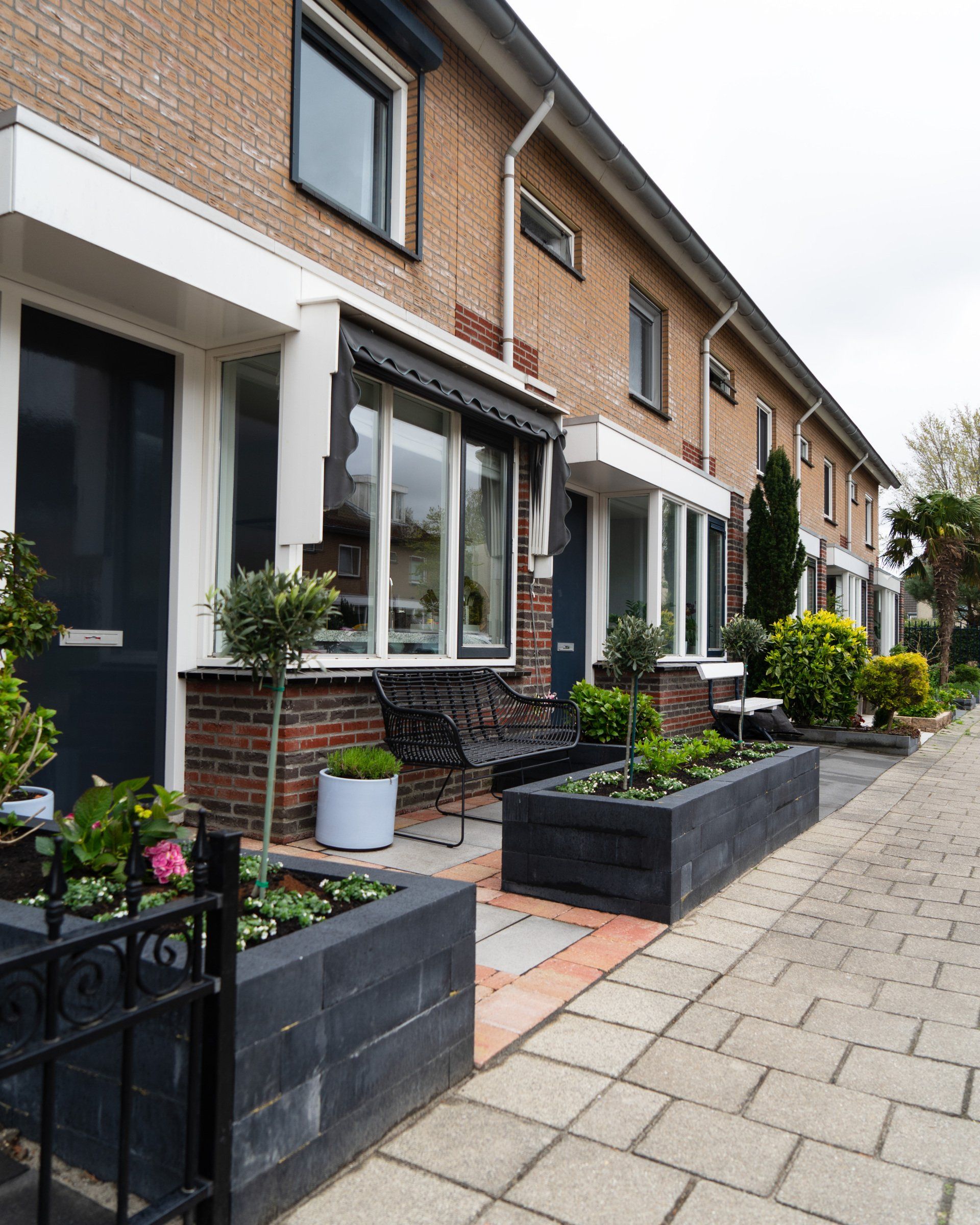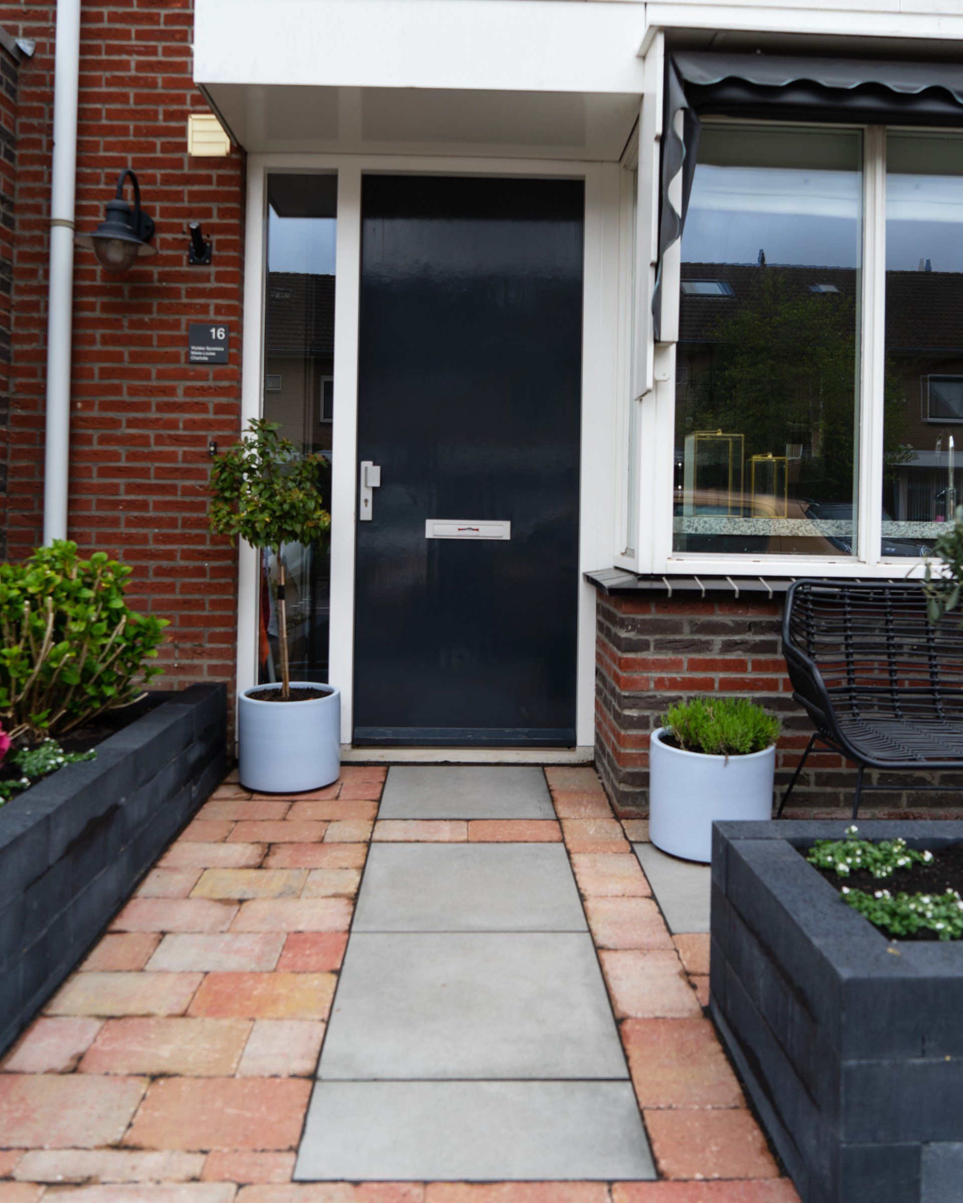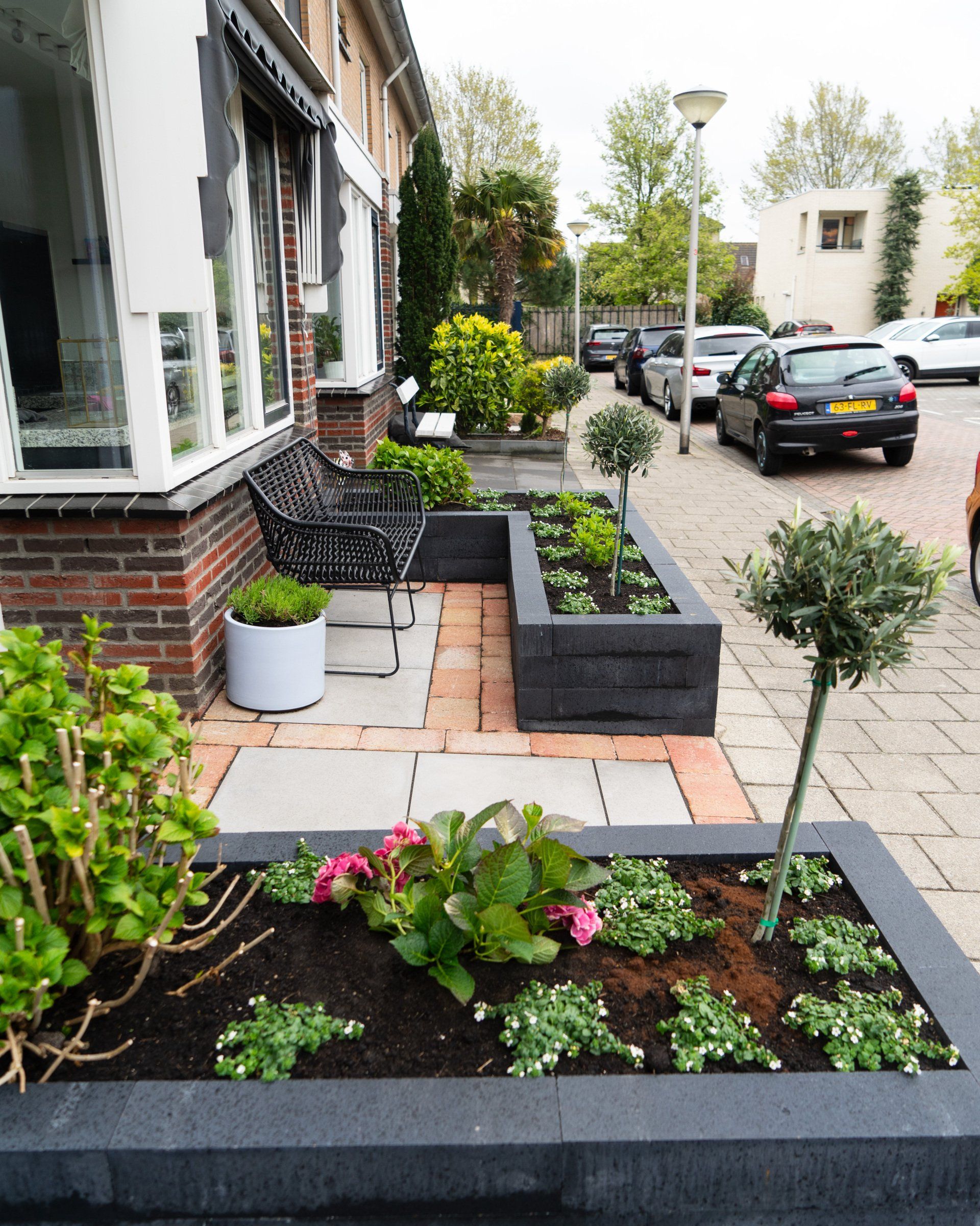 Keramiek tegels gecombineerd met Toscaanse bestrating geeft een prachtig resultaat, in combinatie met antraciet linea blokken. Schutting en een poort, tevens een trellis begroeit met klimop, de beplanting maakt het geheel mooi af.