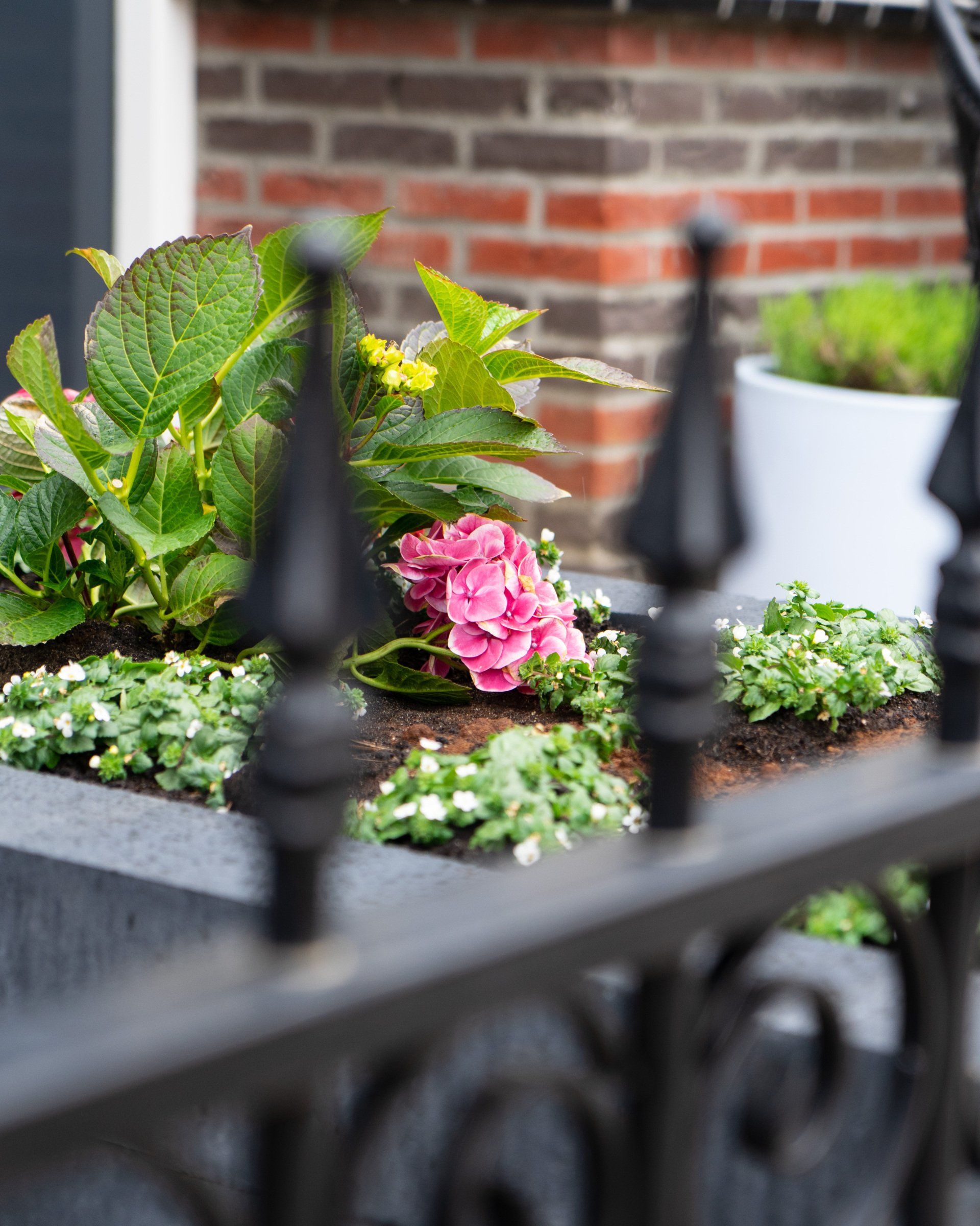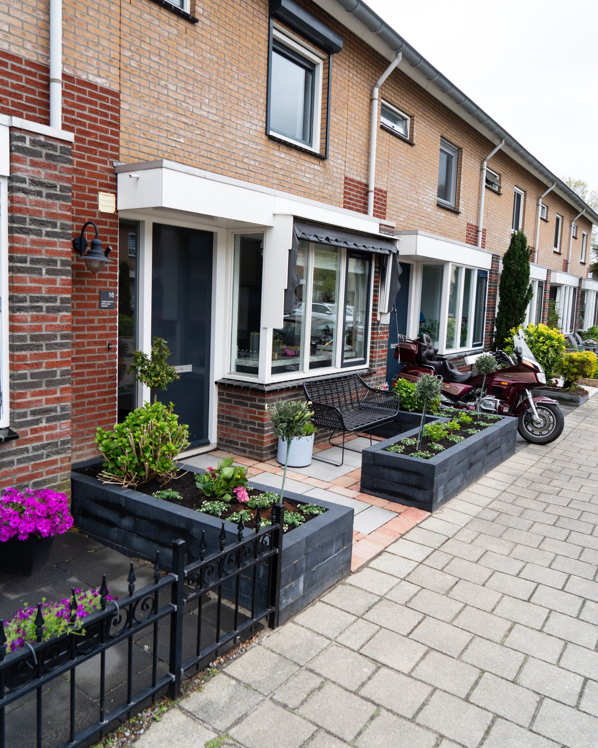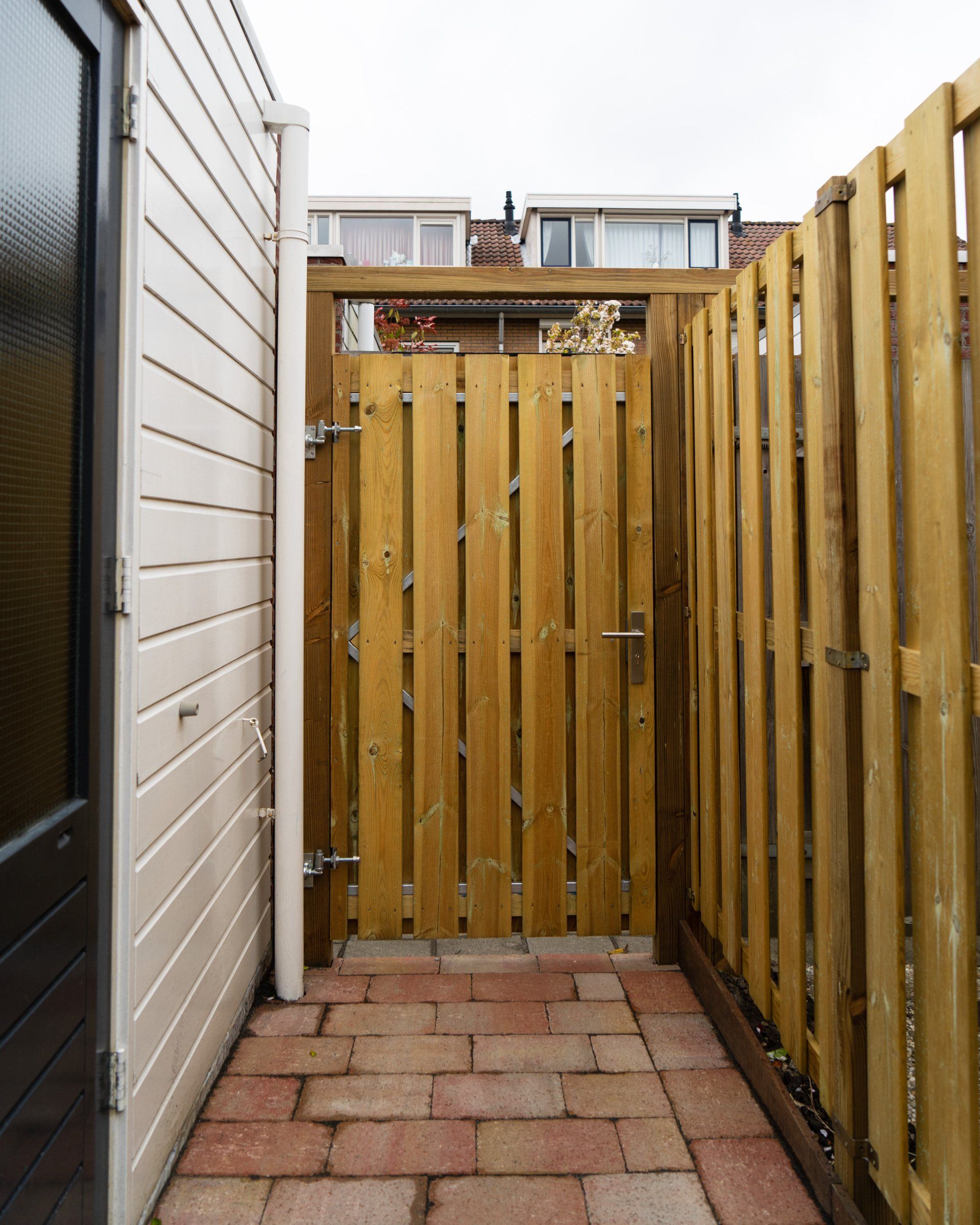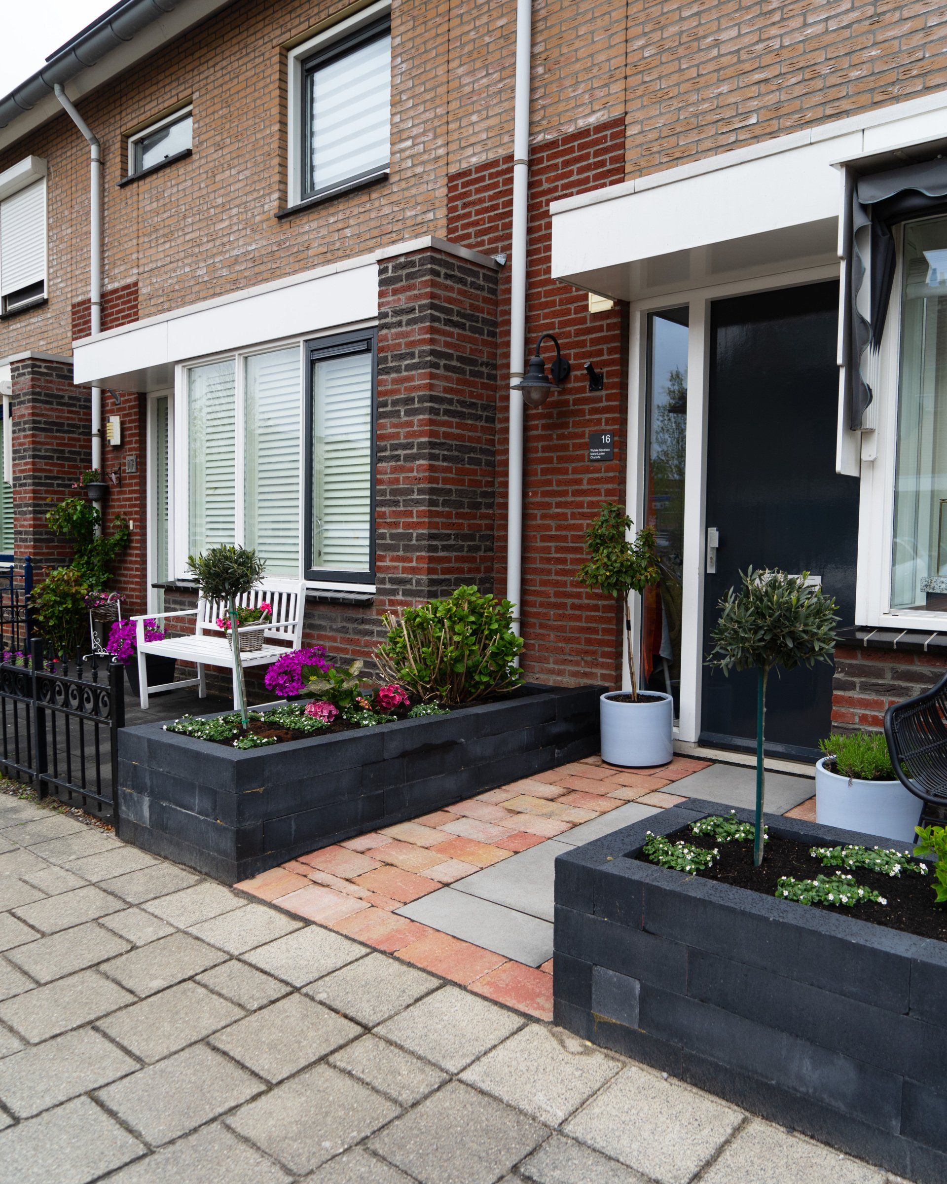 Keramiek tegels gecombineerd met Toscaanse bestrating geeft een prachtig resultaat, in combinatie met antraciet linea blokken. Schutting en een poort, tevens een trellis begroeit met klimop, de beplanting maakt het geheel mooi af.