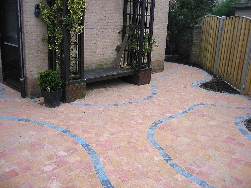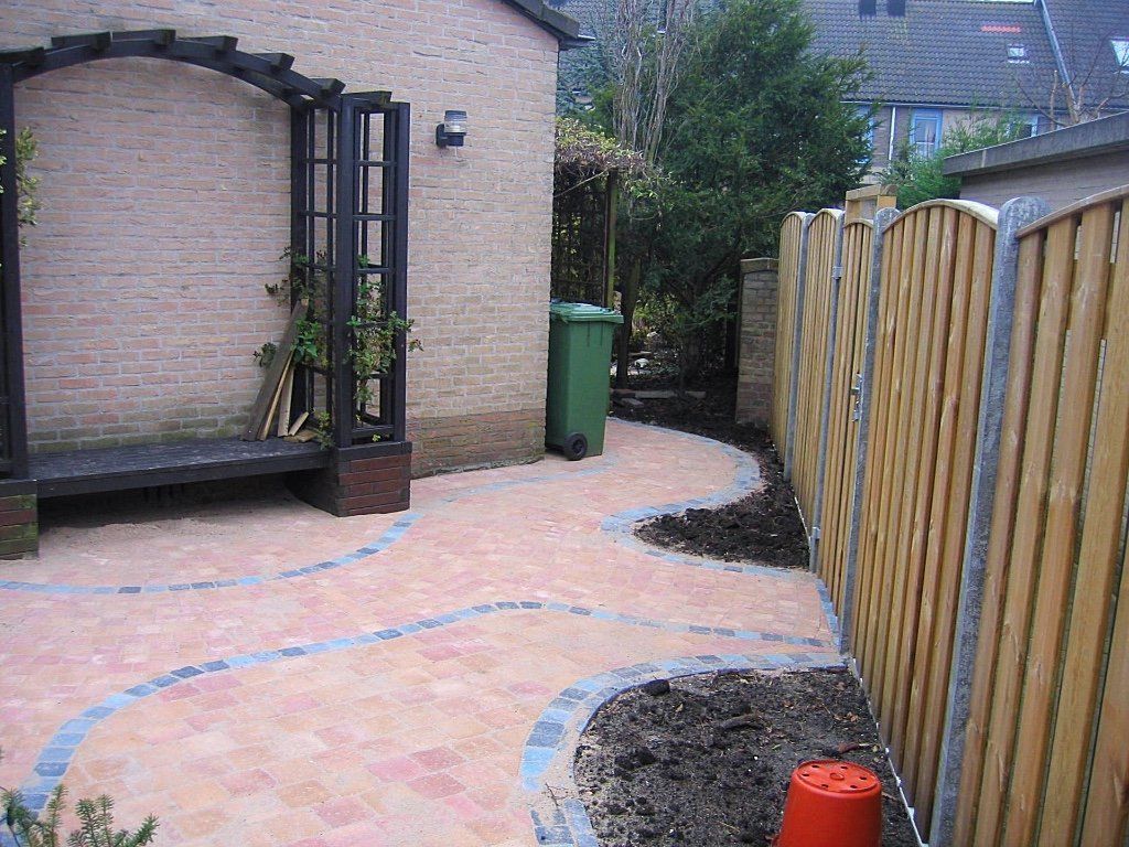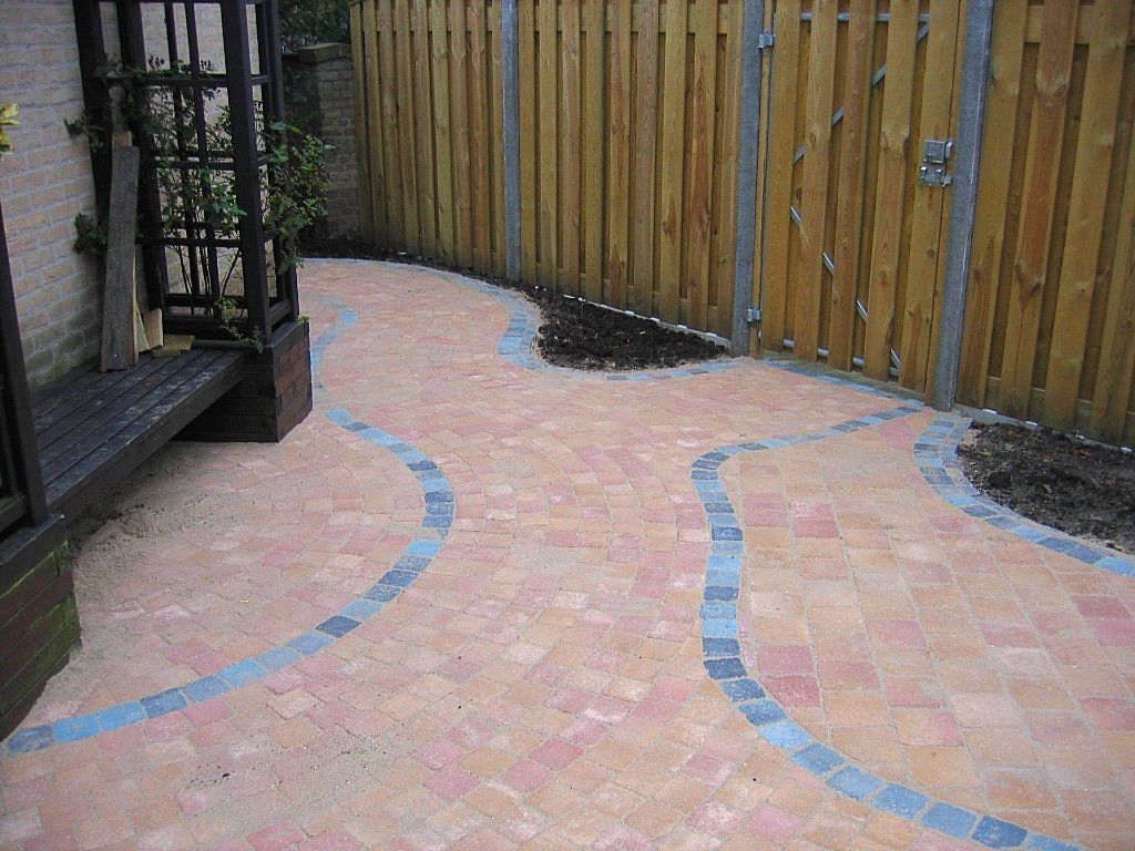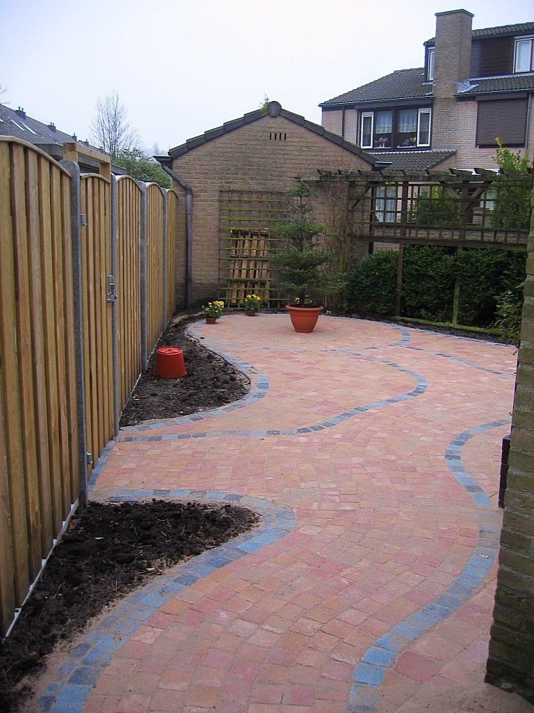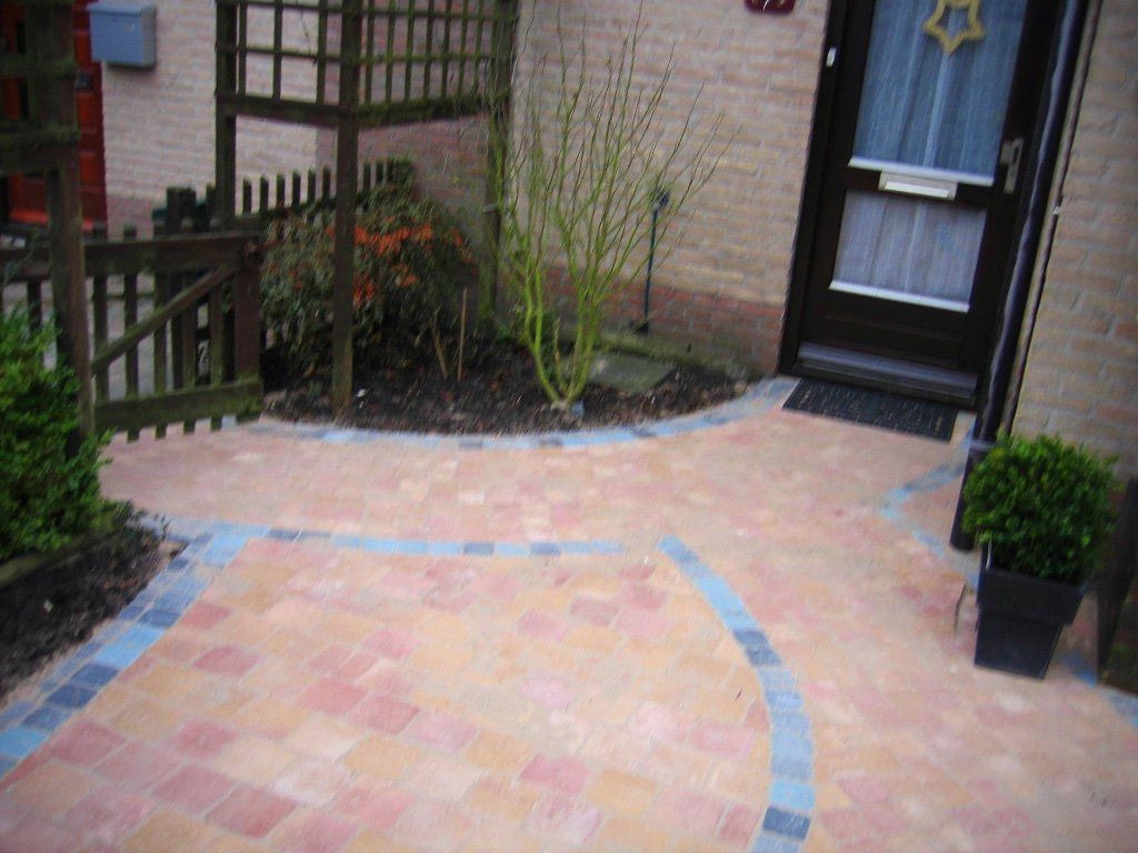 Een doorlopende voor,-zij,-en achtertuin met een pad afgezet met blauw gemixte stenen.