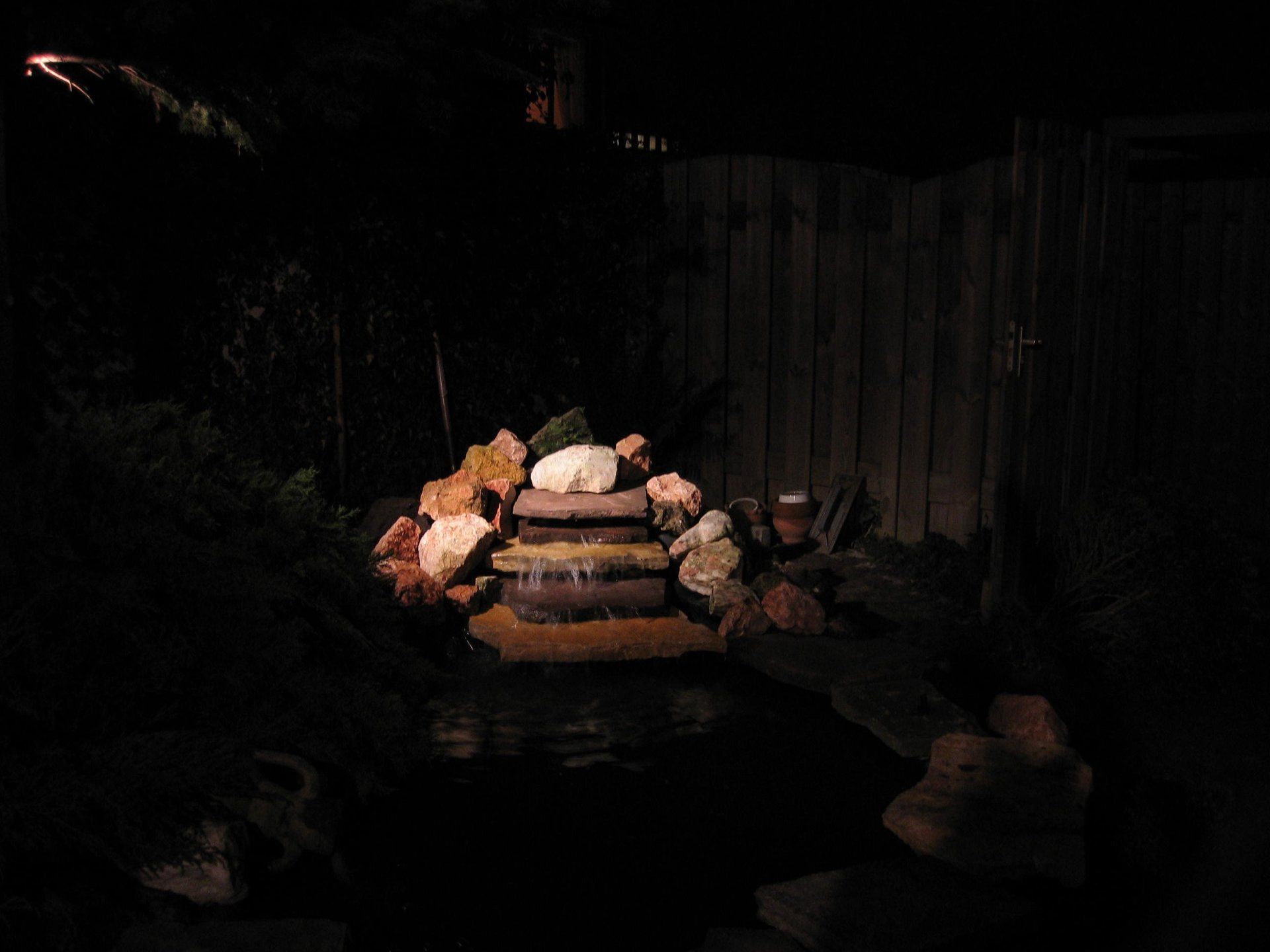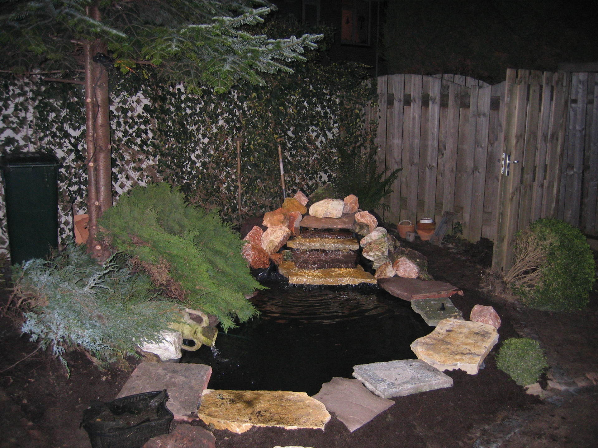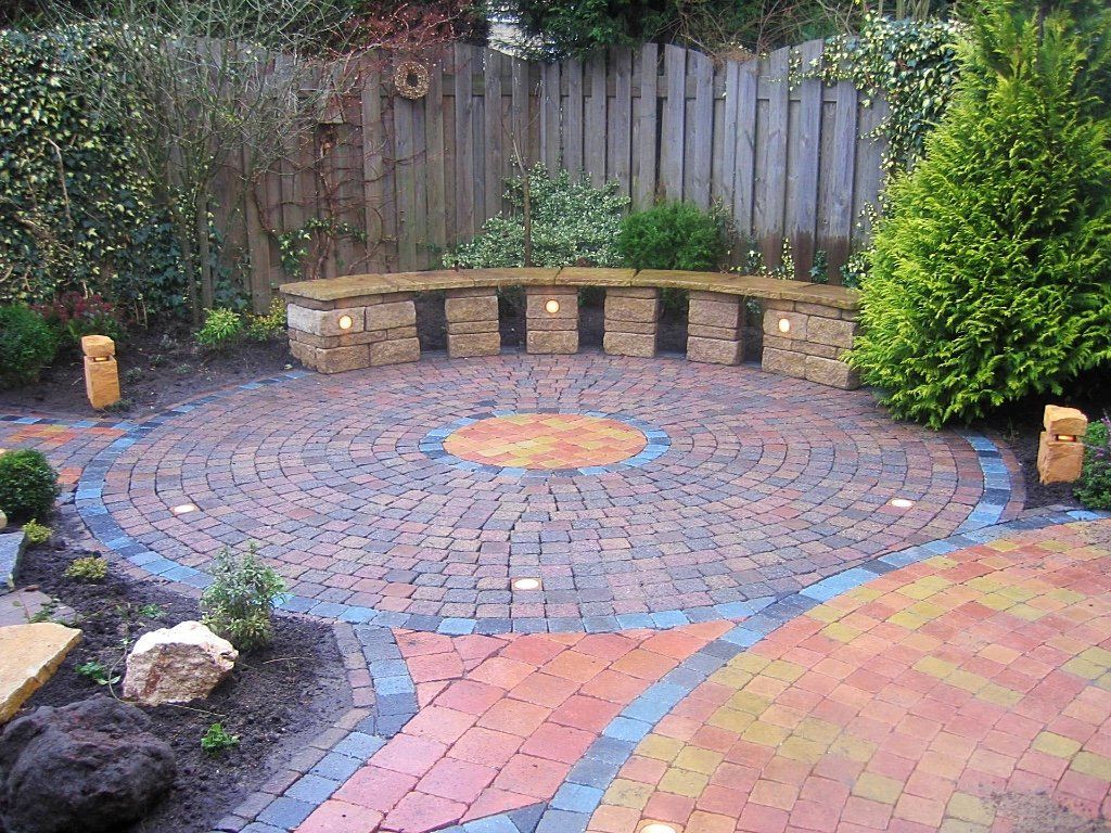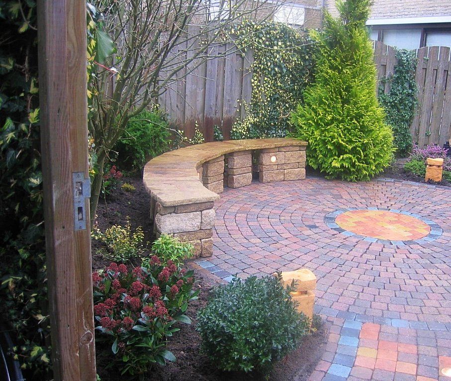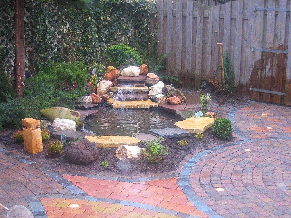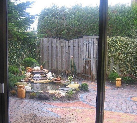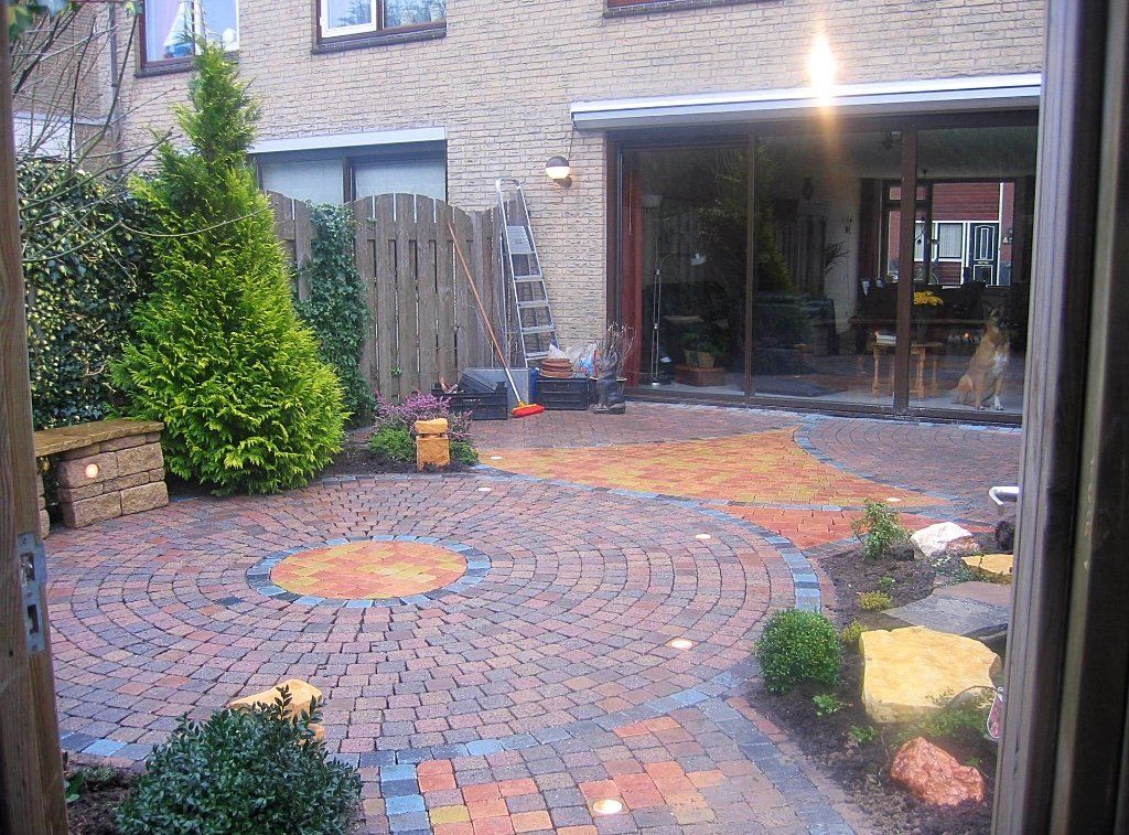 Complete tuin met kleurrijke bestrating in cirkels gelegd met verbindingstukken, bankjes met verlichting en een mooie vijver met een waterval. Ook in de bestrating zit verlichting en verlichtingsornamenten in de borders.