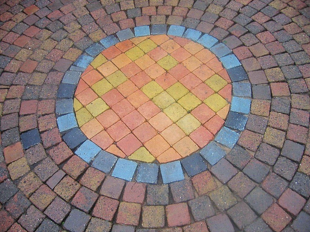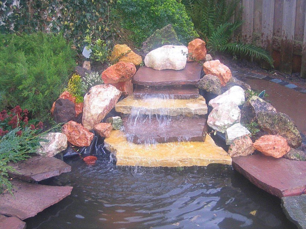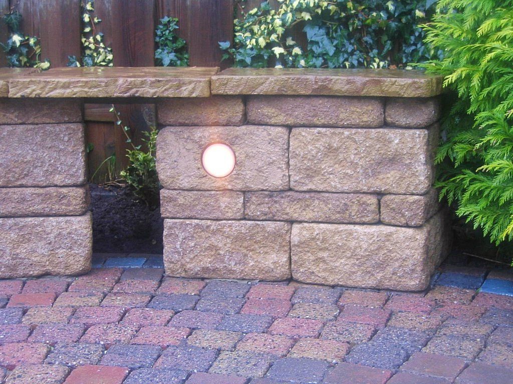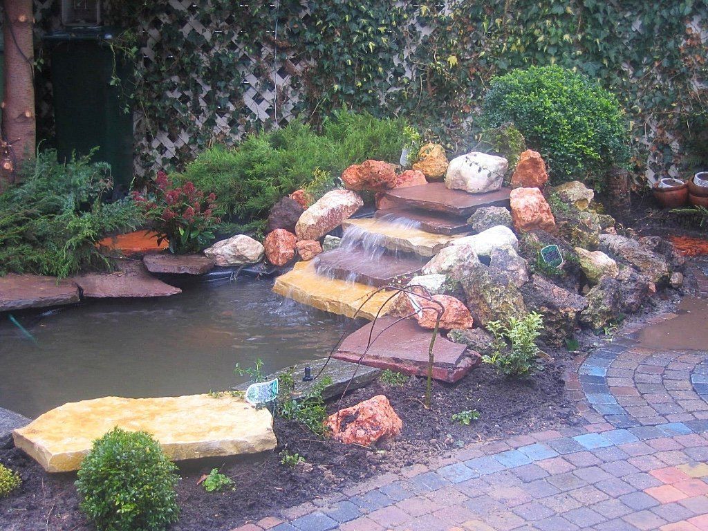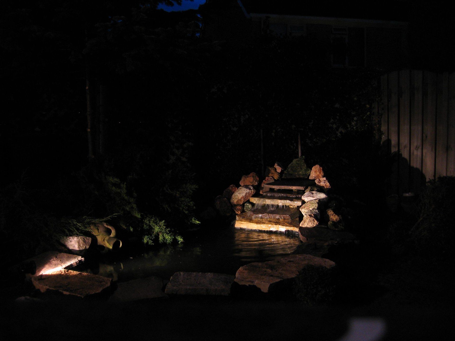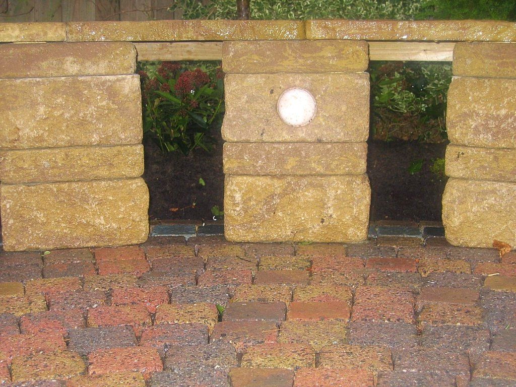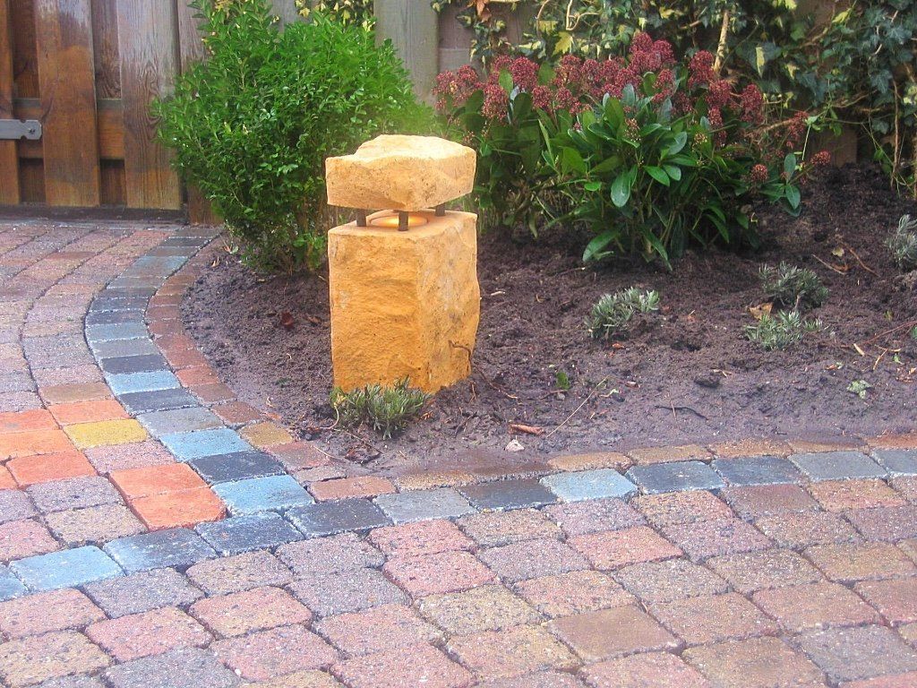 Complete tuin met kleurrijke bestrating in cirkels gelegd met verbindingstukken, bankjes met verlichting en een mooie vijver met een waterval. Ook in de bestrating zit verlichting en verlichtingsornamenten in de borders.