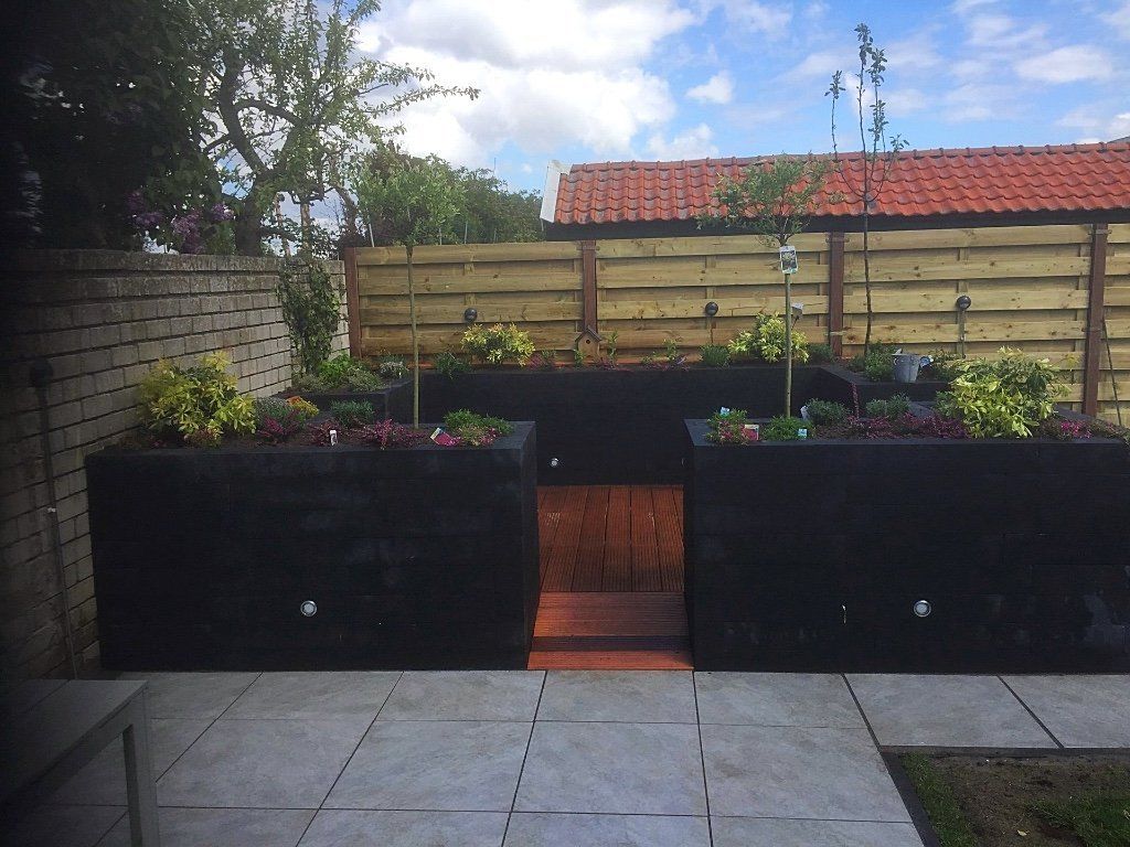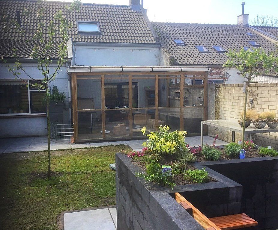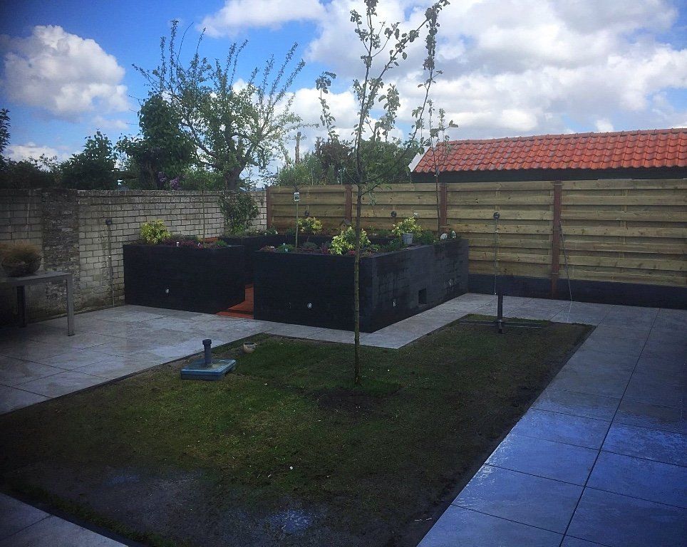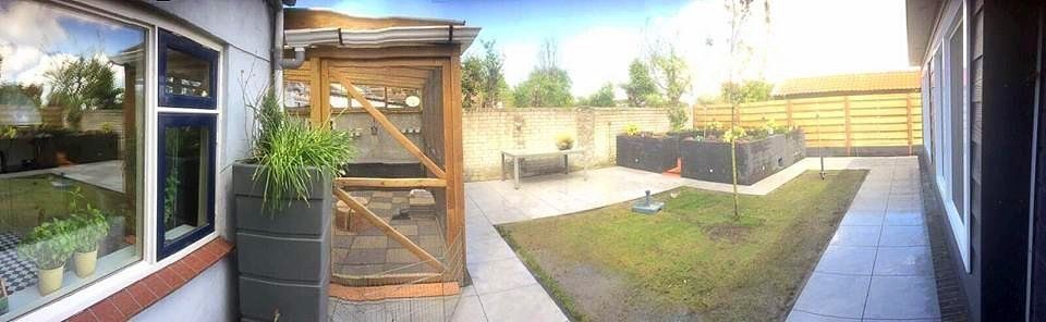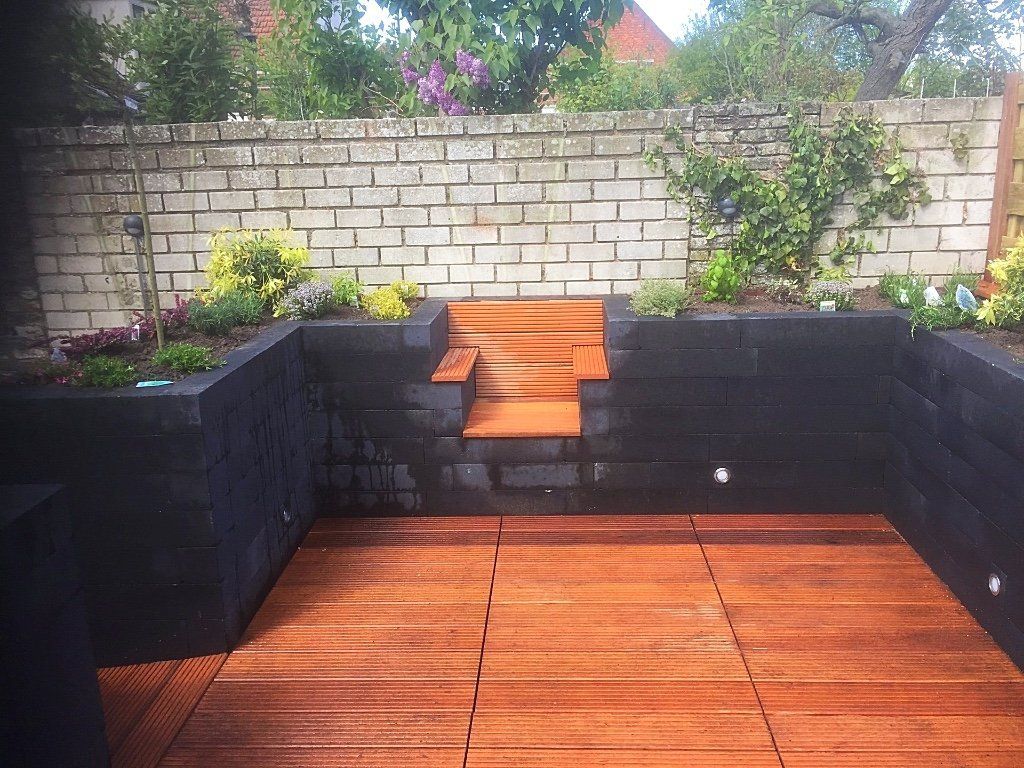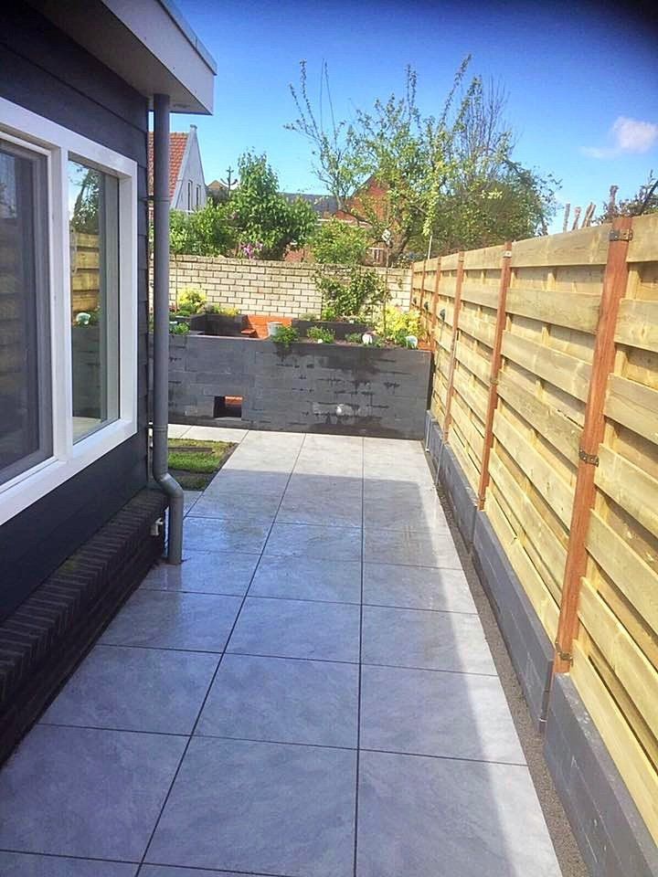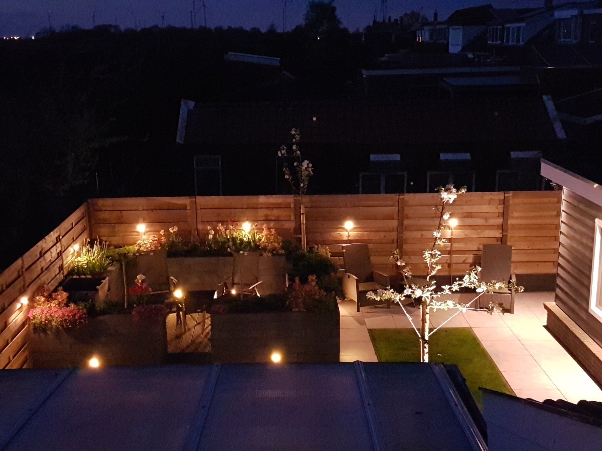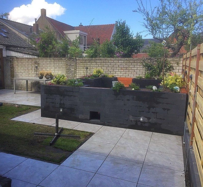 Gave tuin met veel details voor de konijnen. Overkapping met gaas, bankjes en verhoogde linea-bloembakken met doorloopjes voor de konijnen. Keramiek bestrating, gevoegd gelegd dus geen onkruid tussen de tegels. Schutting met lineablokken eronder. Vlonder en bankjes van hardhout. En natuurlijk verlichting en mooie beplanting.