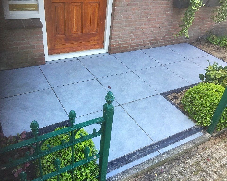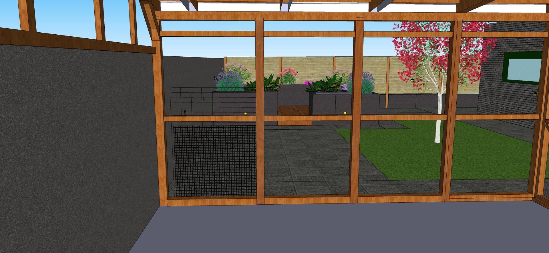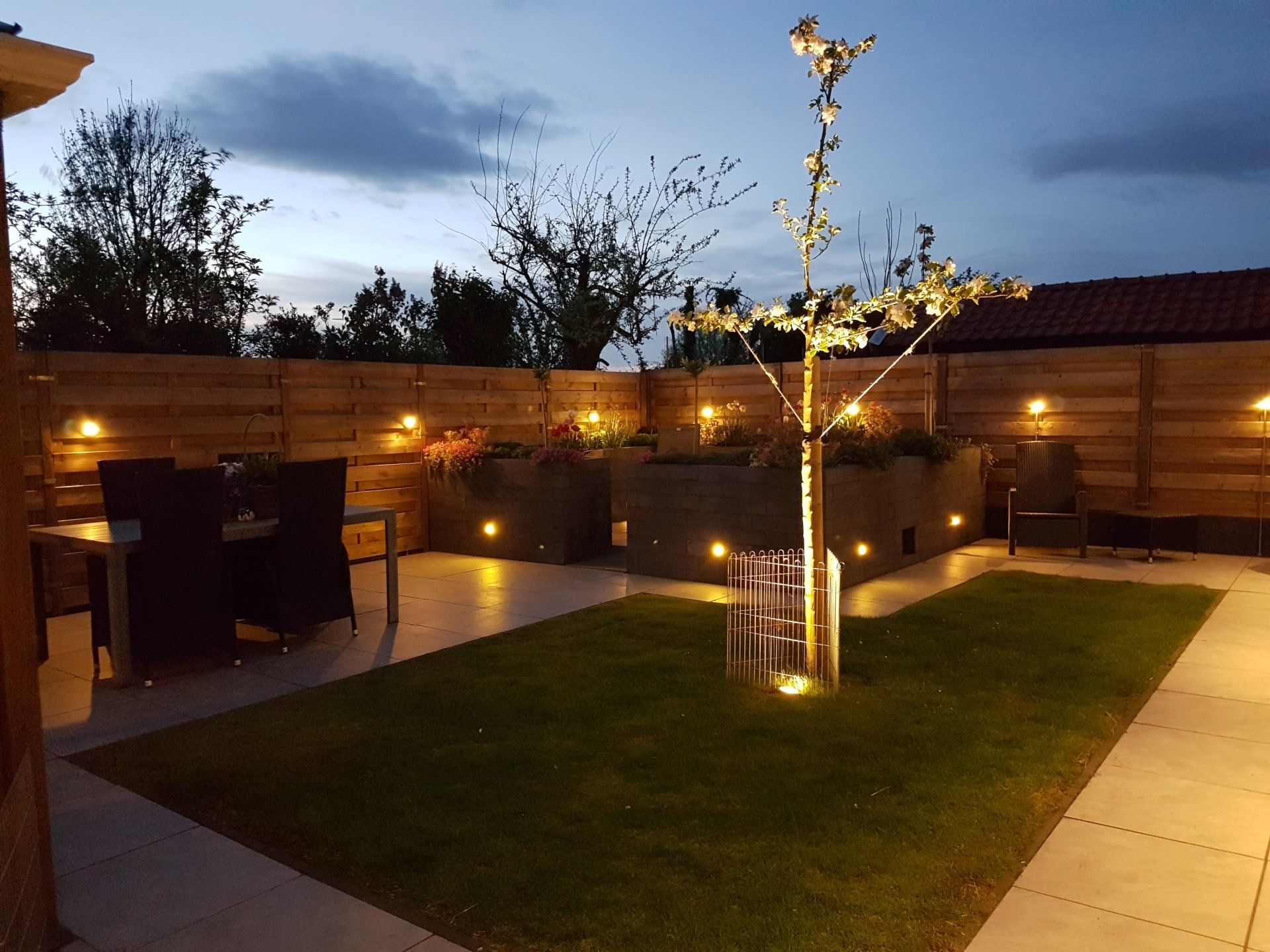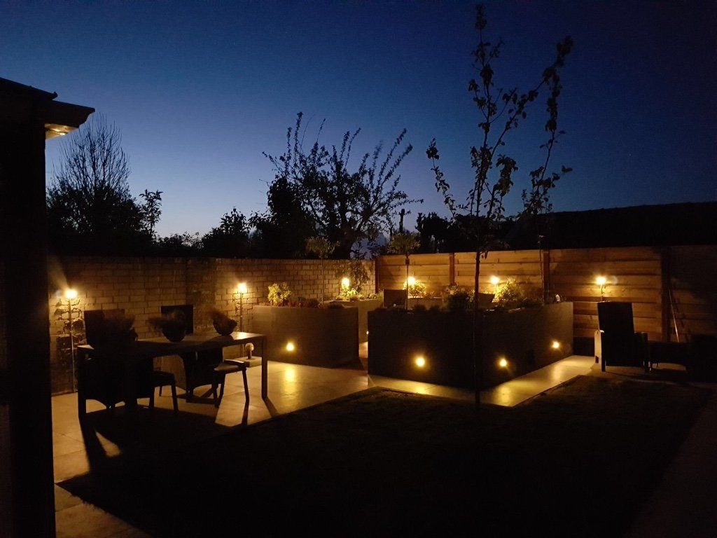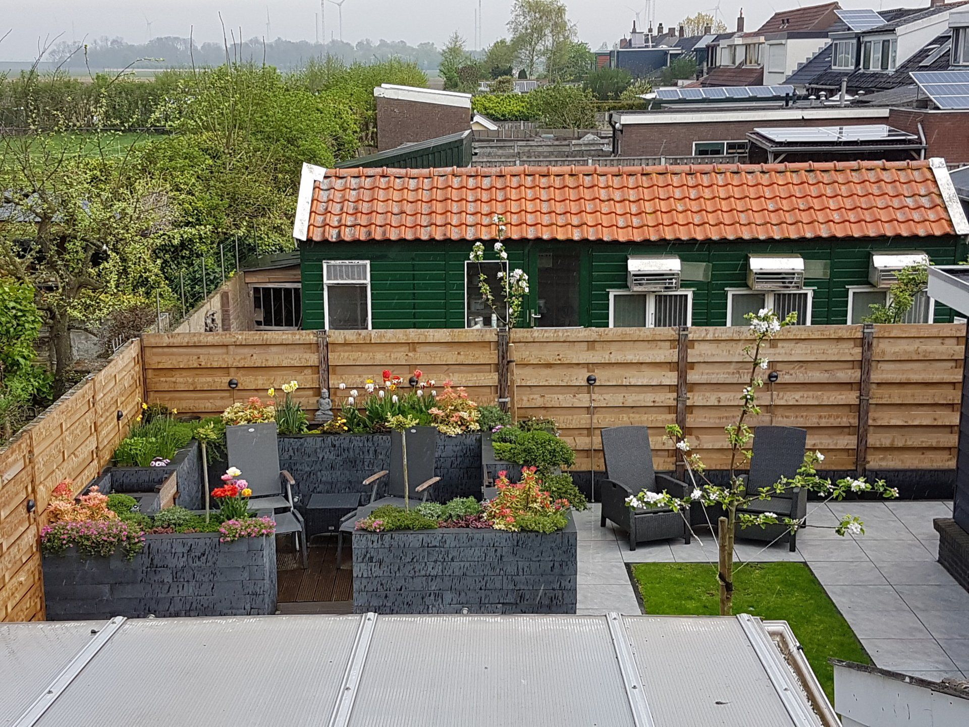 Gave tuin met veel details voor de konijnen. Overkapping met gaas, bankjes en verhoogde linea-bloembakken met doorloopjes voor de konijnen. Keramiek bestrating, gevoegd gelegd dus geen onkruid tussen de tegels. Schutting met lineablokken eronder. Vlonder en bankjes van hardhout. En natuurlijk verlichting en mooie beplanting.