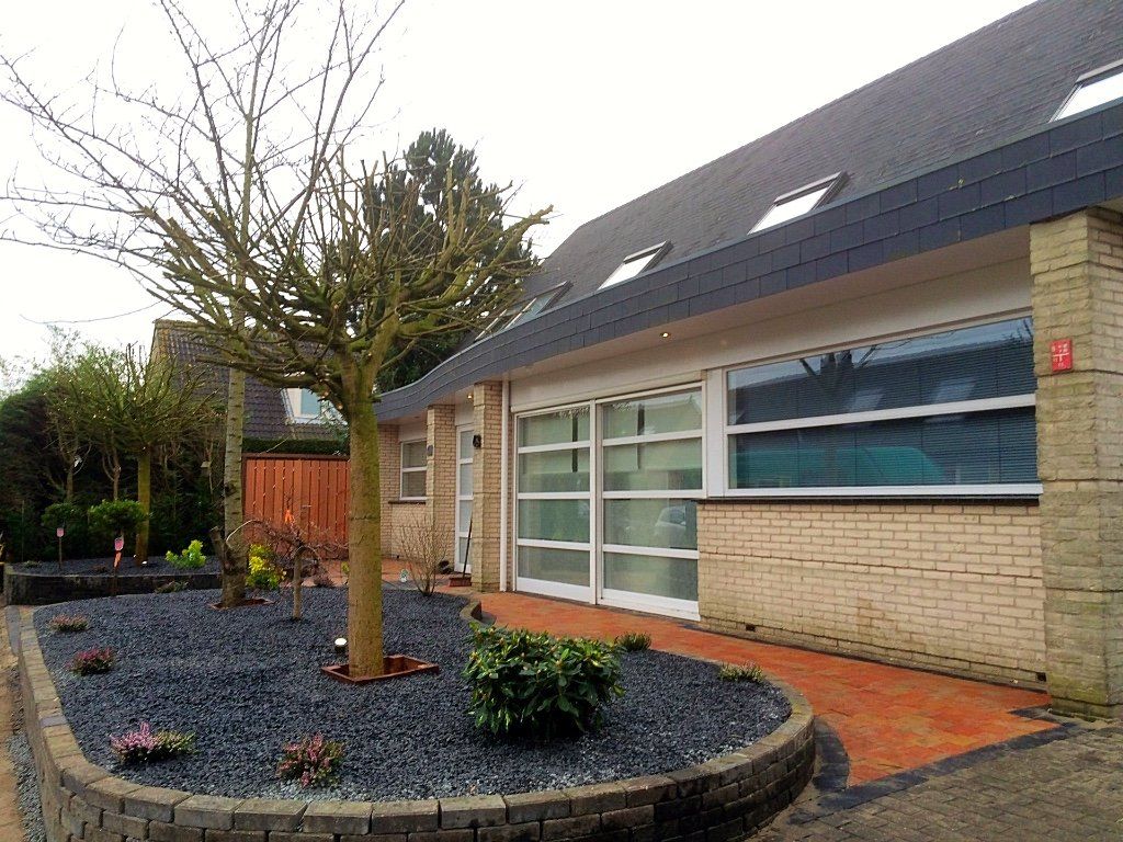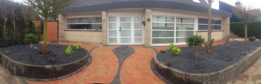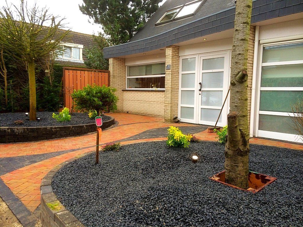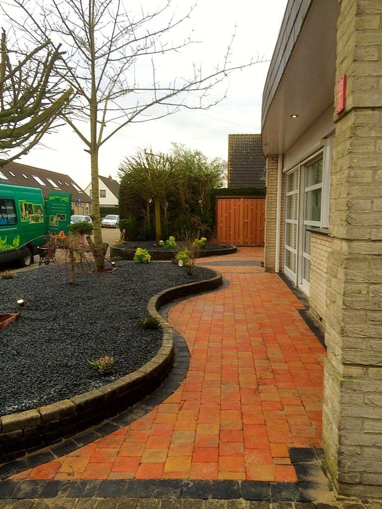Kleurrijke bestrating afgewerkt met band van zwarte stenen. De oude bestrating is voor de verhoogde bloembakken gebruikt. De bloembakken zijn afgewerkt met anti-worteldoek en antraciet split. De mooie beplanting en verlichting maakt het geheel af.