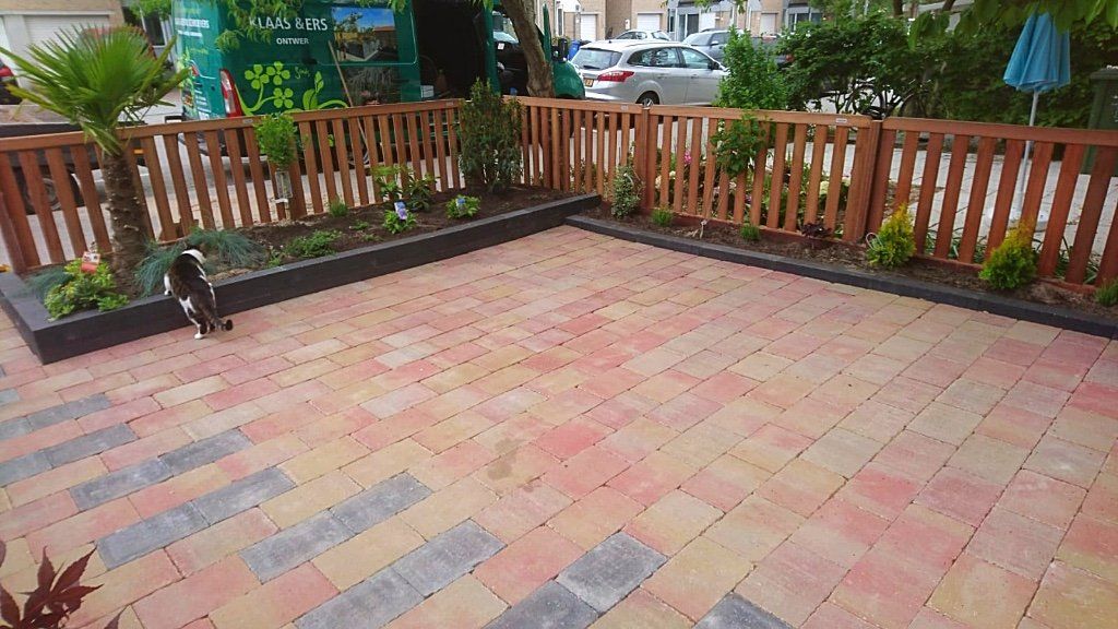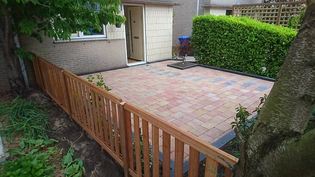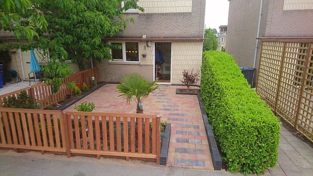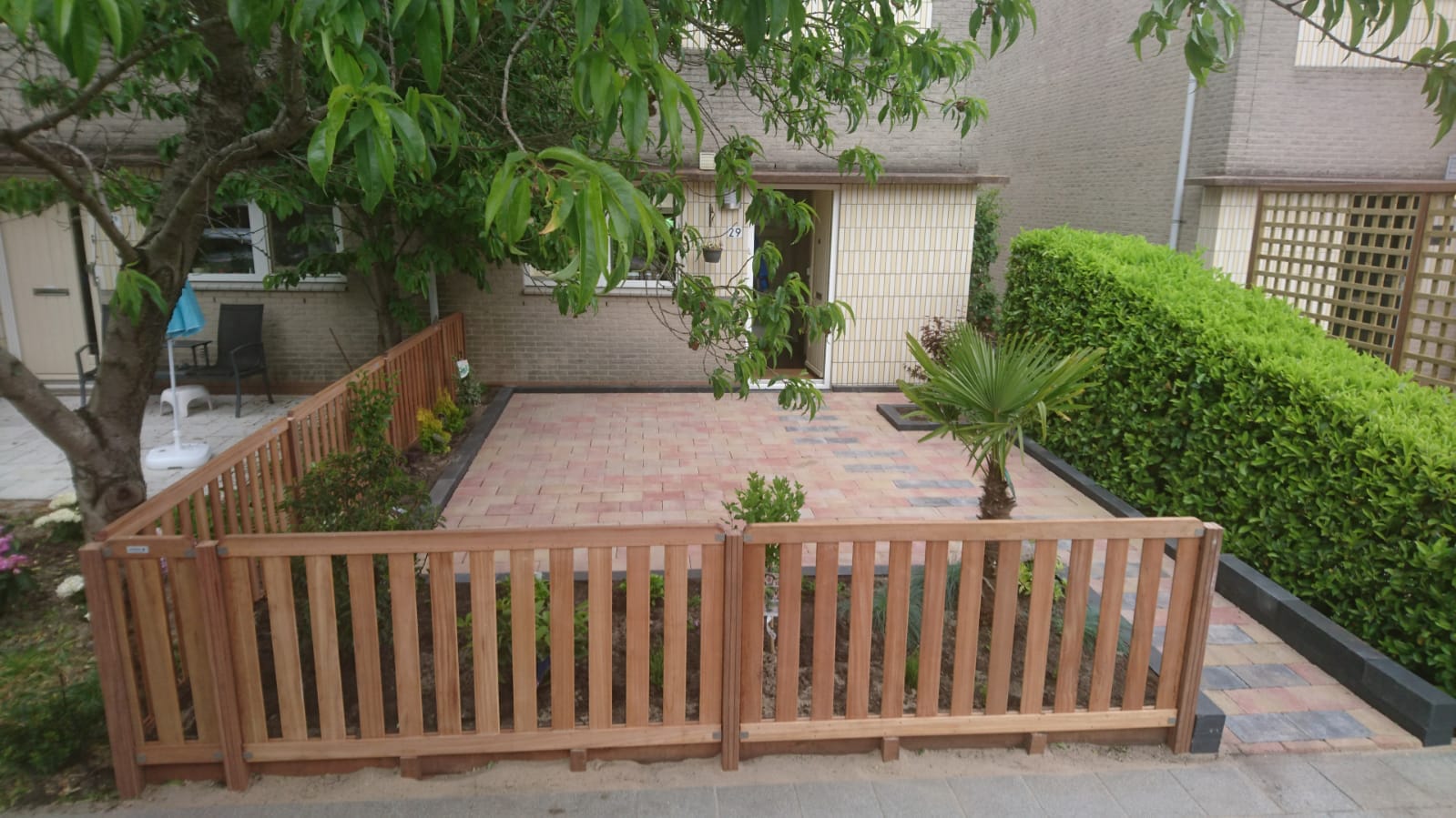 Een kleurige voortuin met linea bloembakken en een leuke hardhouten schutting. De mooie beplanting maakt de tuin helemaal af!