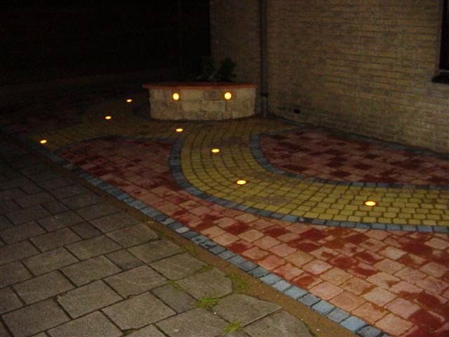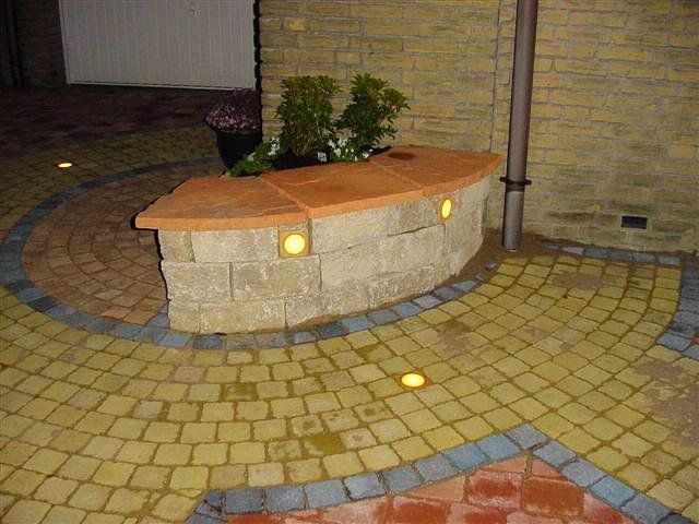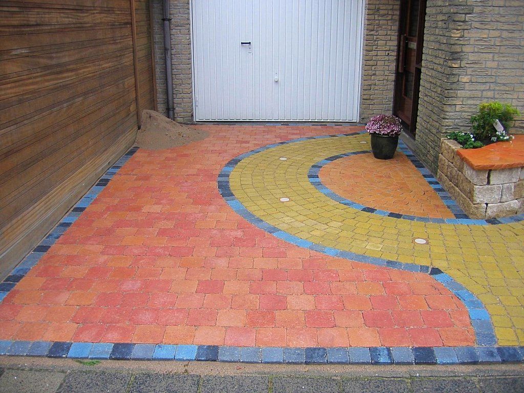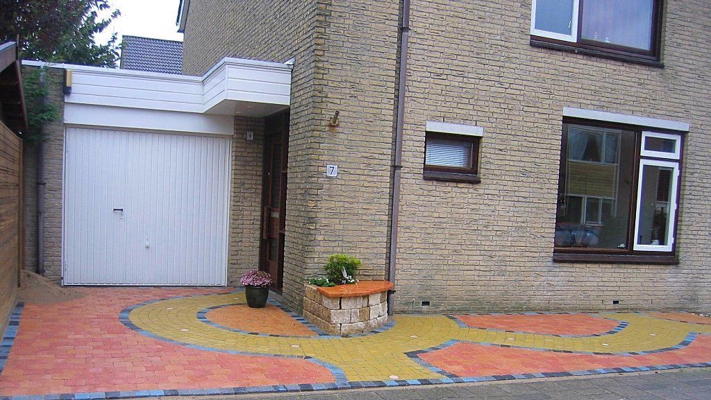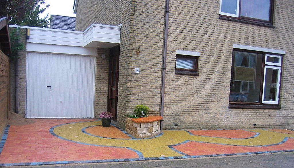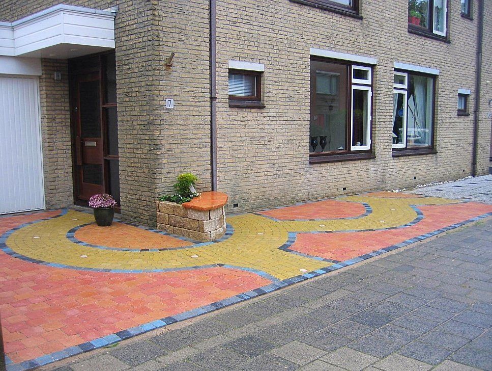 Leuke voortuin en oprit met verlichting in de bestrating en in de verhoogde border met bankje. Het gebruik van verschillende stenen en vormen maakt deze tuin een blikvanger.